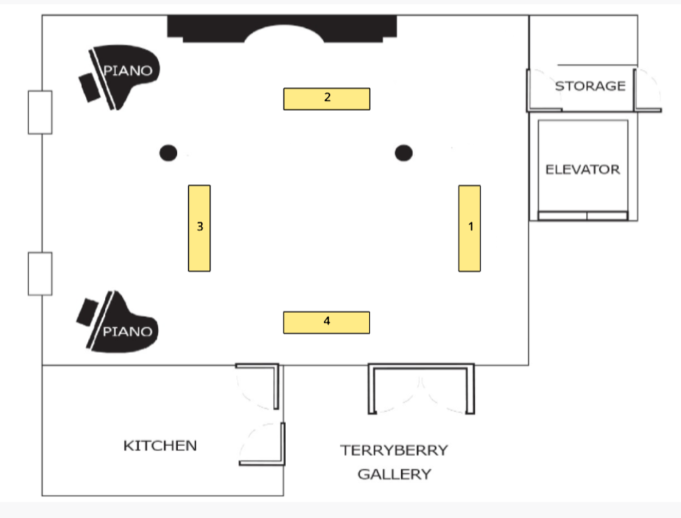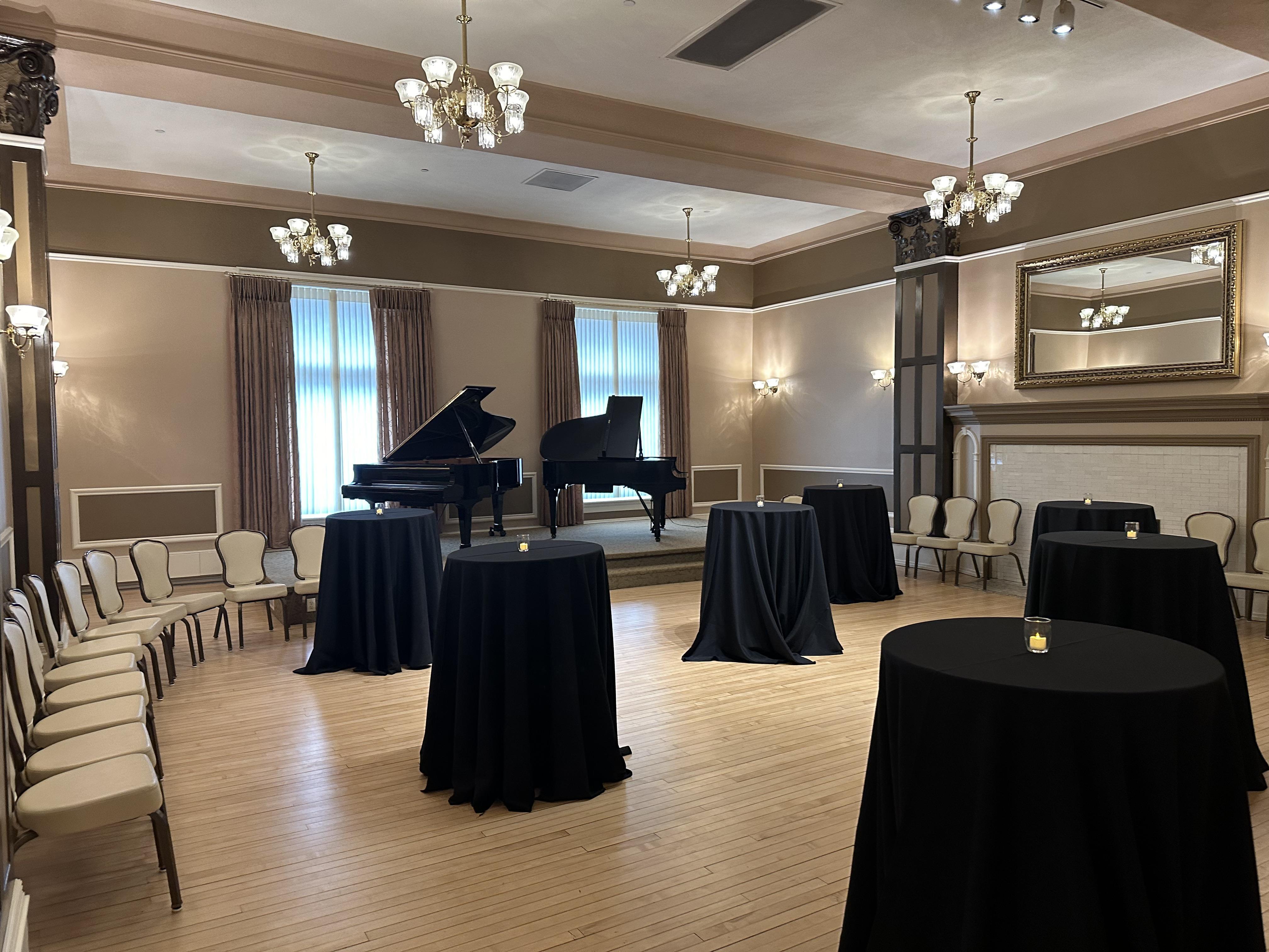Platform Stage Two Steinway Grand Pianos Beautiful Refinished Wood Flooring Audio/Visual System Full Catering Kitchen Two Private Restrooms Elevator Access Tables and chairs Projector Microphone