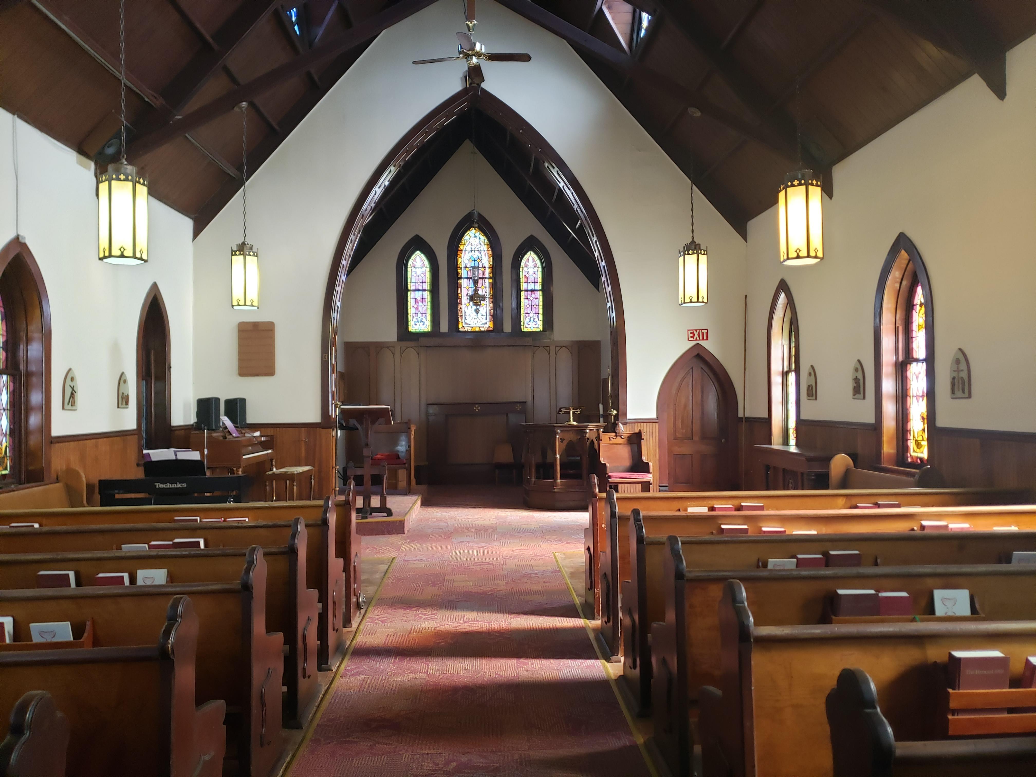 Pews, additional chairs as needed, gorgeous stained glass windows throughout