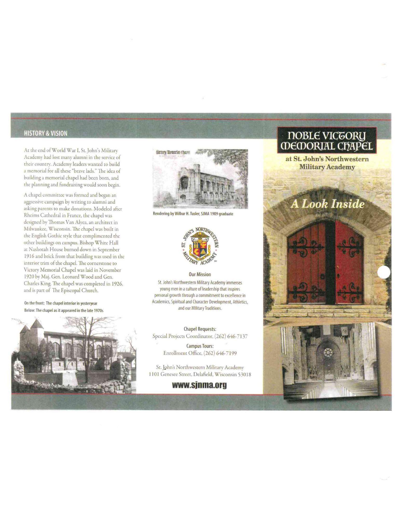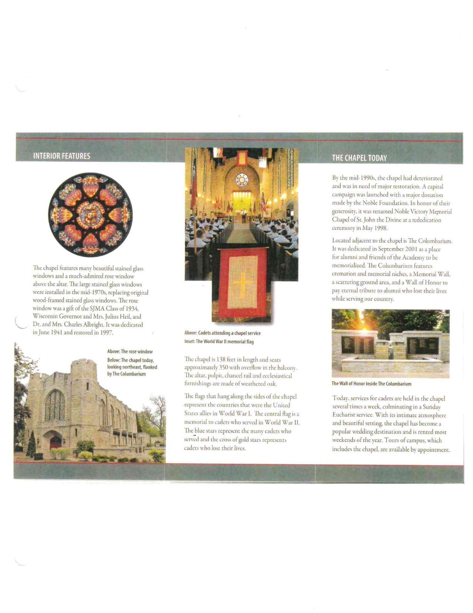 The Noble Victory Memorial Chapel was completed in 1926 and is modeled after the Rheims Cathedral in France. The chapel seats 350 with overflow in the balcony. There is a ready room on the lower level for the bride and her party. The chapel has become a popular wedding destination and is available to rent most weekends of the year.