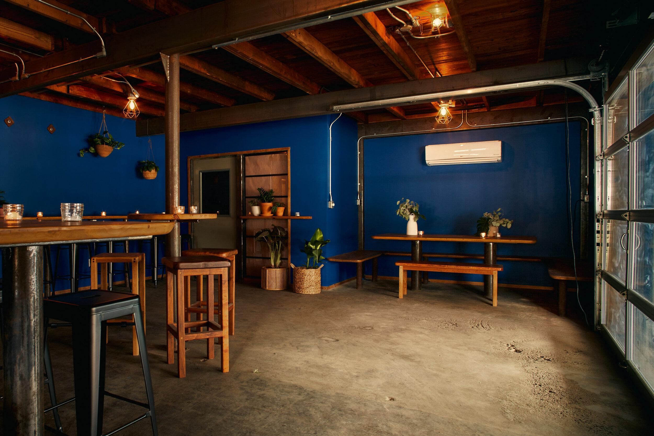 The Cantina boasts a colorful backdrop of deep blue hues and tropical plants. The room consists of an L-shaped bar counter, plus bar seating along one side wall and a community table. The bar opens up to a covered porch area, with access outside via a sliding garage door.