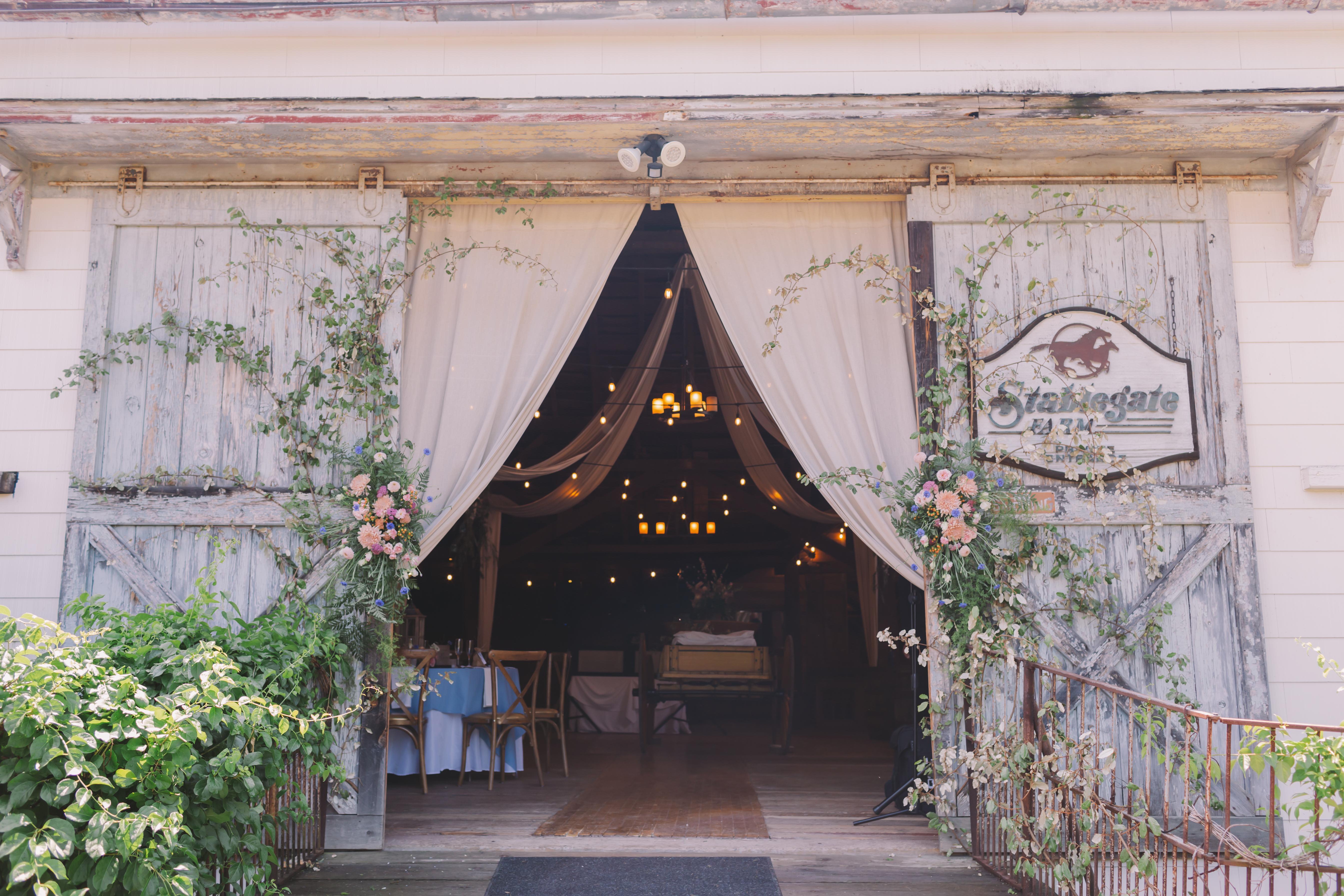 Our remarkable Stablegate Barn built in 1847 was once the home of the famous Elsie the Cow. The Dutch barn features 30-foot high ceilings, bistro lighting and antique decor, newly renovated restrooms, a late-night fire, and seating for up to 150 guests inside with additional tent options for up to 200 guests. Surrounded by grape vines, roaming horses, and star-filled skies, this venue is perfect for the couple looking for rustic charm and a venue unlike any other.