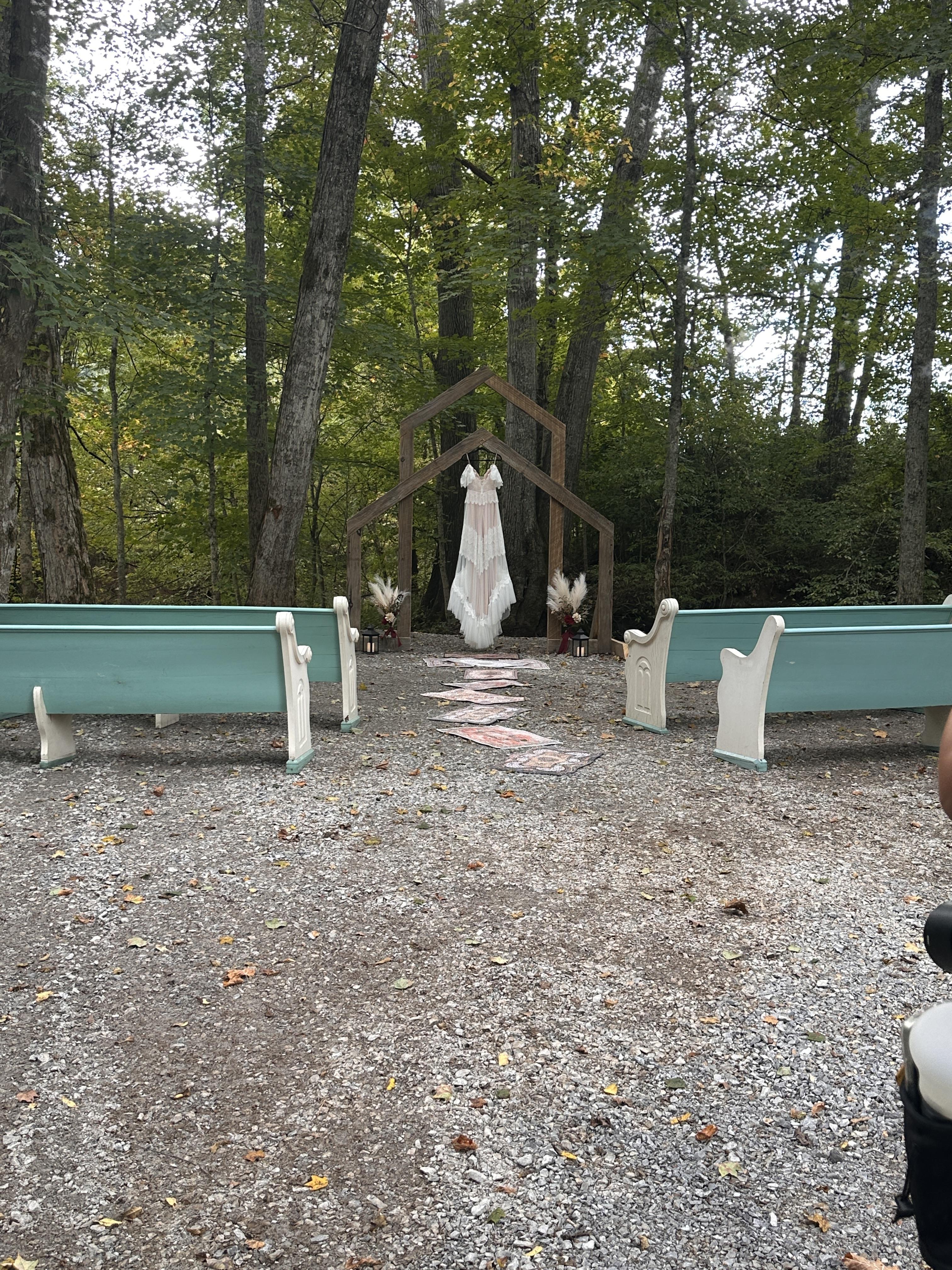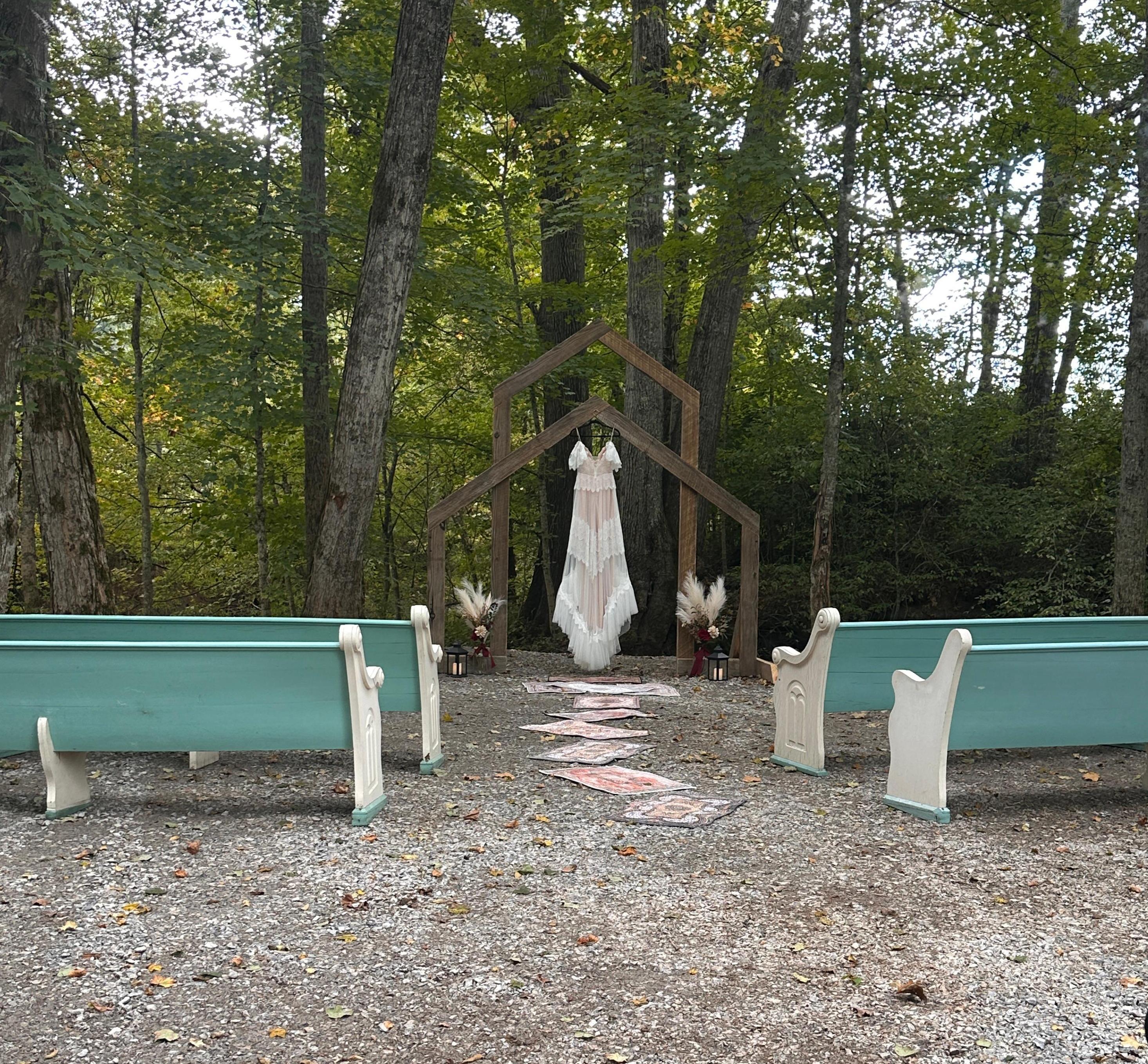 This space, known as the point, is where two lovely creeks converge. It features two wedding spots, one with an altar and another inside a ring of trees. It also features a spectacular spot for photos on a hand hewn log deck that overhangs the creek. We provide 1940's antique church pews for your guests.