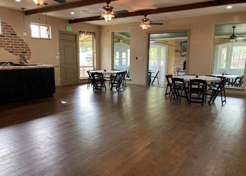 Equipped with a fully stocked kitchen, two large bathrooms, and a large wet bar for serving, this space includes beautiful wood floors, beamed ceilings, and lots of windows. Tables and chairs are included and can be set up to meet your needs.