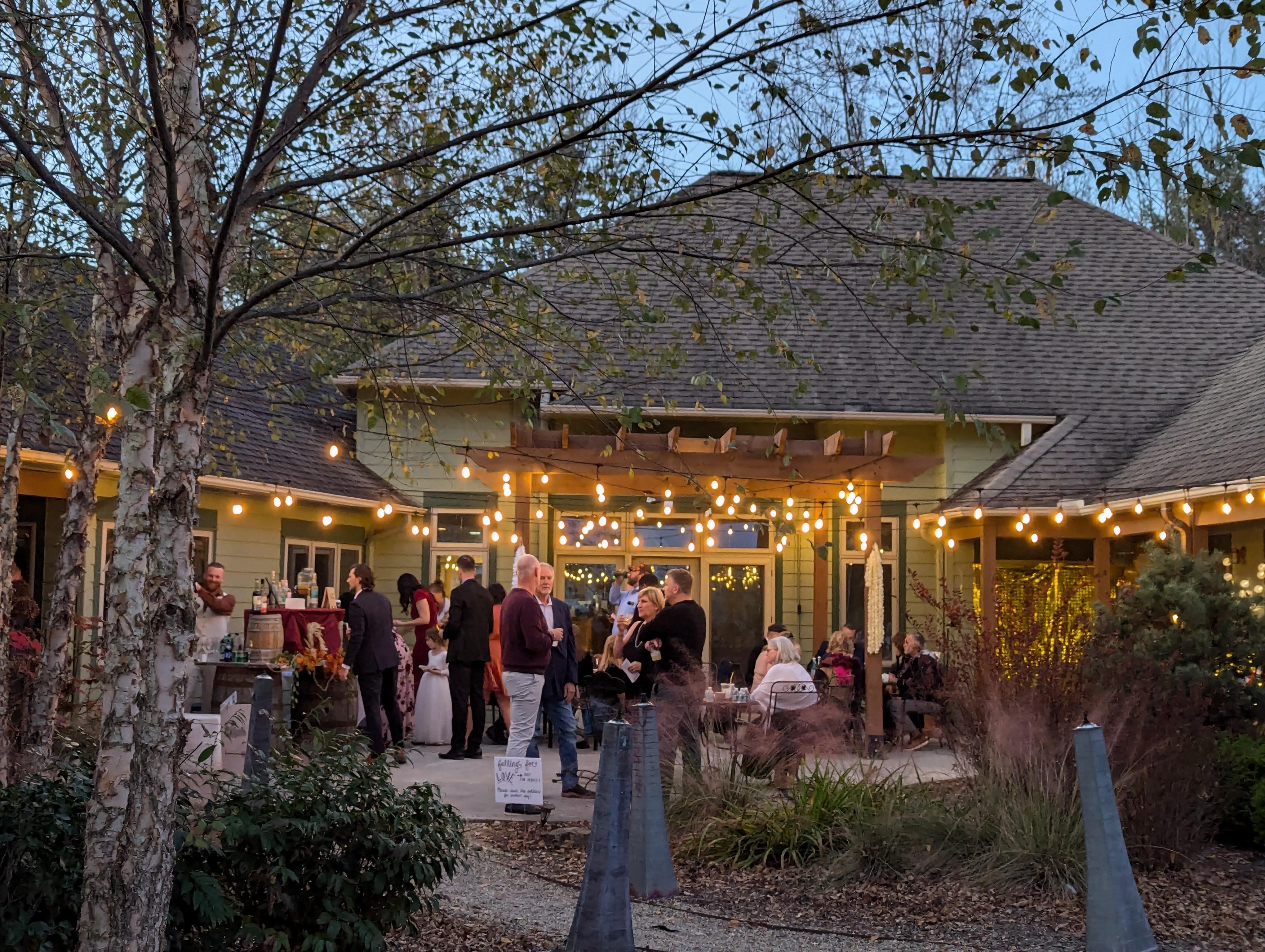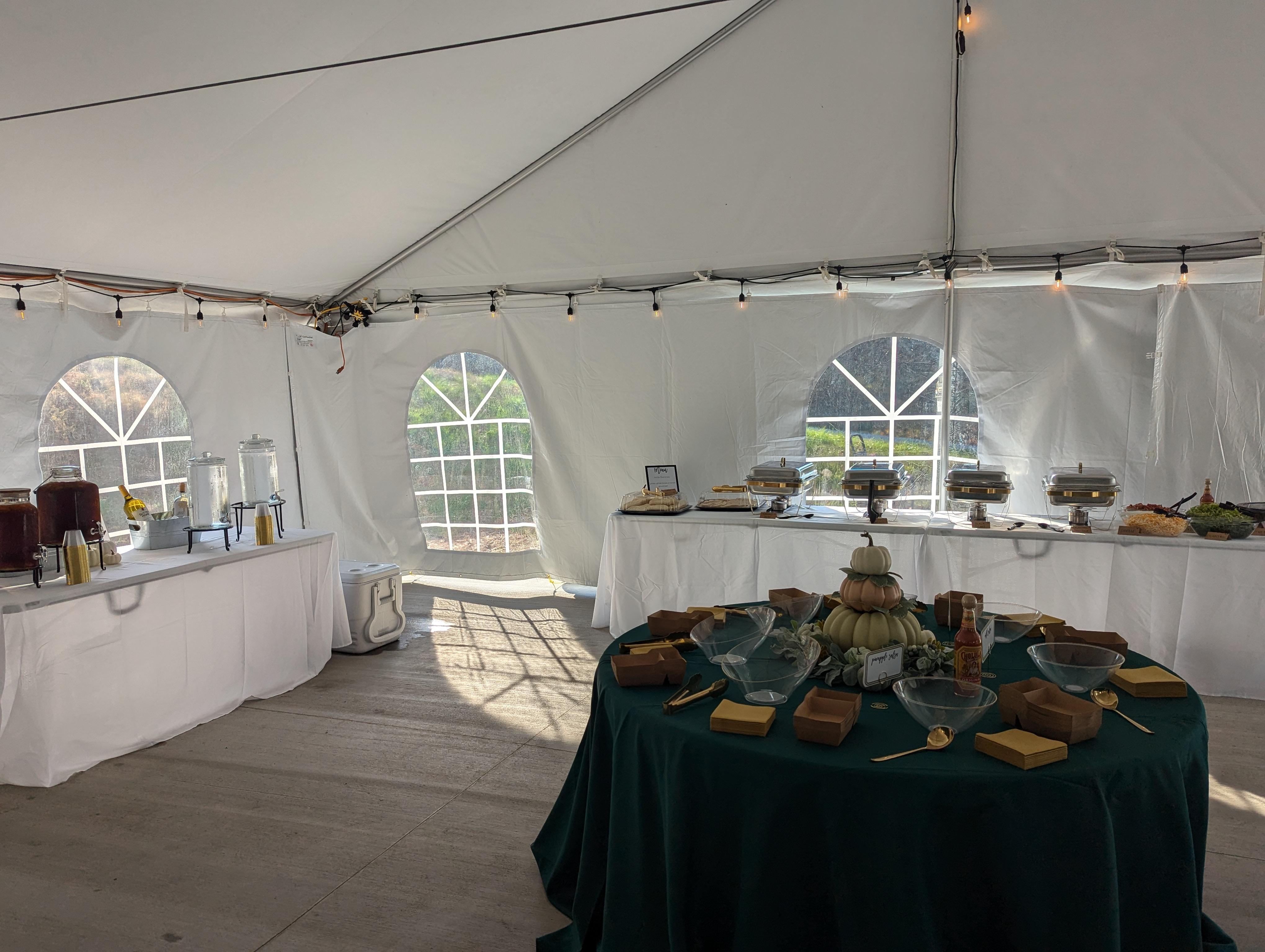 This space features a 30'x60' patio covered by a 30' x 60' white event tent, which can be used with sides on or off, depending on the season. Use of this space includes tent, tables, chairs, rustic bar.