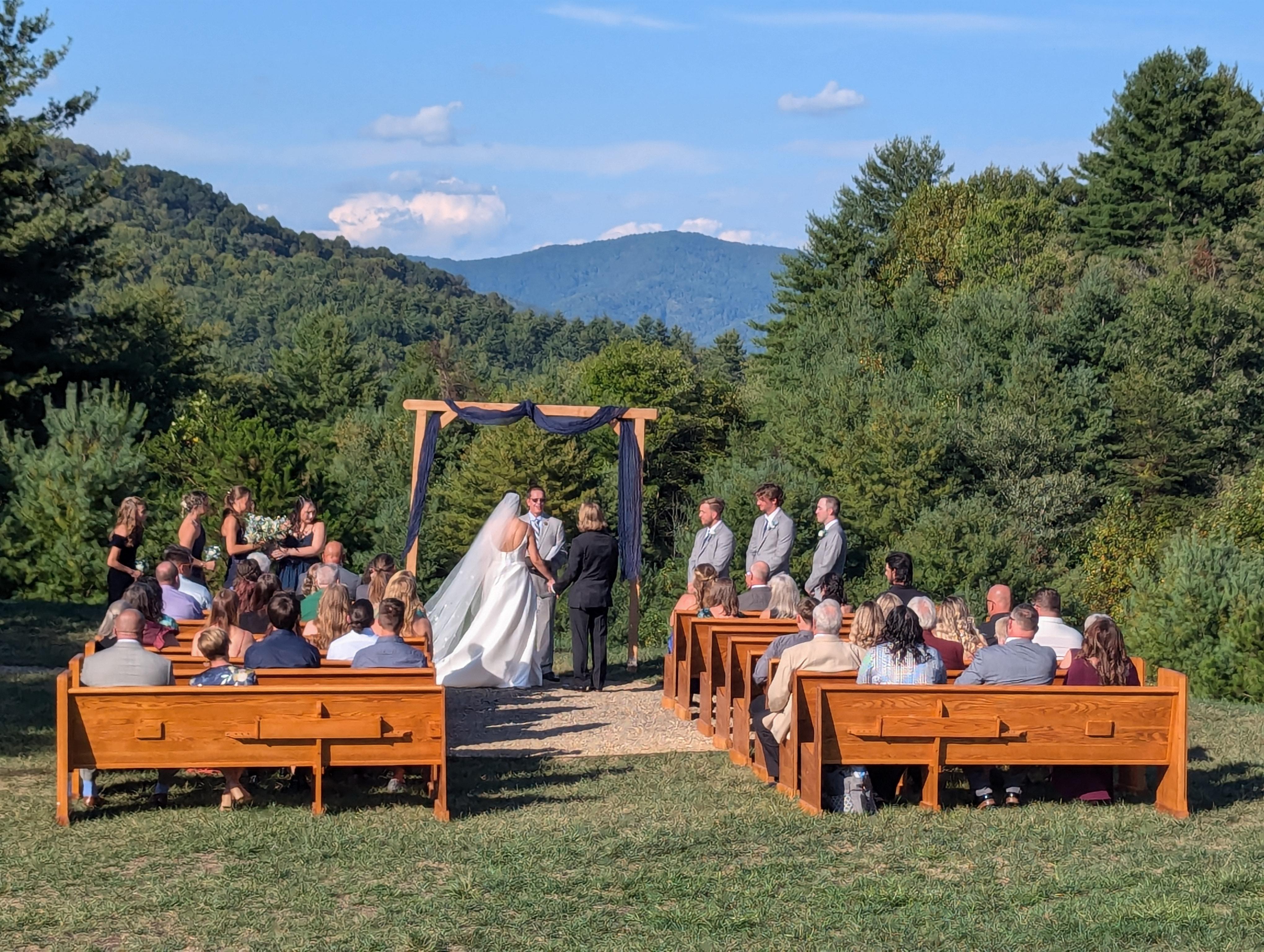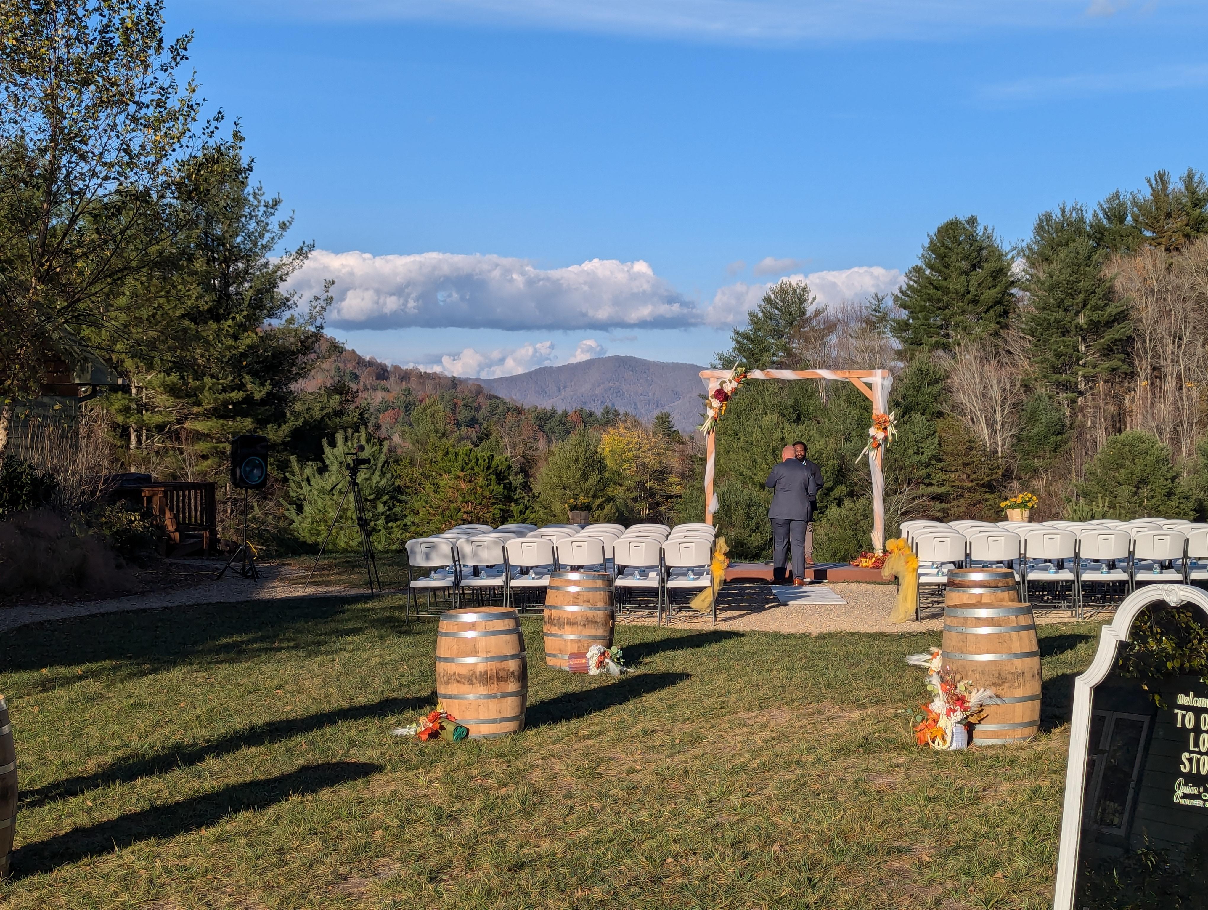 We got married at Stony Woods Estate during the weekend of Hurricane Helene. This storm devastated WNC in ways that are hard to put into words. Entire roadways, bridges, and towns were washed away, leaving communities isolated and in crisis. We chose Stony Woods because our families and friends were going to be traveling from out of state. Stony Woods offered the perfect setup. In addition to the main villa, the property has several beautiful/modern cabins within walking distance. As the storm wreaked havoc on the surrounding areas, 24 of us, including young children and elderly relatives—hunkered down at SW for 3.5 days, waiting for a safe route out. Despite the devastation around us, we were incredibly fortunate. Stony Woods sits high enough up the mountain that the venue remained mostly untouched, aside from a few downed trees and the loss of power/running water. The property became a sanctuary offering stunning mountain views once the storm passed. These moments of natural beauty provided comfort and healing as we navigated the chaos. When the situation turned dire, Kim and Steve stepped up in ways we never expected. They brought us vital supplies—diapers, baby wipes, food, water, and more. Their kindness and support were a lifeline while there. We had planned for a wedding with 75 guests, complete with vendors but of course, none of that happened. We didn’t have our full wedding party. Even our officiant, had no way of reaching us/vice versa. We didn’t know if she was safe, let alone if she’d be able to officiate our ceremony. Amid the uncertainty, Kim asked if we still wanted to get married and if there was anything she could do to help. With everything going on, the thought of still having our wedding seemed almost impossible. I replied, “We don’t even have an officiant.” To my surprise, Kim told me that Steve is ordained. She reassured me that if we wanted to move forward with the ceremony, Steve would happily step in. The morning of our wedding, everyone on the property—including Kim and Steve —came together to make it happen. My stepmother did the decor so we had them with us, My SIL did my hair in an RV outlet, and my MOH did my makeup with whatever we had. We used a BT speaker to play whatever songs we already downloaded on our phones. I don’t even remember what song played as I walked down the aisle, but it was perfect. For our reception meal Kim and Steve made a giant batch of spaghetti over their fire pit since we still had no power/were running low on food. Somehow, they also managed to bake a wedding cake—SO THOUGHTFUL. Despite the lack of vendors, guests, and traditional wedding elements, our people came together to create such a special day – a true testament to the power of community and love. The cherry on top? Our photographer, Ashley Sieg, miraculously made it to us with no cell service and no idea if we were still having a wedding. She captured stunning photos that we will cherish forever. Kim and Steve were more than just venue hosts; they were our lifeline during a harrowing weekend. Their generosity, resourcefulness, and genuine care made all the difference. From bringing supplies to officiating our ceremony, we couldn’t have done it without them. Stony Woods Estate is a breathtaking property. But beyond its beauty, this place holds a special magic. If you’re on the fence about booking your wedding here, do it. You won’t regret it! Don’t be surprised if Kim and Steve become a lasting part of your story.