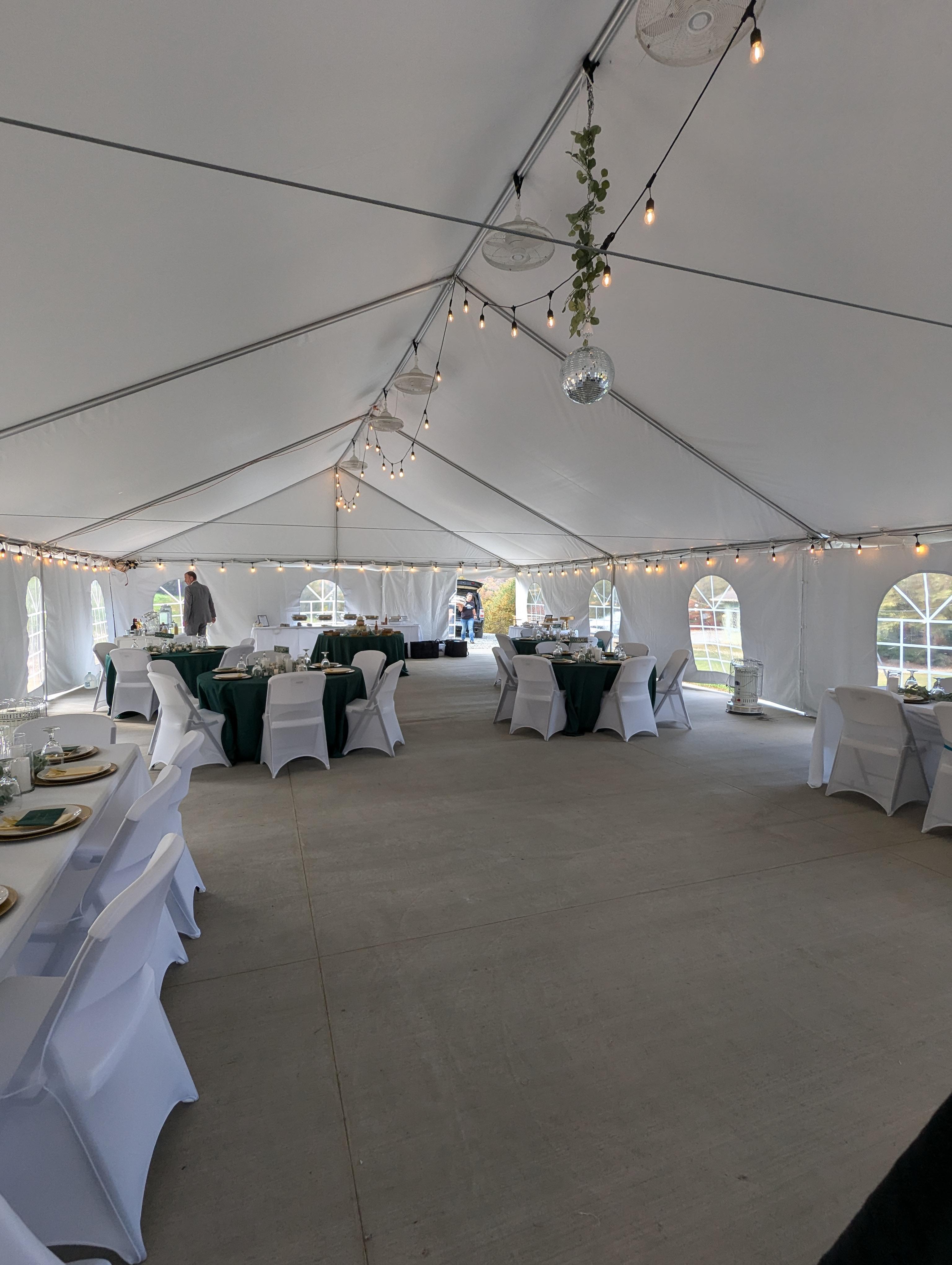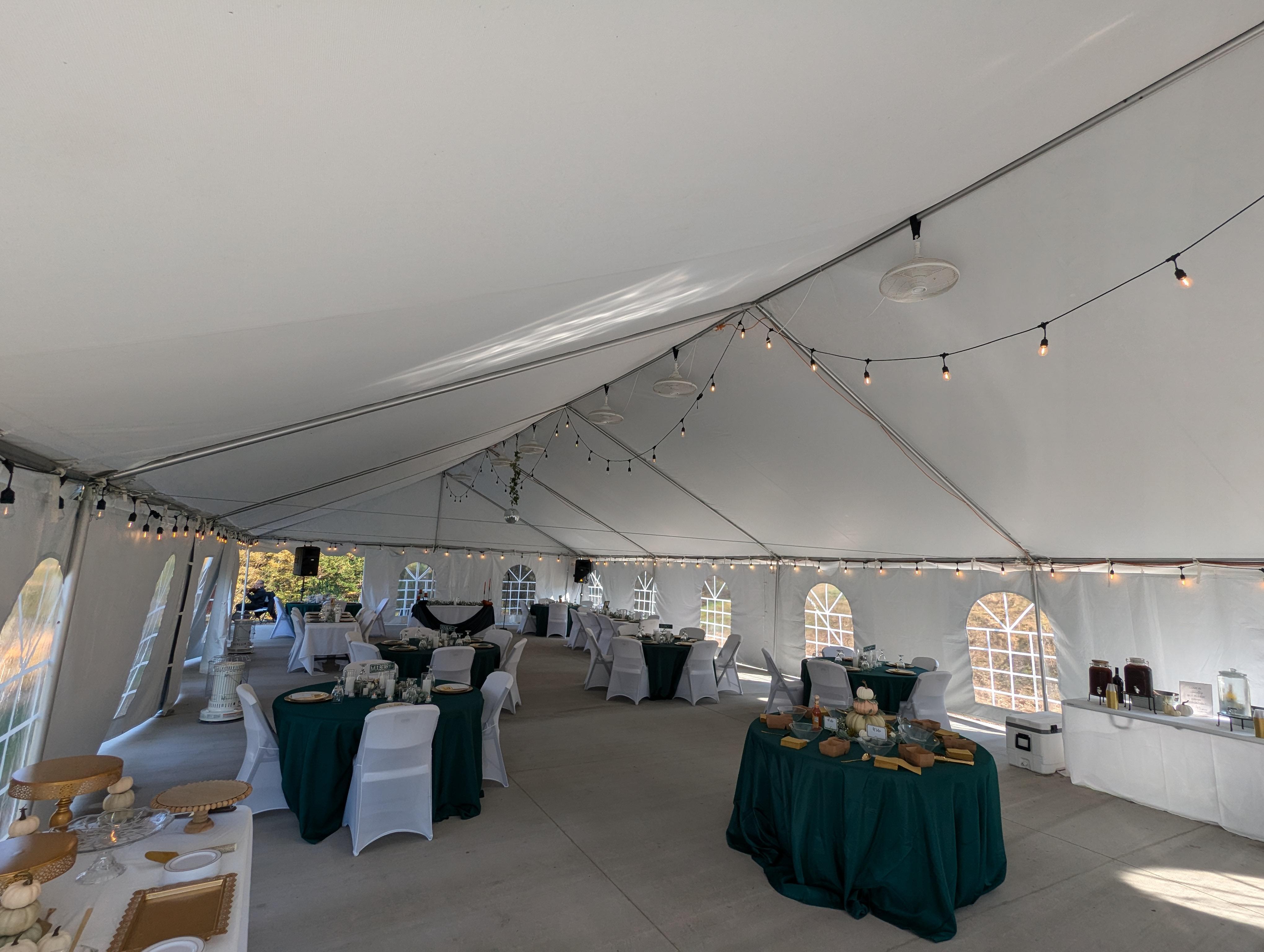 Lighting, ceiling fans, area heaters (winter) - Use of this space includes tent, tables, chairs, rustic bar.