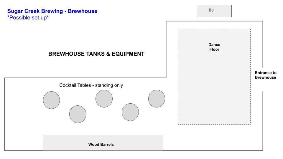 For those events when you can’t leave a single person off the guest list, Sugar Creek’s brewhouse is the perfect venue for you! Invite your guests to have a unique experience among the brewery tanks where all the magic happens! Your guests will have access to restroom facilities and the brewhouse is attached to our tap room and private event room.