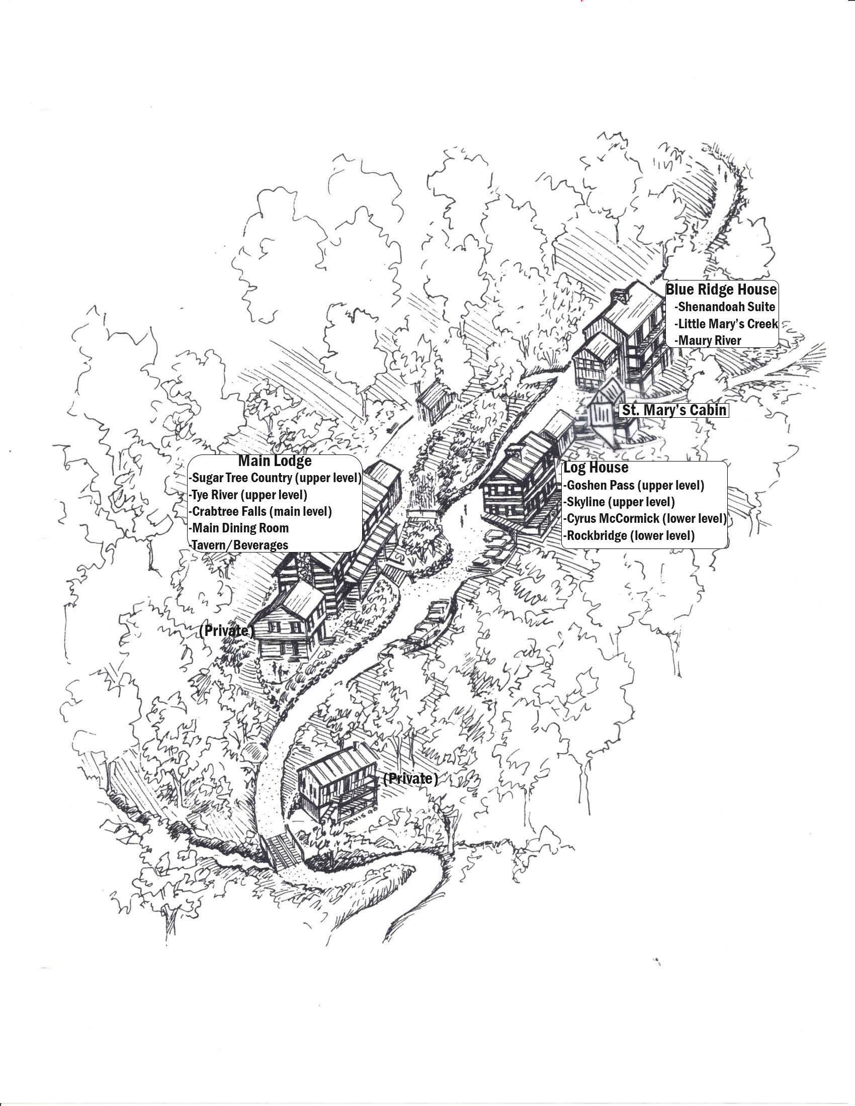 Main Lodge: Den, Dining Room, Tavern, and 3 King size bedrooms (one has a whirlpool tub). Log House: 4 Queen size bedrooms. St. Mary's Cabin: Stand-alone cabin with a King size bed and whirlpool tub. Blue Ridge House: Main level is a 2 bedroom/2 bathroom suite (sleeps up to 6). Upper level has 1 Queen size room and 1 King size room with a sitting area.