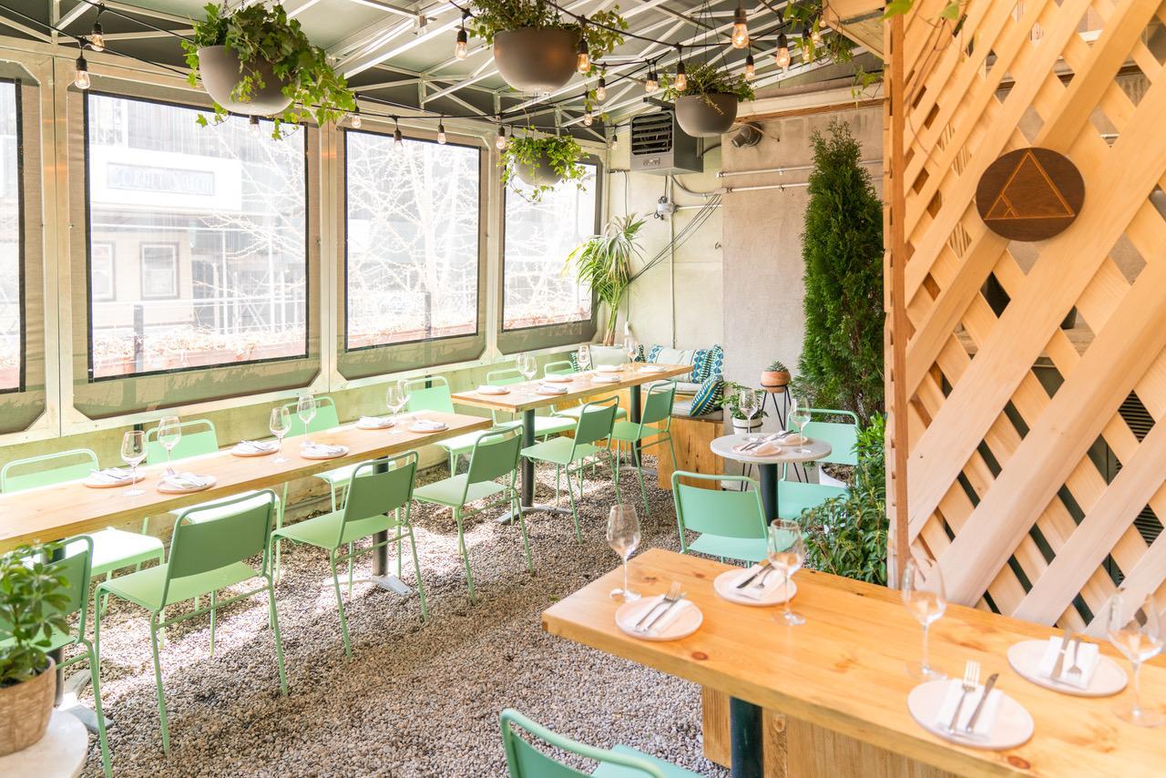 A temperature controlled enclosed rooftop Garden, with long wooden dining tables and market string lights.
