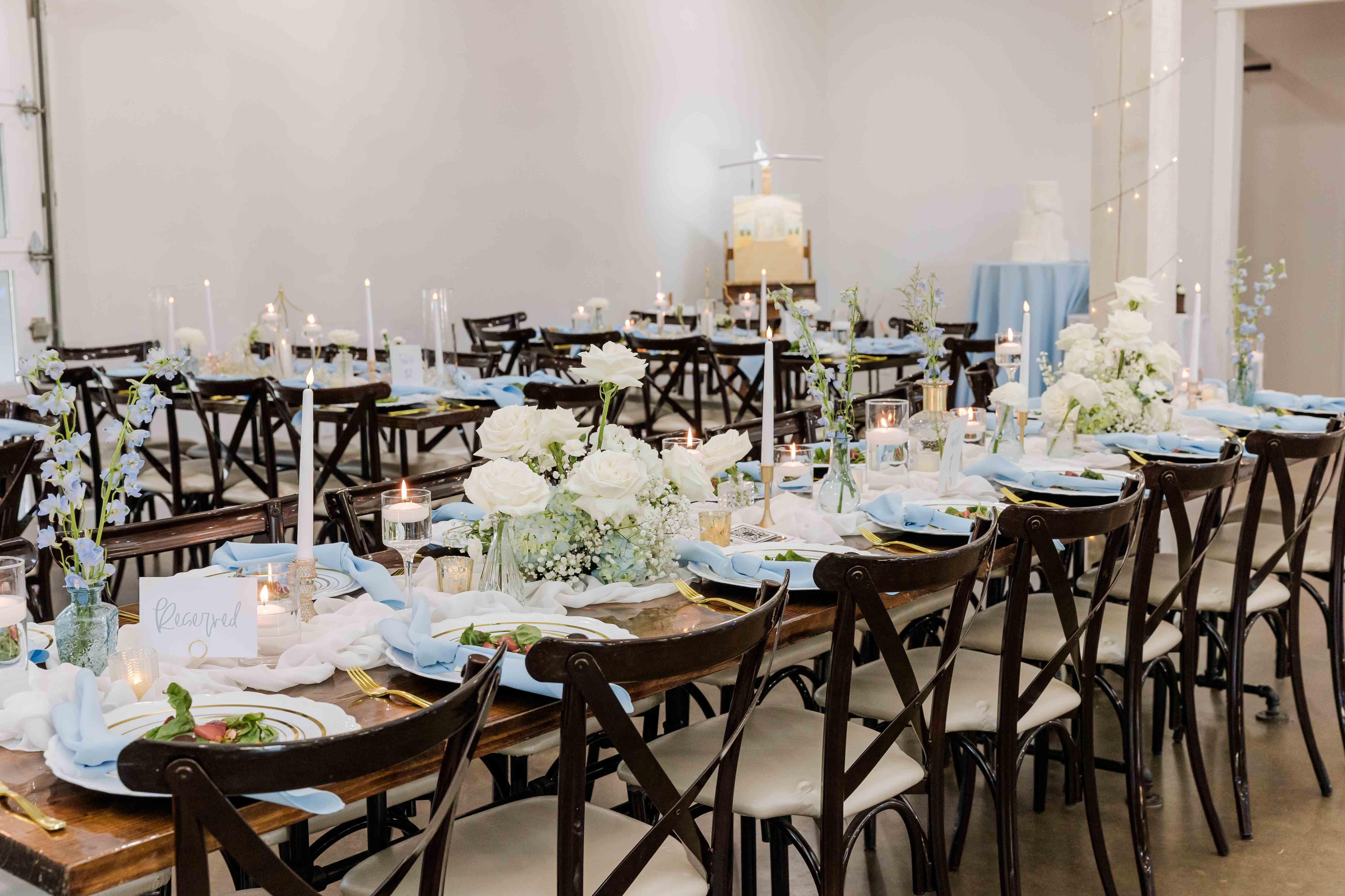 - Family style tables -Upgraded mahogany crossback chairs -Something Borrowed closet with centerpieces and linens (at no charge)