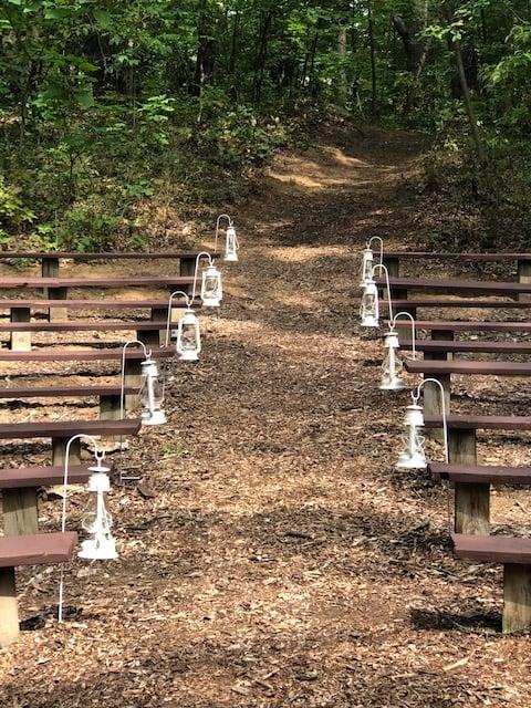 This beautiful multipurpose area is located in our Diamond Valley area of the property. Wooded trails lead you to outdoor stadium style seating for up to 100 people facing a quaint rustic structure. Tucked under a lush canopy of trees this area is perfect for weddings, worship, events or gathering of your needs.
