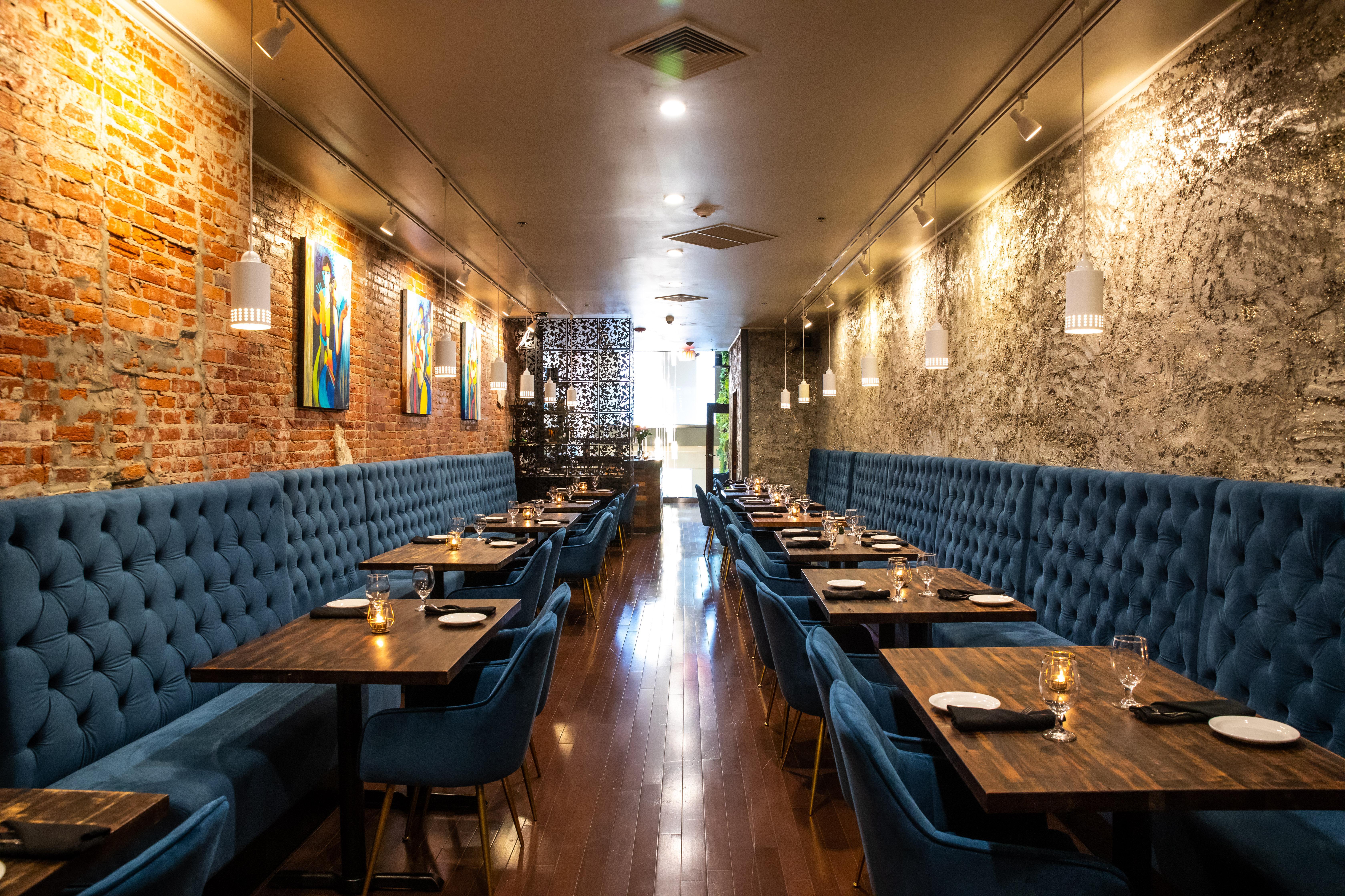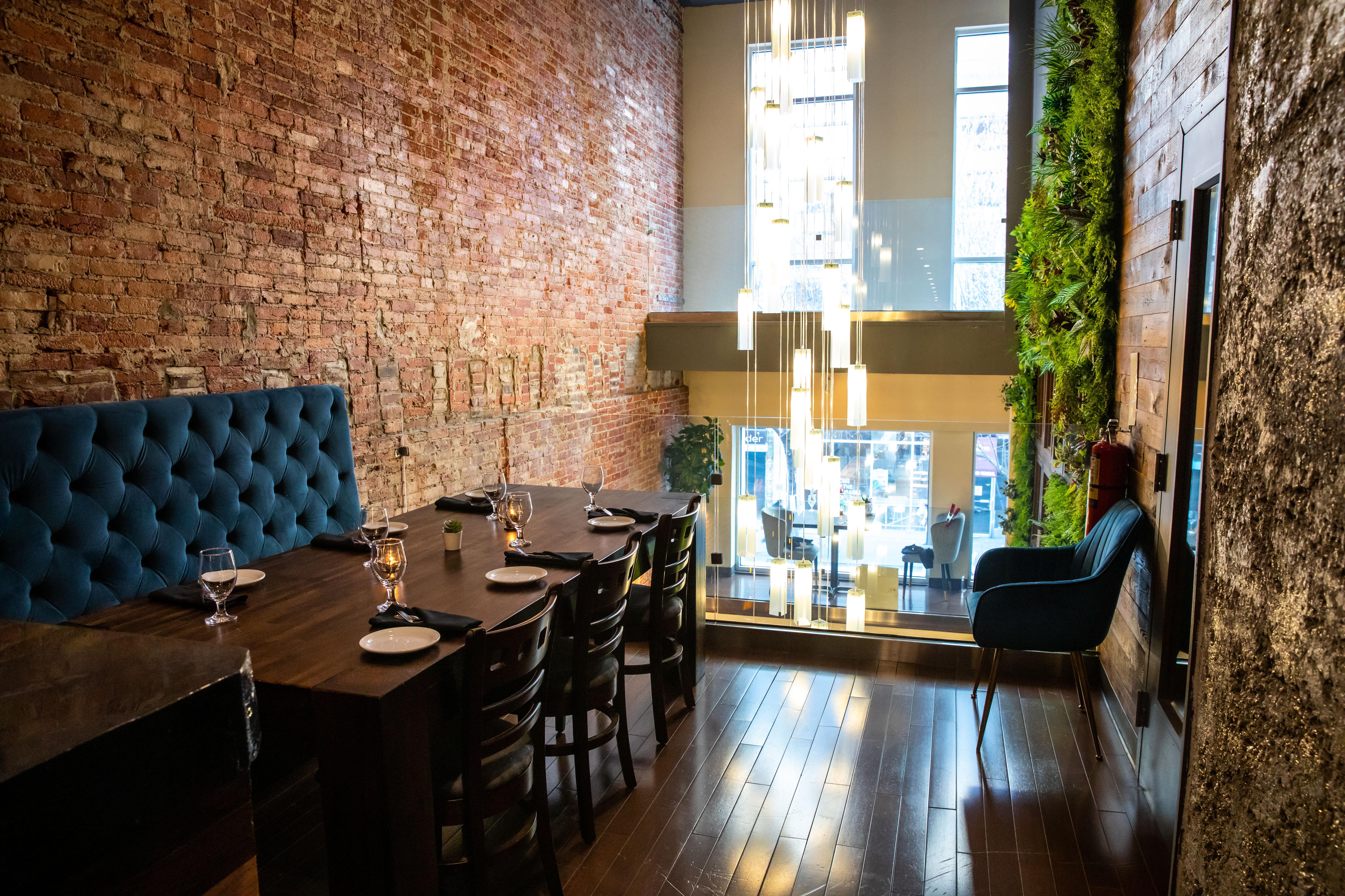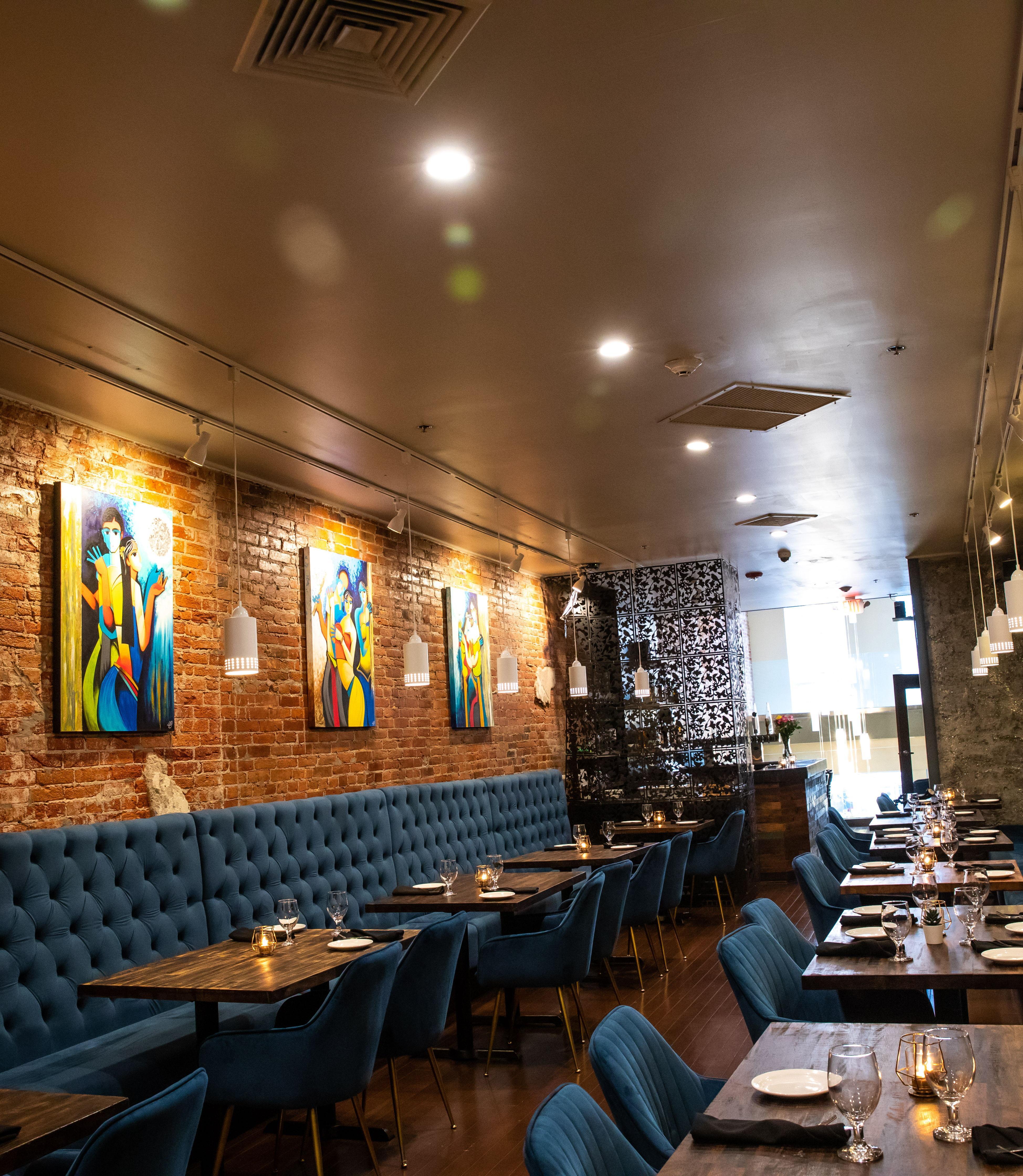 A blend of contemporary and modern, the main dining room at Sura Indian Bistro offers an elegant and inviting ambiance. Perfect for intimate gatherings and larger events, it features a full bar with handcrafted cocktails, fine wines, and premium spirits. Seating 40-50 guests comfortably, this stylish space ensures a memorable dining experience with its sophisticated decor and attentive service.