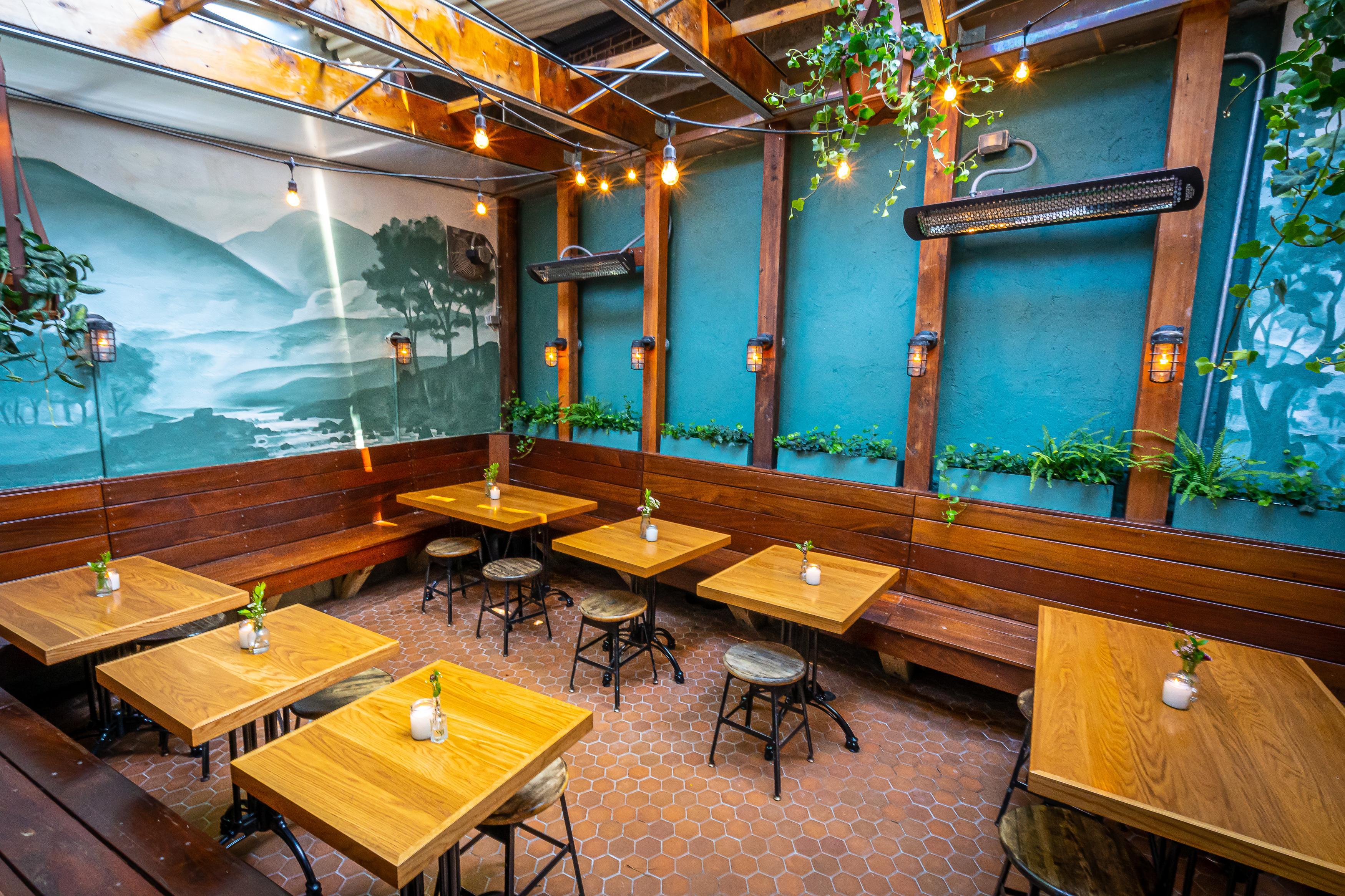Our verdant back patio is a beautiful private event area for intimate gatherings. During colder months, we enclose the space to transform it into a snug outdoor winter retreat. The Glass House is a fantastic option for cozy events, from bridal showers to wedding farewell brunches with a capacity of about 25 people.