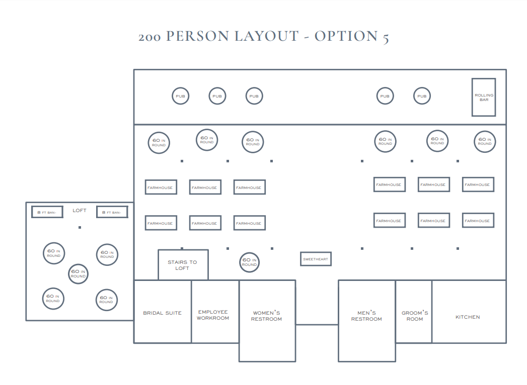 Ceremony site with seating, electricity, & arbor. Bridal Suite + private restroom. Groom’s Room. Vintage string lights. Large fire pit. Lawn Games. Caterer Staging Kitchen. Shower facilities. Handicapped accessible restrooms. Loft area. Large back porch. Bridal Borrow Closet. Ample parking. Tables & chairs. Specialty tables. Bar. Staff onsite.