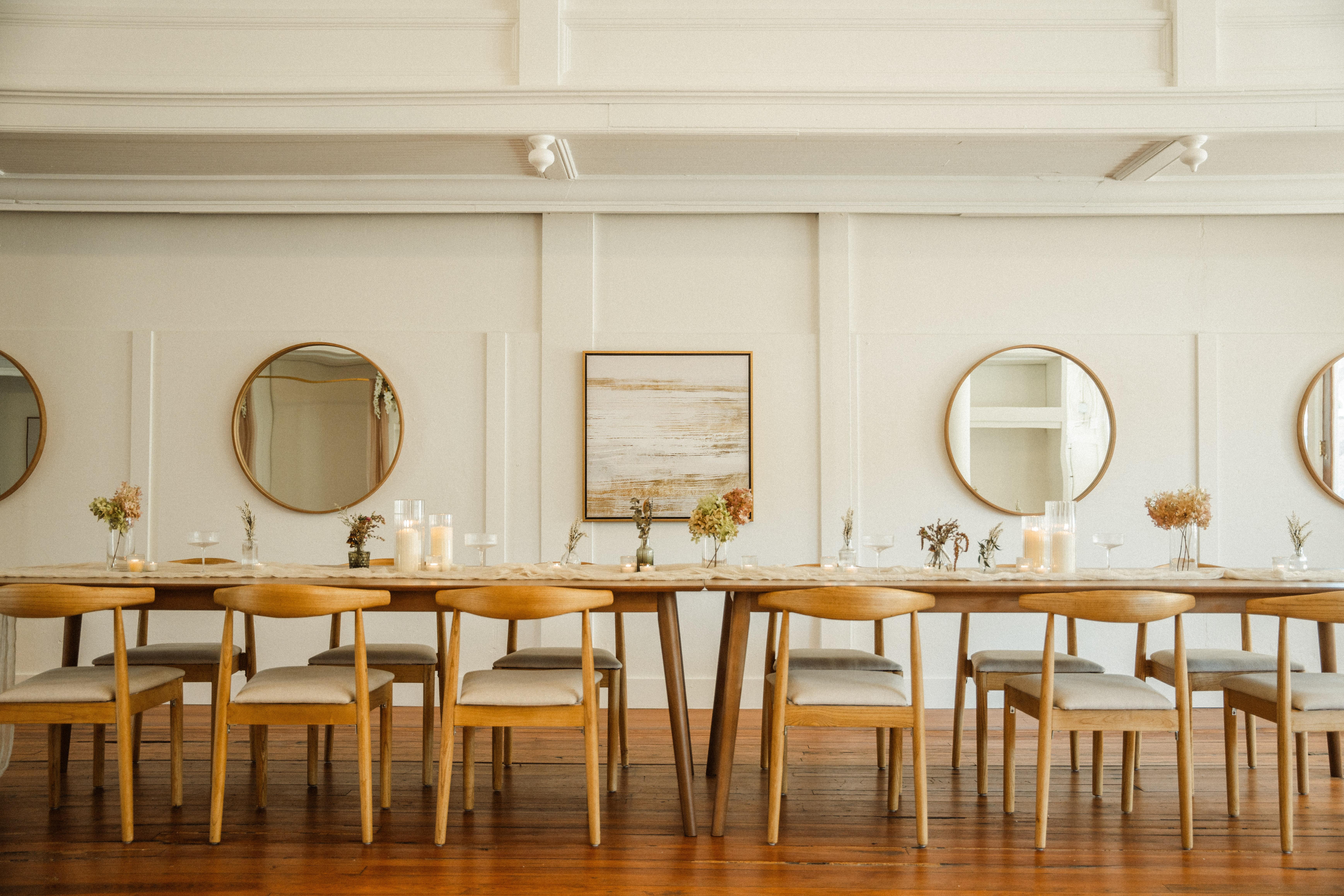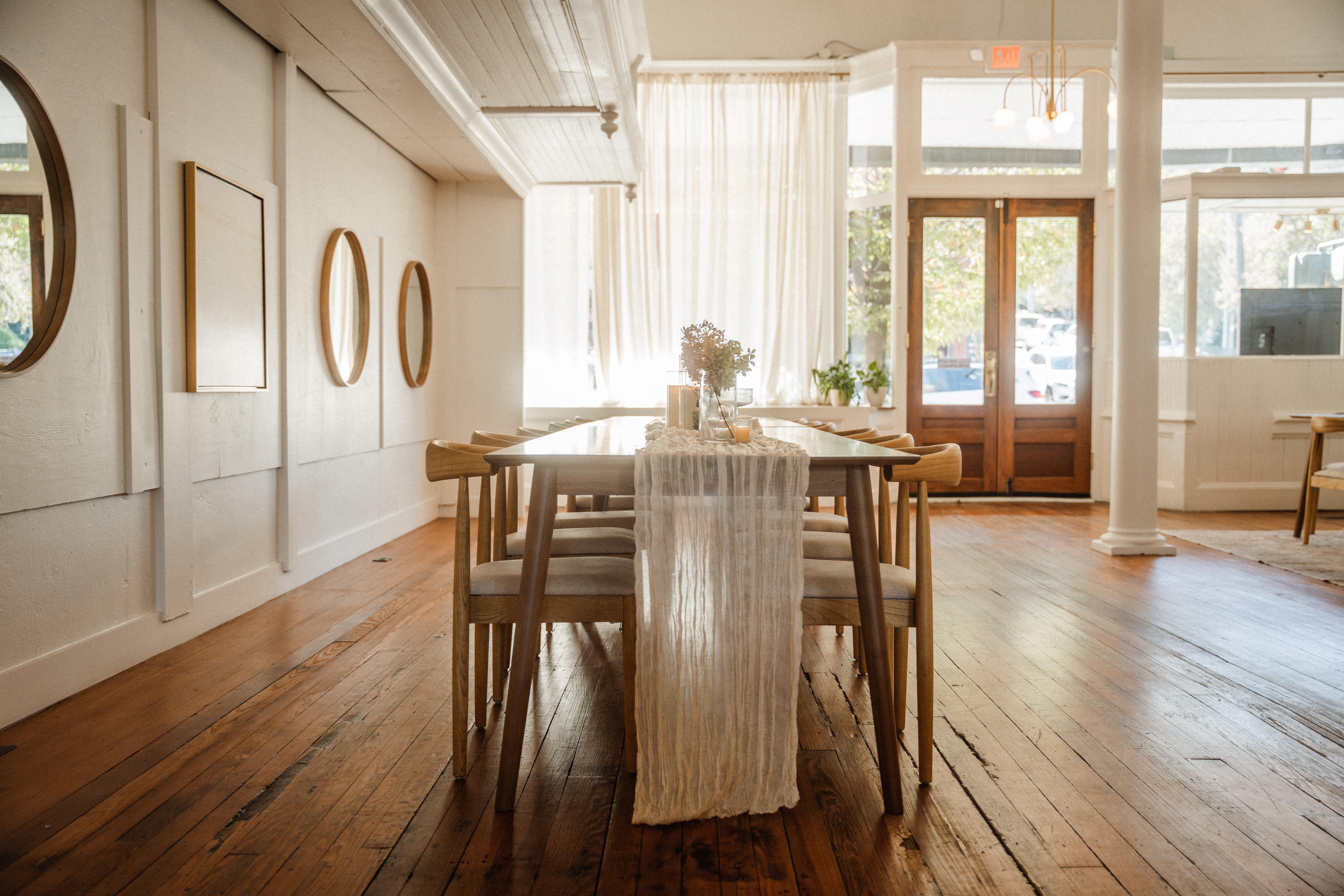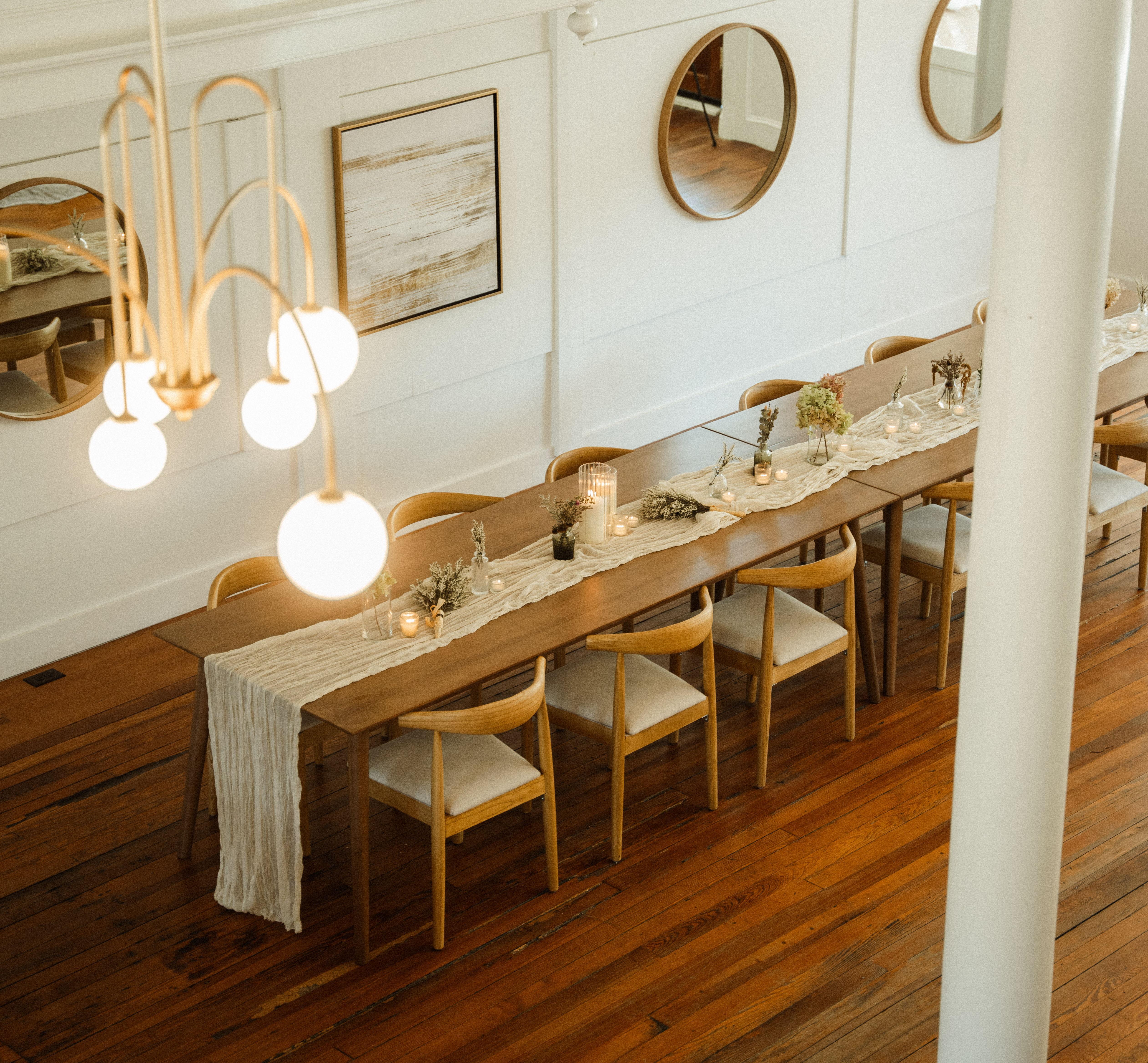 - Up to 8 hours of access to venue - Chic and modern house chairs, tables & soft seating - PA System **Optional upgrades include in-house catering and bar packages, access to Blue Ridge Bootleg Coffee Roastery & Cafe. - Venue Manager to coordinate included amenities - Guest Wifi