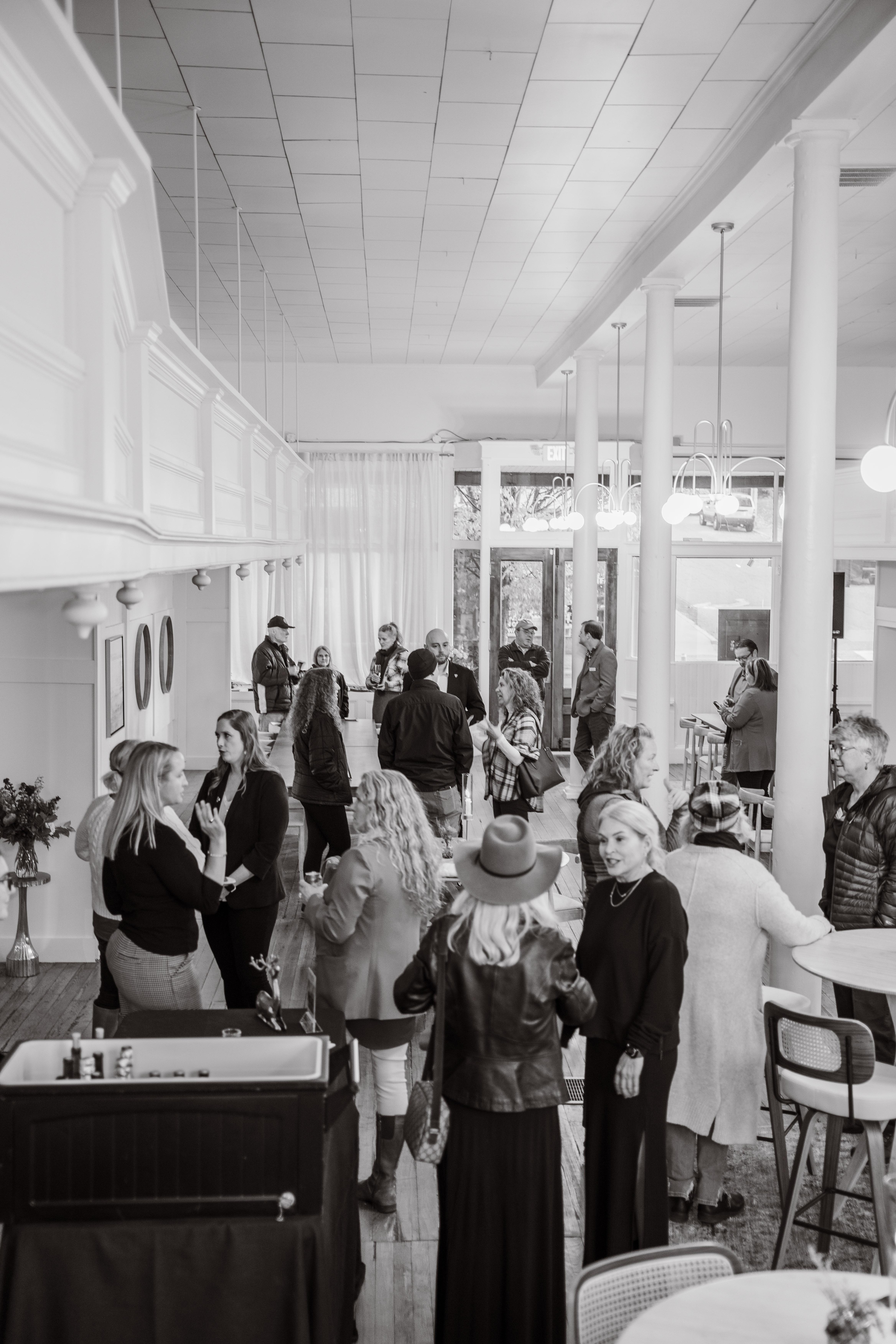 The venue is thoughtfully designed to accommodate a variety of events, from small gatherings to larger celebrations, all while maintaining a cozy, welcoming atmosphere. Exposed beams, elegant lighting, and an open layout create a sense of sophistication and warmth, while large windows invite natural light, offering breathtaking views of the surrounding mountains and downtown Sylva.