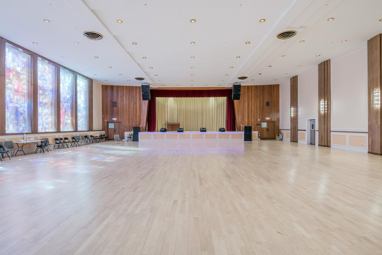 The event space of Temple B'Nai Moshe features sizable windows and high ceilings, illuminated by ample natural light. This venue can host events for up to 350 seated guests.