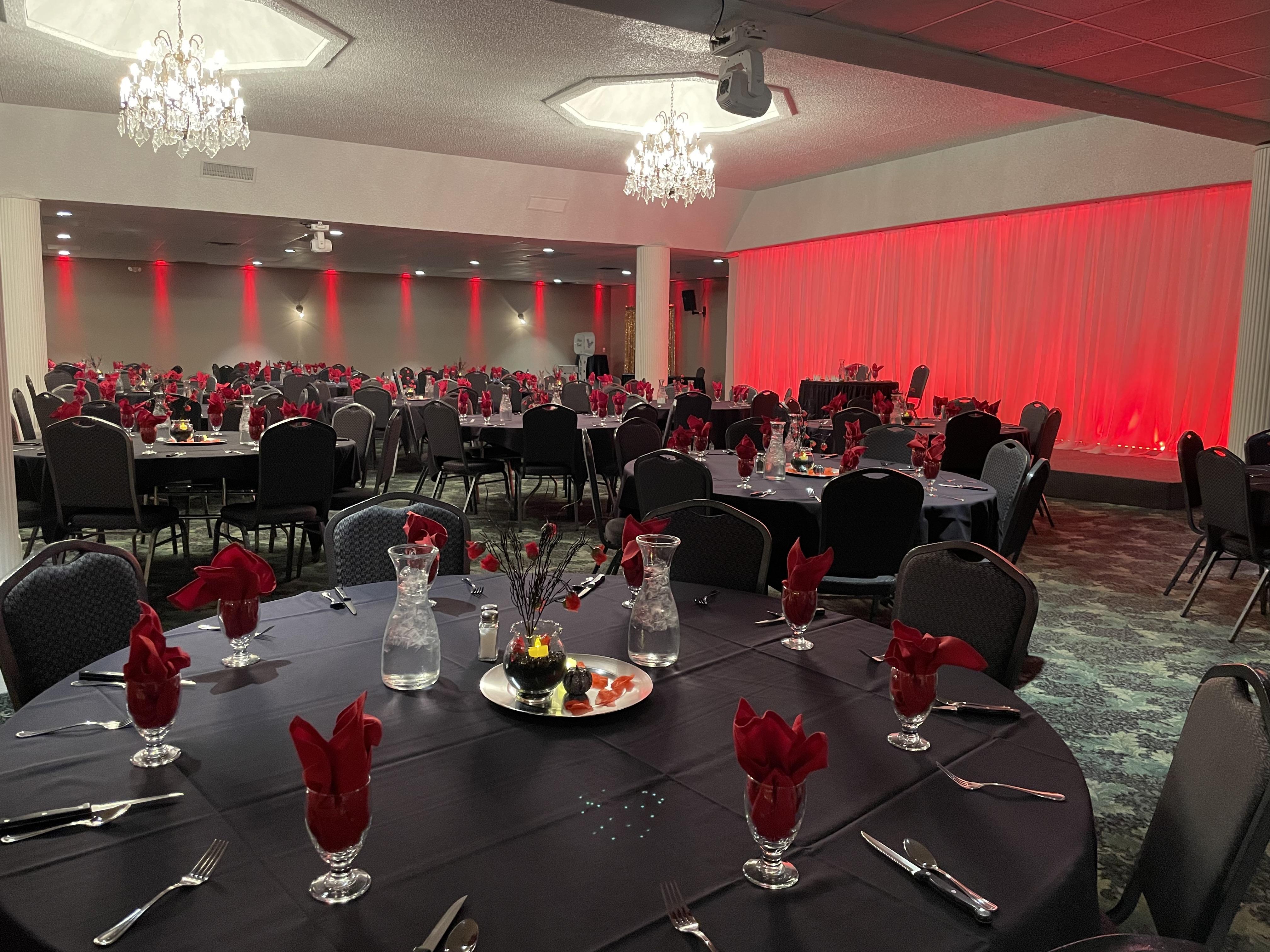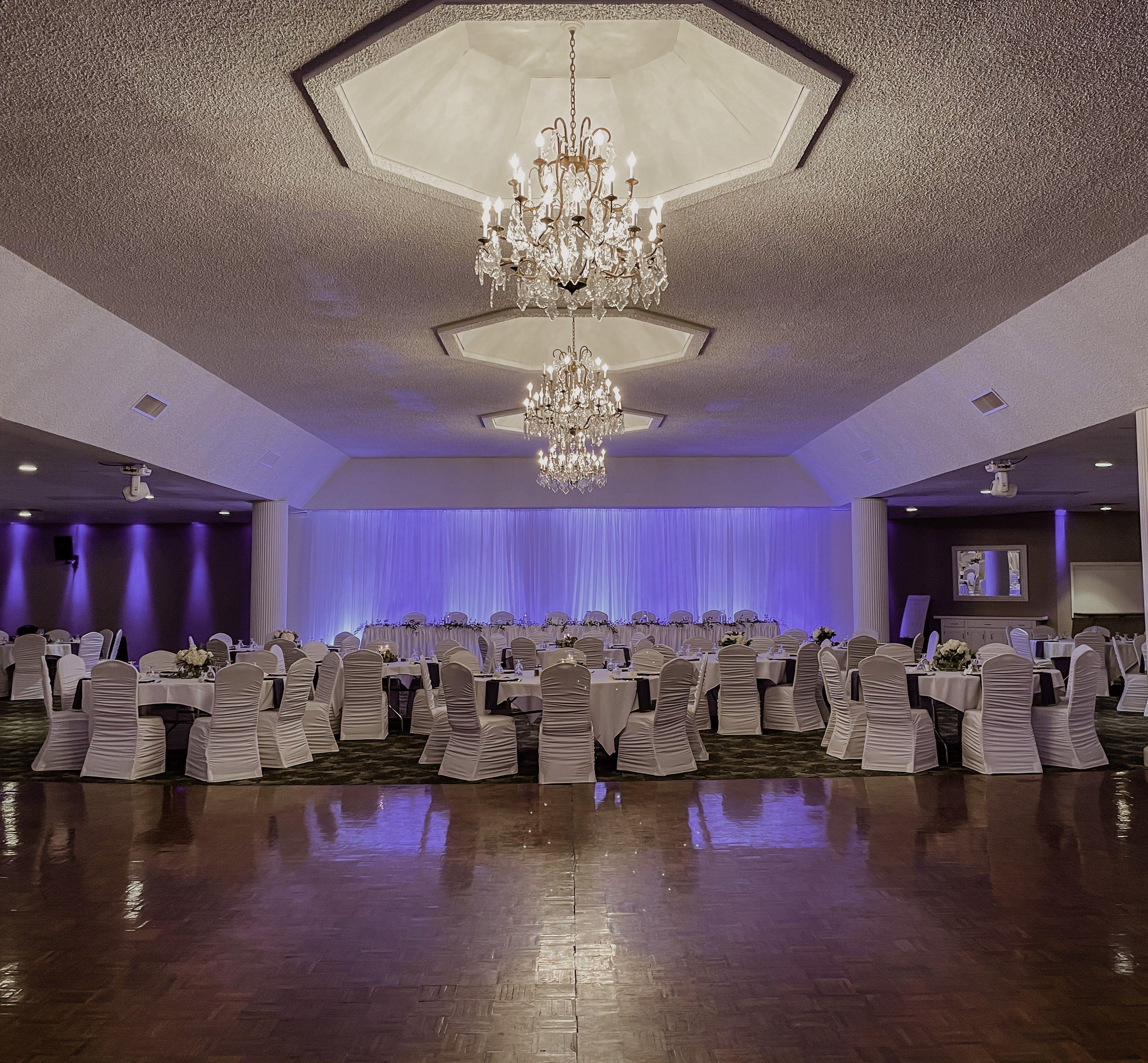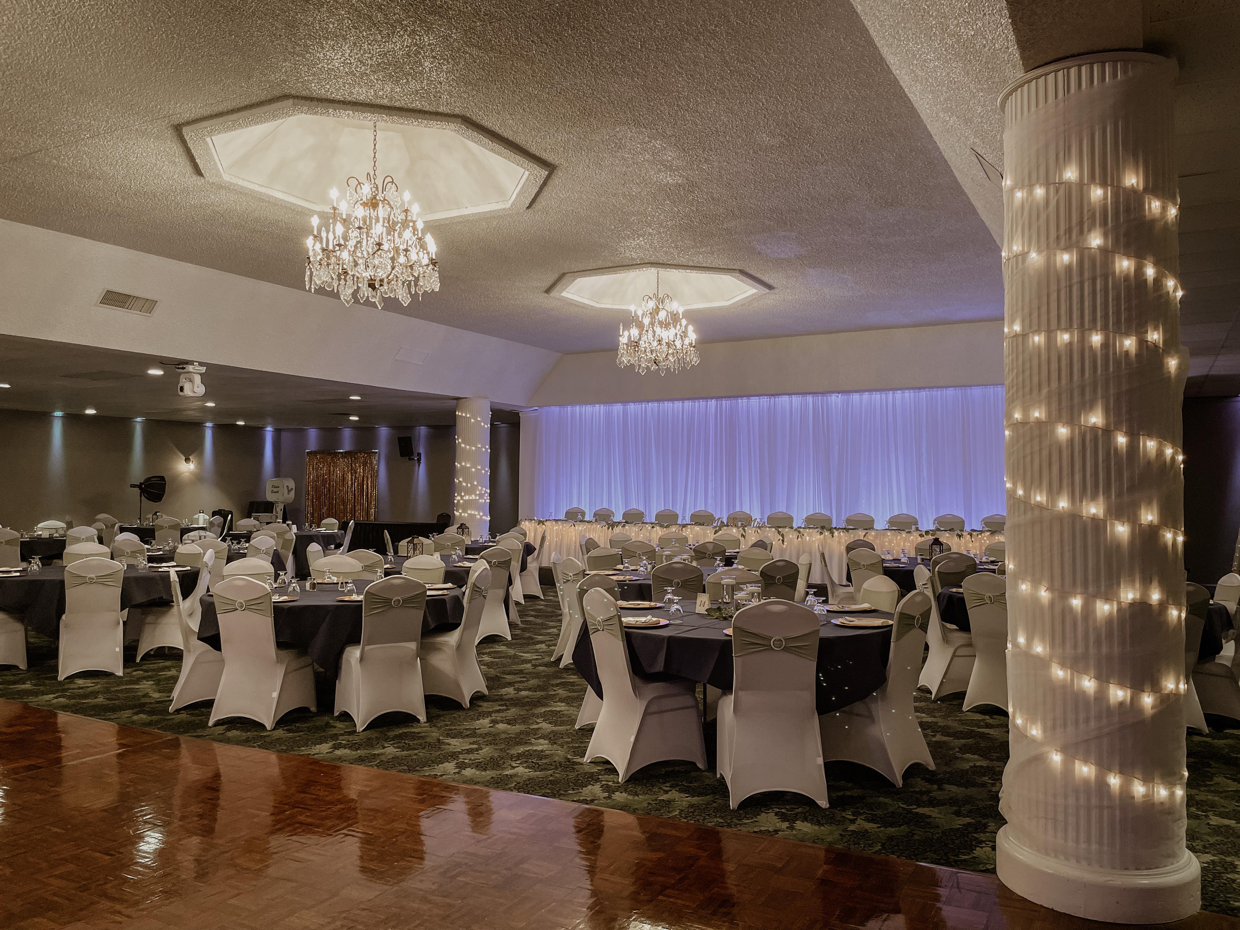 Our ballroom has three gorgeous crystal chandeliers and 6 white pillars create a formal elegance vibe to the room. There is a huge hardwood dance floor, a large DJ/band stage, and a head table stage frequently used by bridal parties. The ballroom has a large bar service area and we have a full liquor license. A coffee cart and a photo booth also compliment this area. Certainly last but not least, a state of the art full room lighting system creates the ambiance for a fun event.