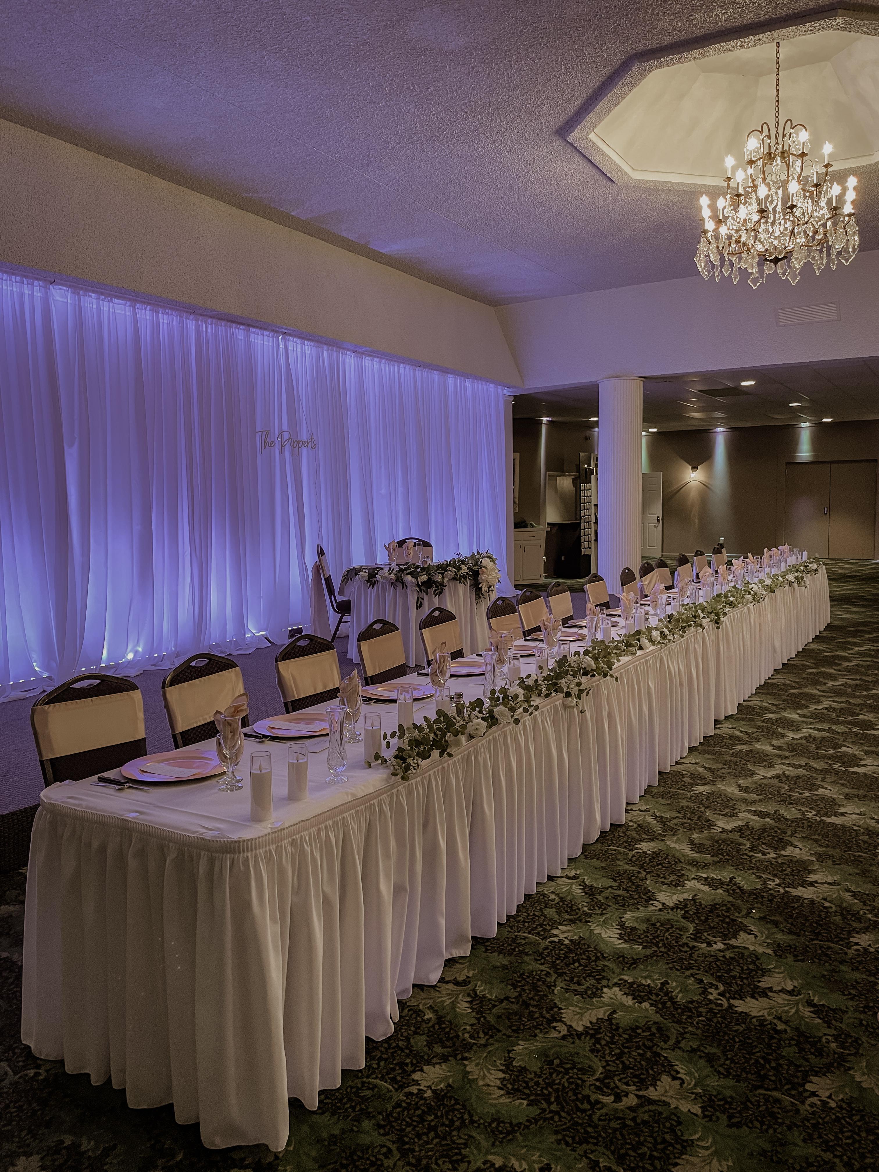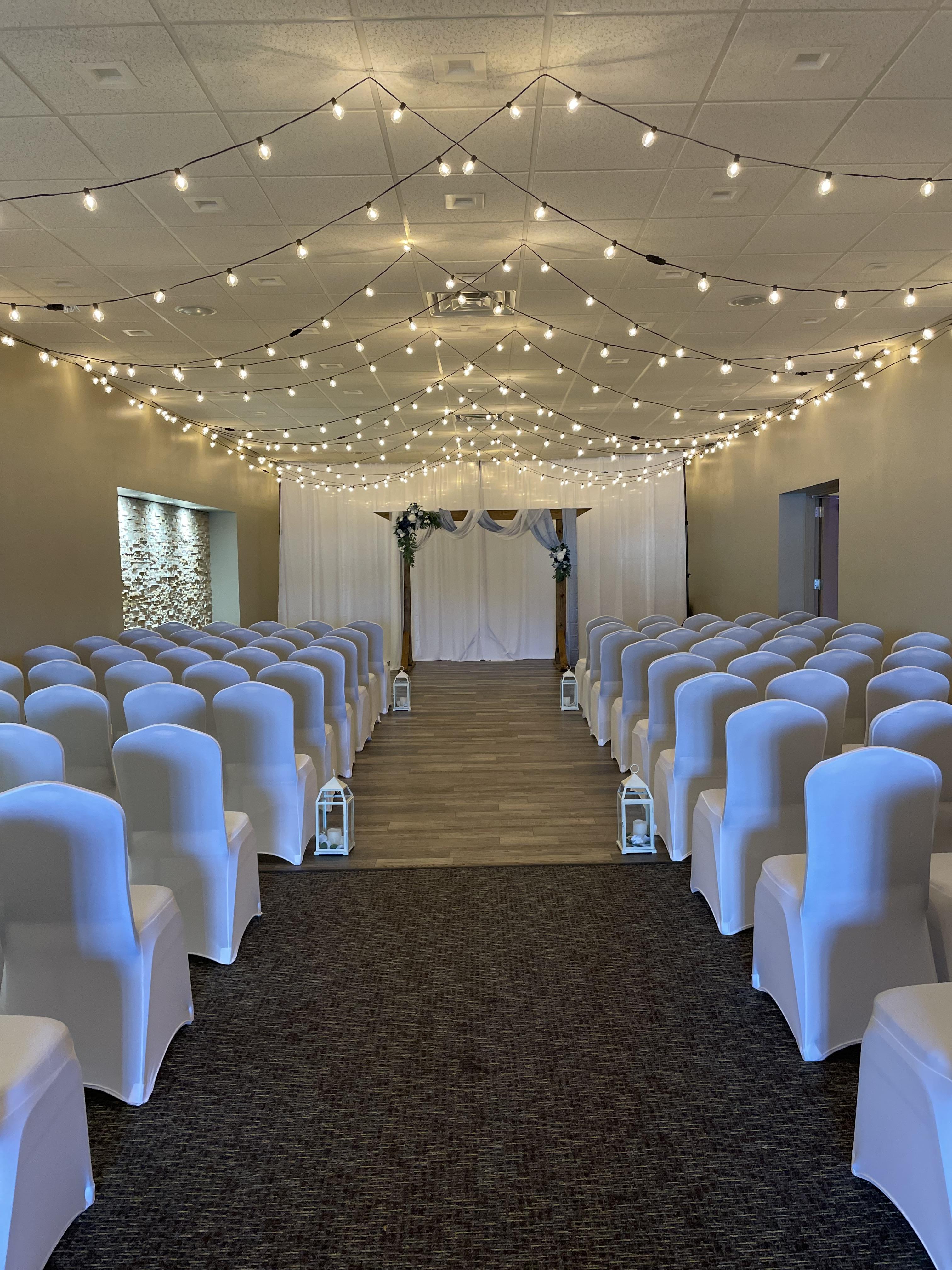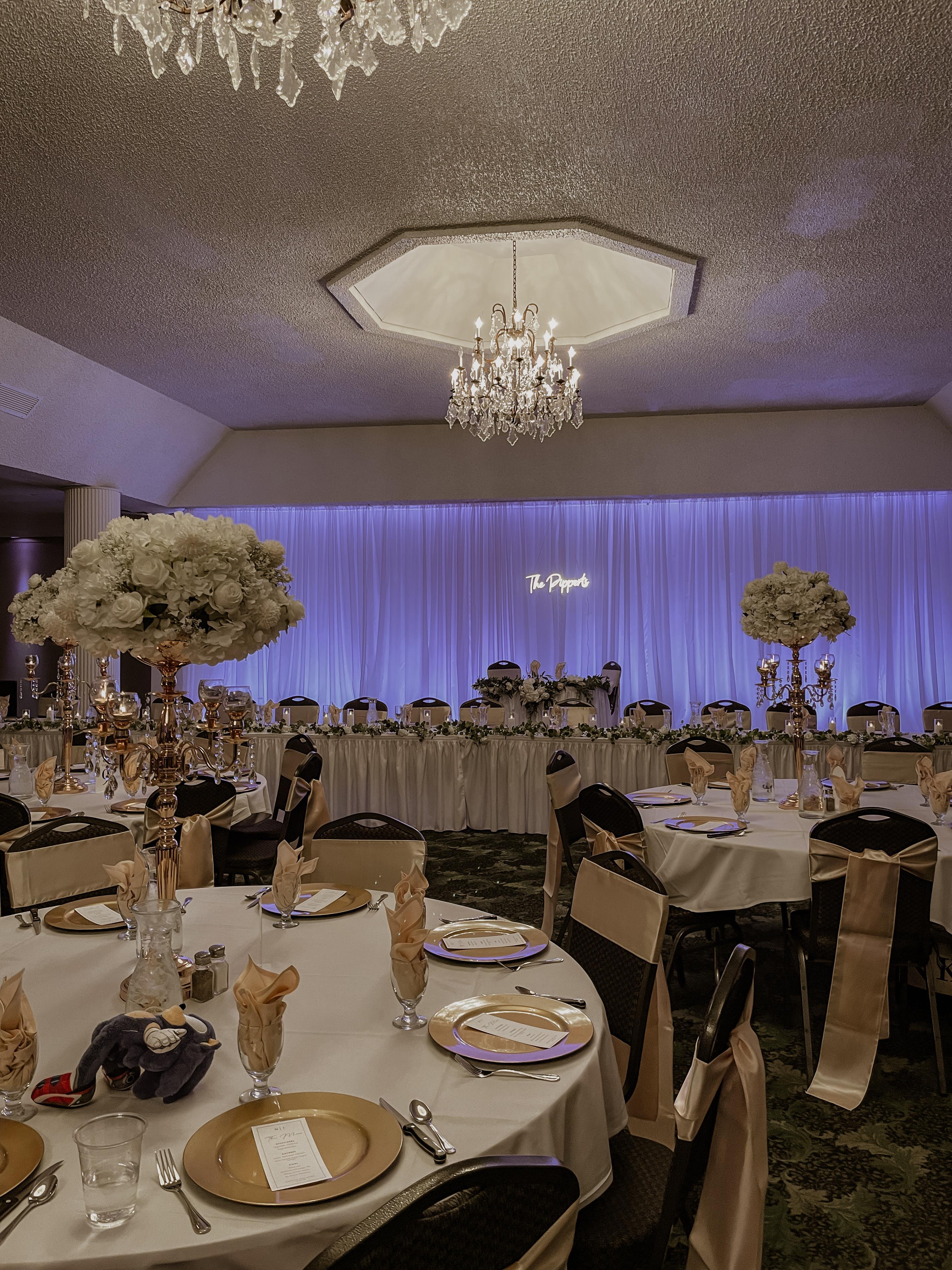 Our ballroom has three gorgeous crystal chandeliers and 6 white pillars create a formal elegance vibe to the room. There is a huge hardwood dance floor, a large DJ/band stage, and a head table stage frequently used by bridal parties. The ballroom has a large bar service area and we have a full liquor license. A coffee cart and a photo booth also compliment this area. Certainly last but not least, a state of the art full room lighting system creates the ambiance for a fun event.
