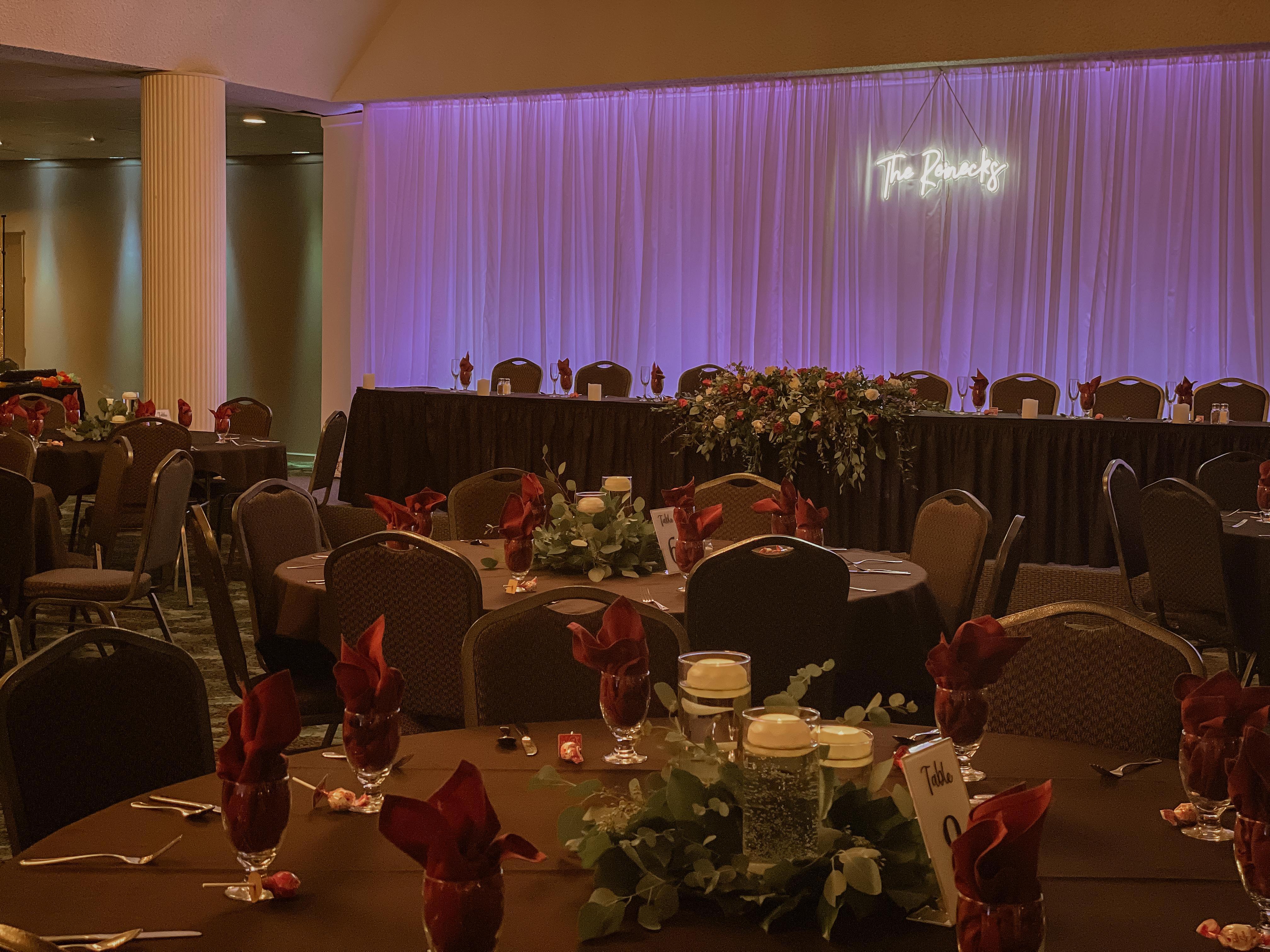 LED Down-Lighting around the room in your choice of color(s) Tables, Chairs, Table Linens, Set Up & Tear Down, China Plates, Glassware, Silverware, Banquet Servers & Bartenders Access to our Premier Partners list. This is a list of small businesses in the area that have agreed to give Ten Fifty Eight customers exclusive discounts!