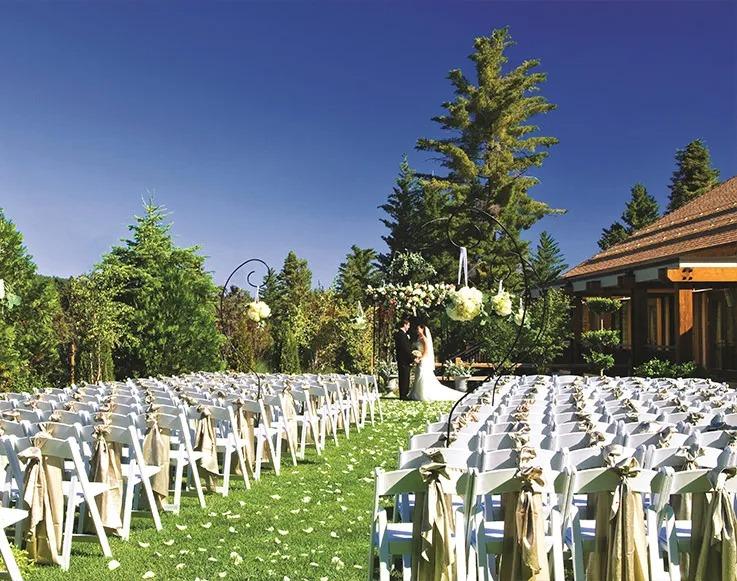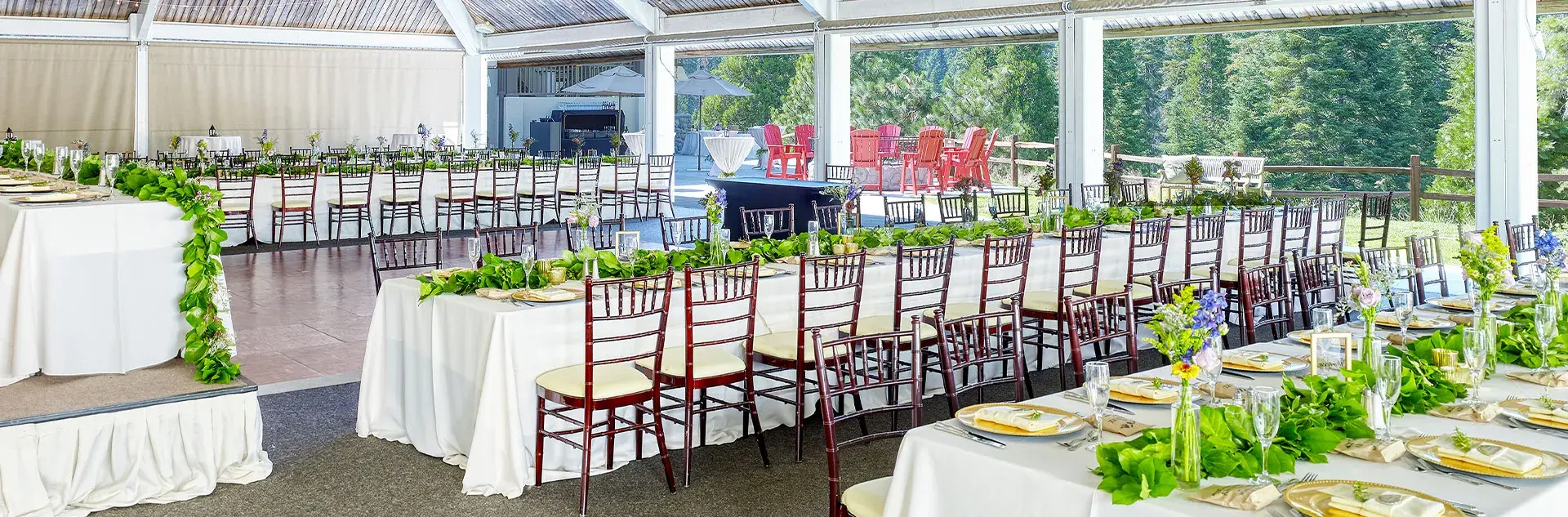 Host your ceremony any time of year at this breathtaking outdoor location, framed by the majestic Sierra Nevada. The dedicated ceremony site includes the use of a beautiful wrought iron arbor, providing a classic focal point against the dramatic mountain backdrop. The Grand Terrace and adjacent Counties Lawn blend a sophisticated paved area with pristine natural grounds, creating a perfect, expansive setting for guests. Classic white padded chairs and optional staging are included, ensuring a beautiful, elegant, and timeless scene for exchanging your vows under the vast mountain sky.