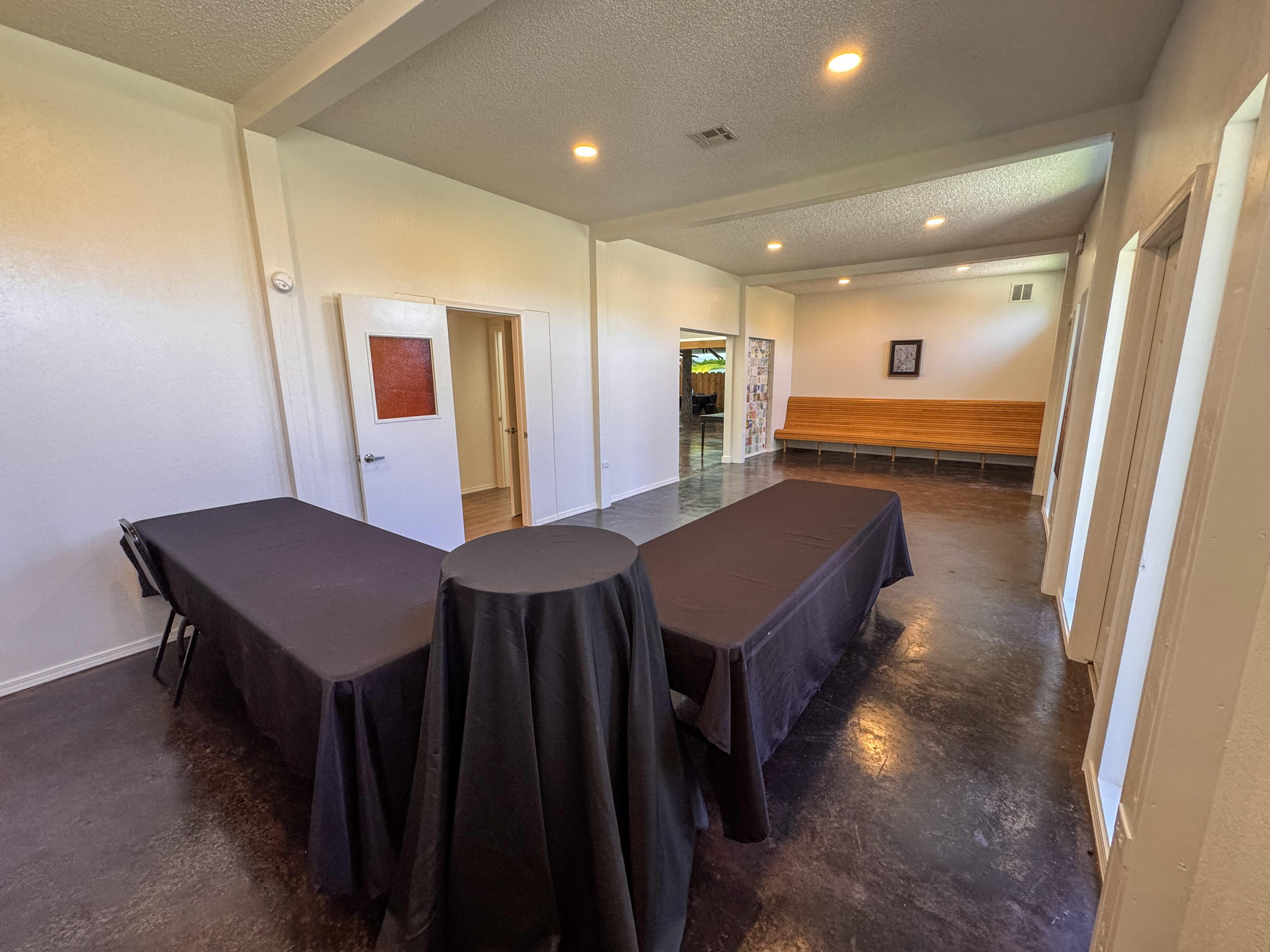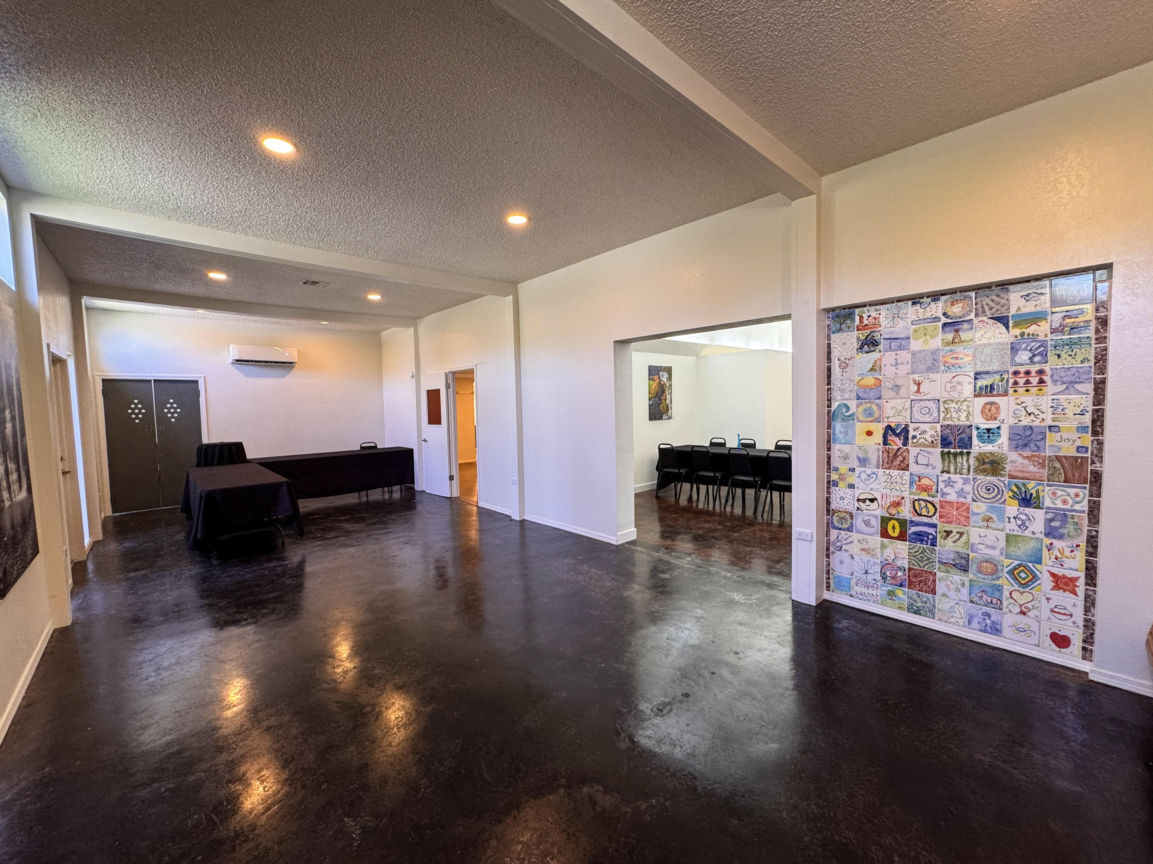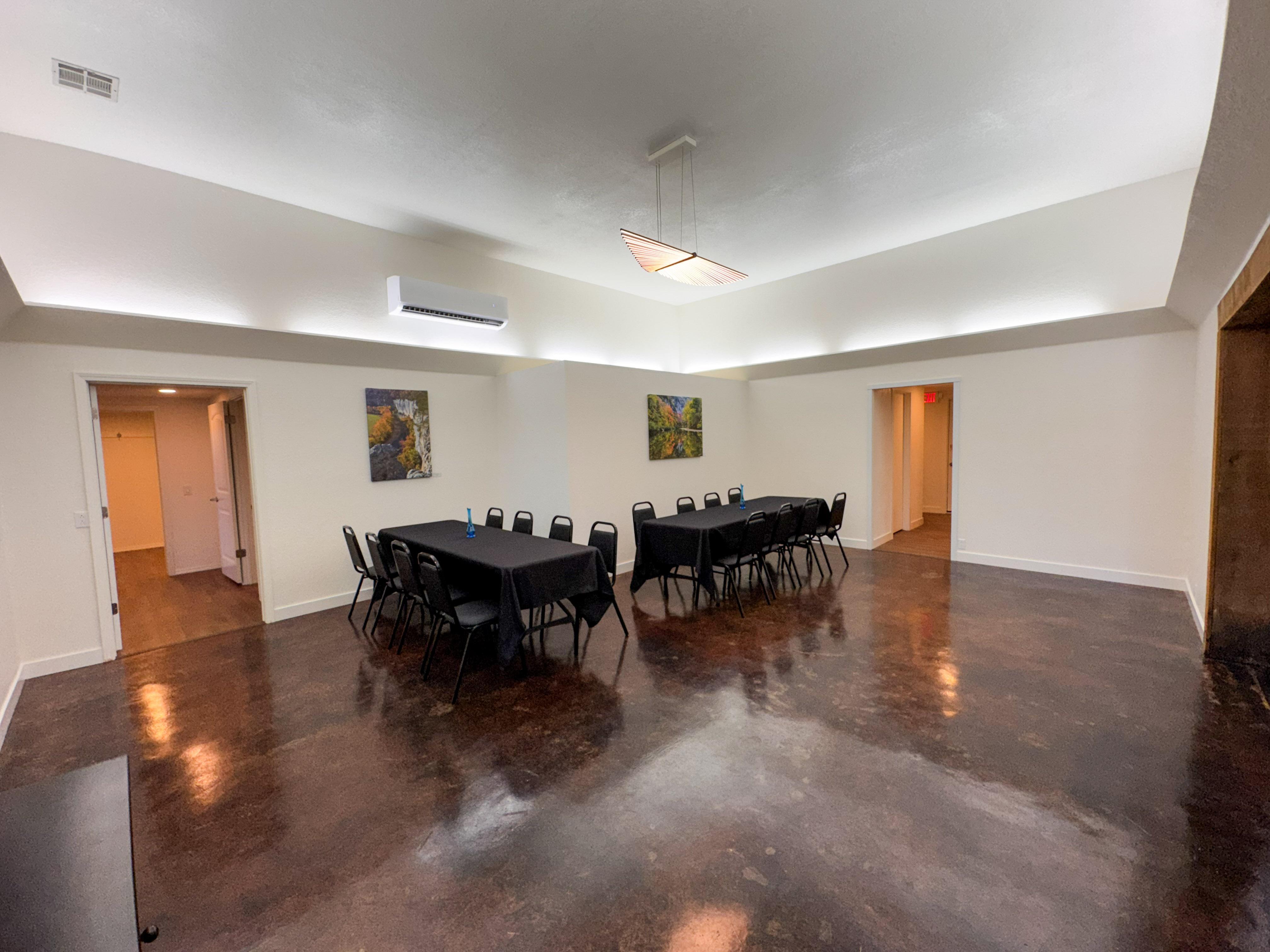 The Great Room can be used as you see fit. We find that long rectangular tables work best in this space. Lights can be dimmed. Down the hallway are two half restrooms, a coat closet, and a baby changing area.