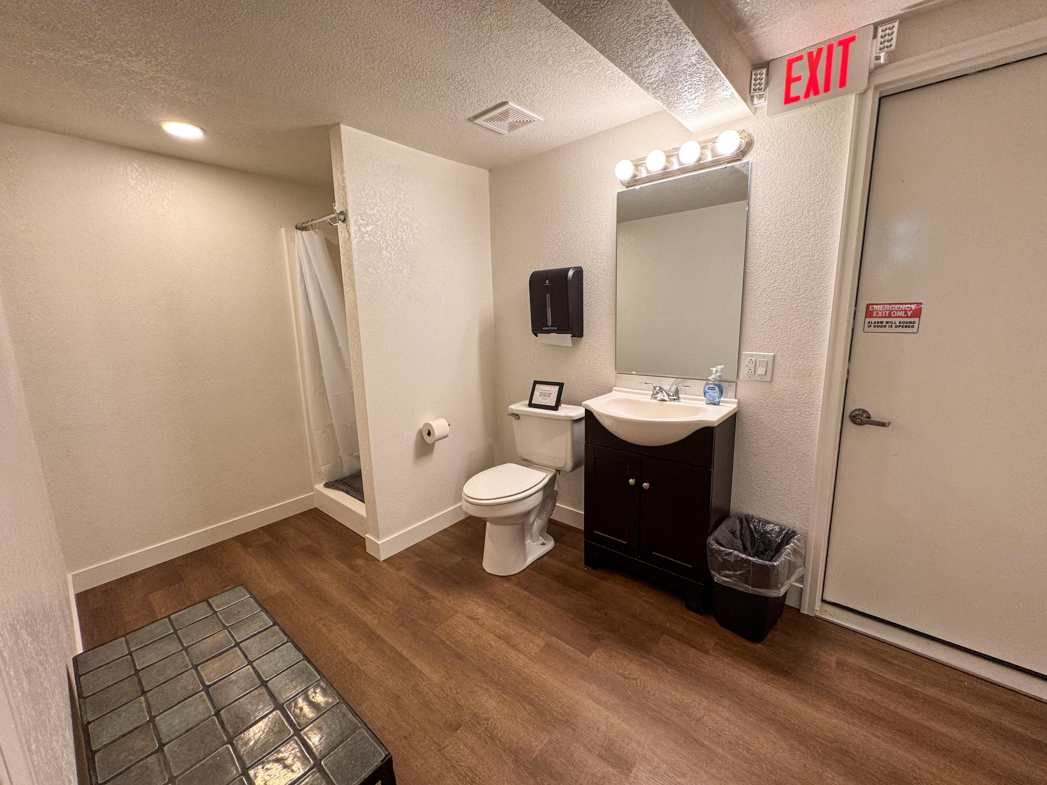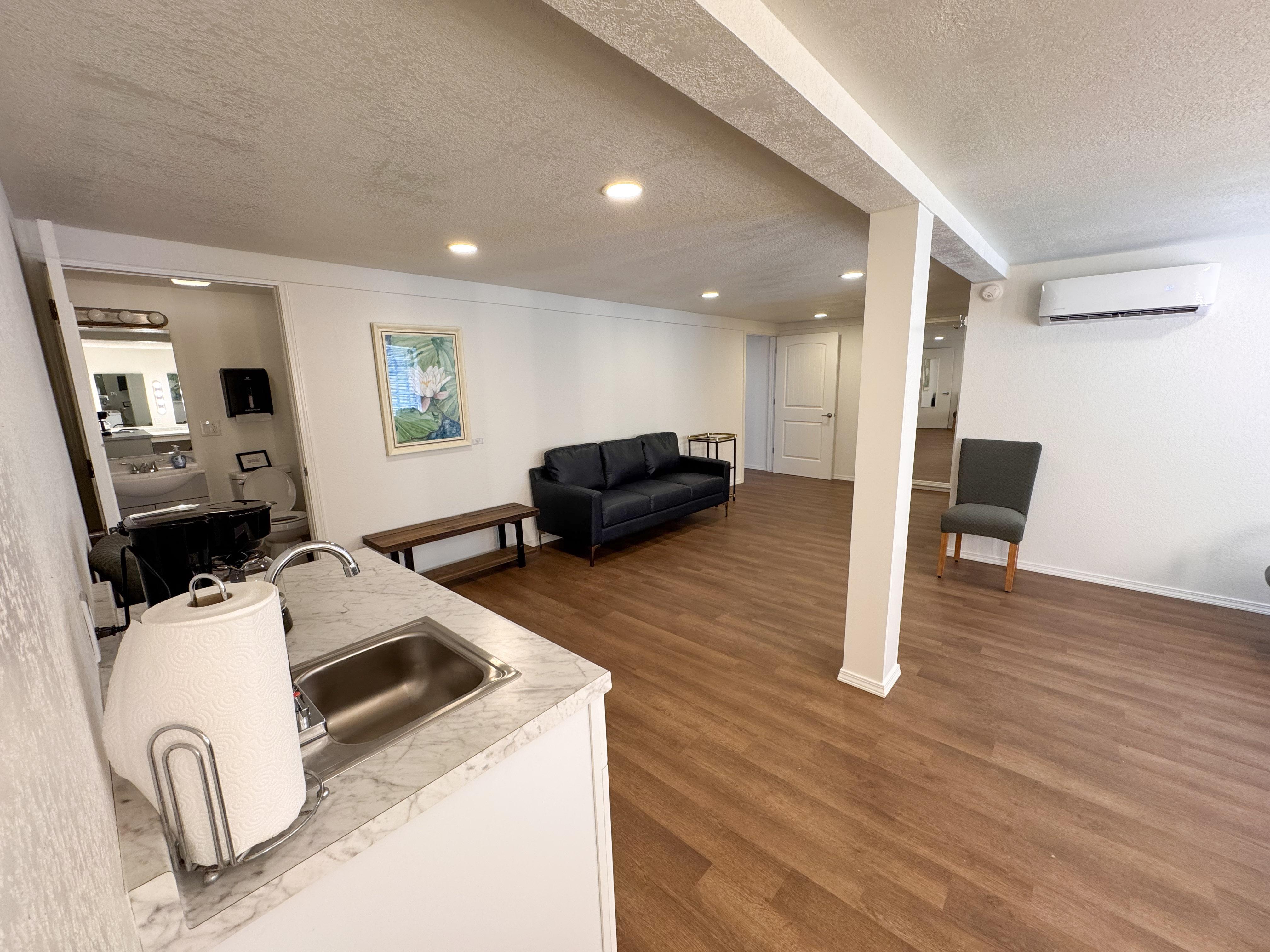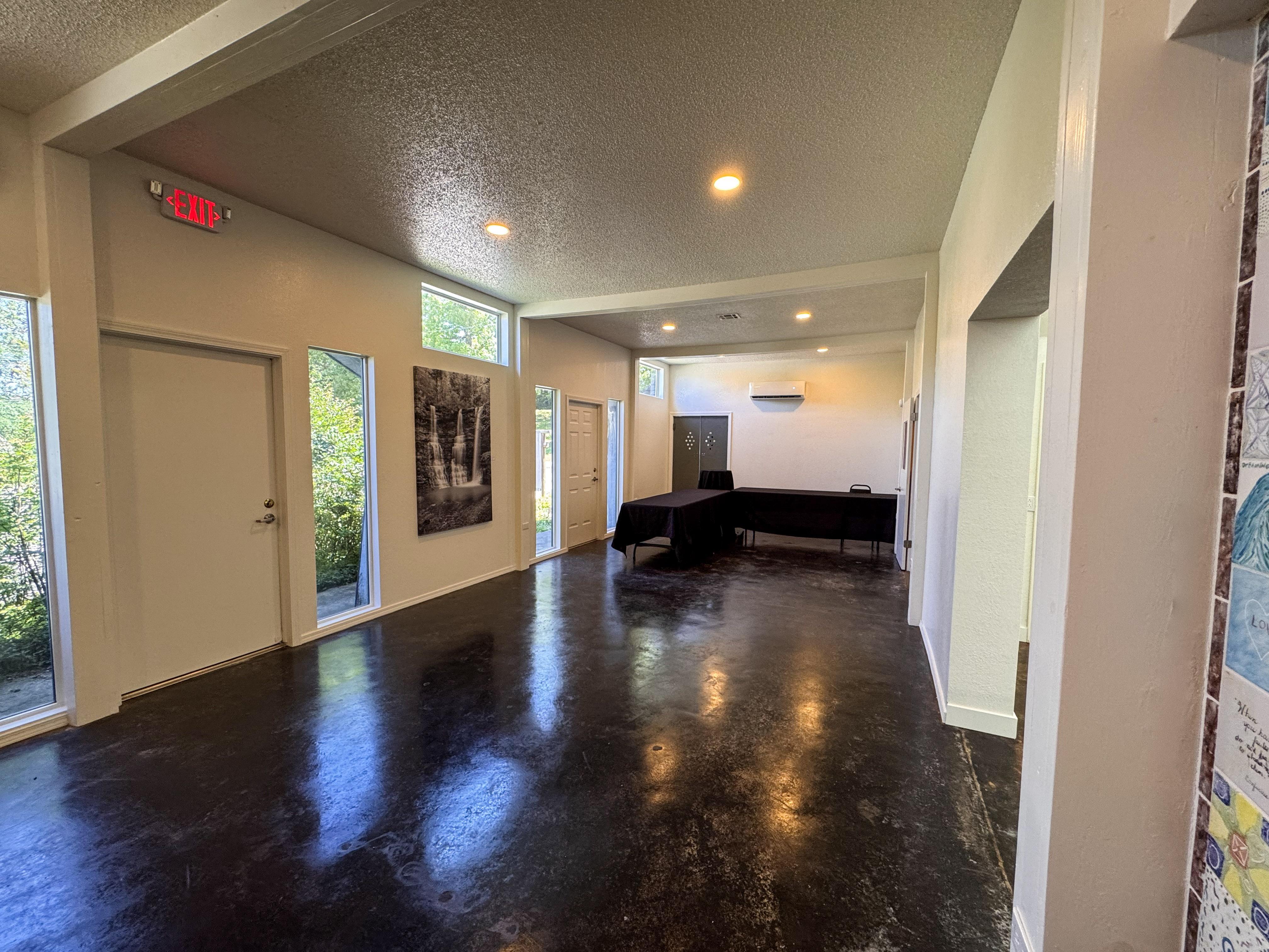 The Great Room can be used as you see fit. We find that long rectangular tables work best in this space. Lights can be dimmed. Down the hallway are two half restrooms, a coat closet, and a baby changing area.