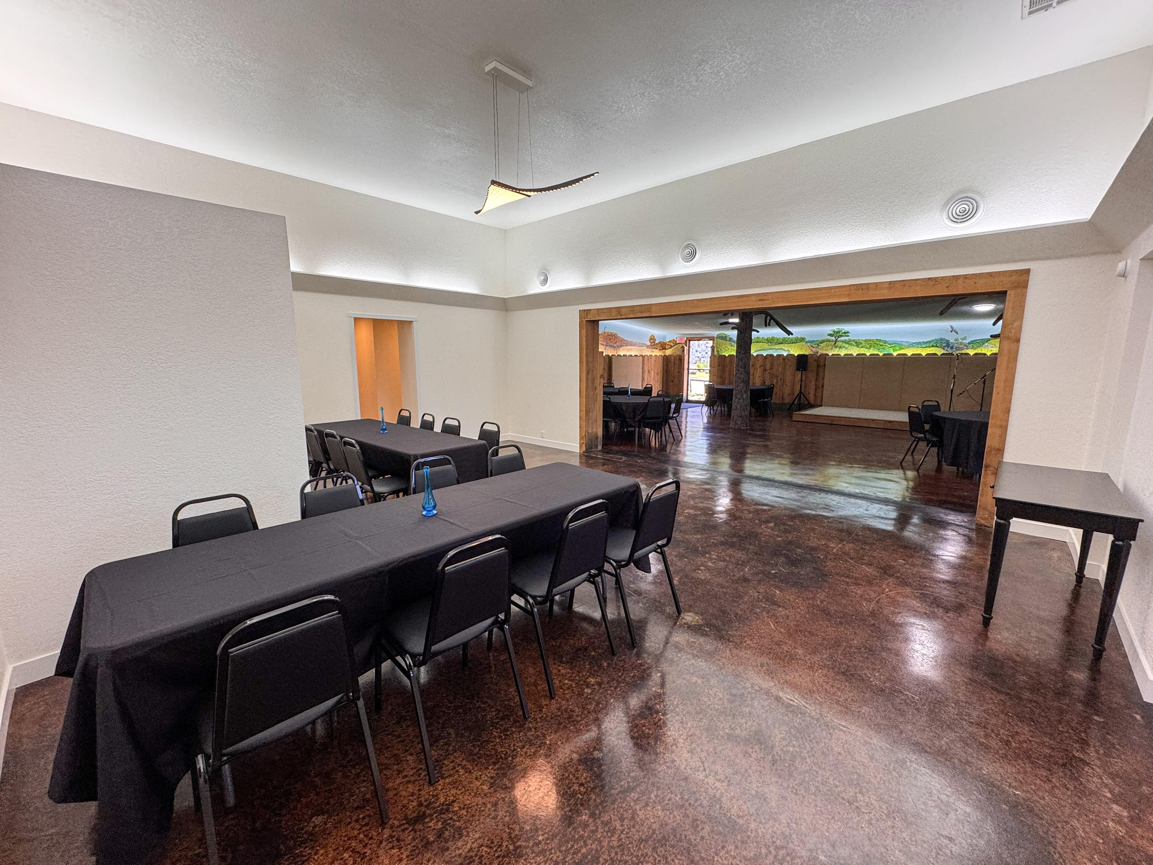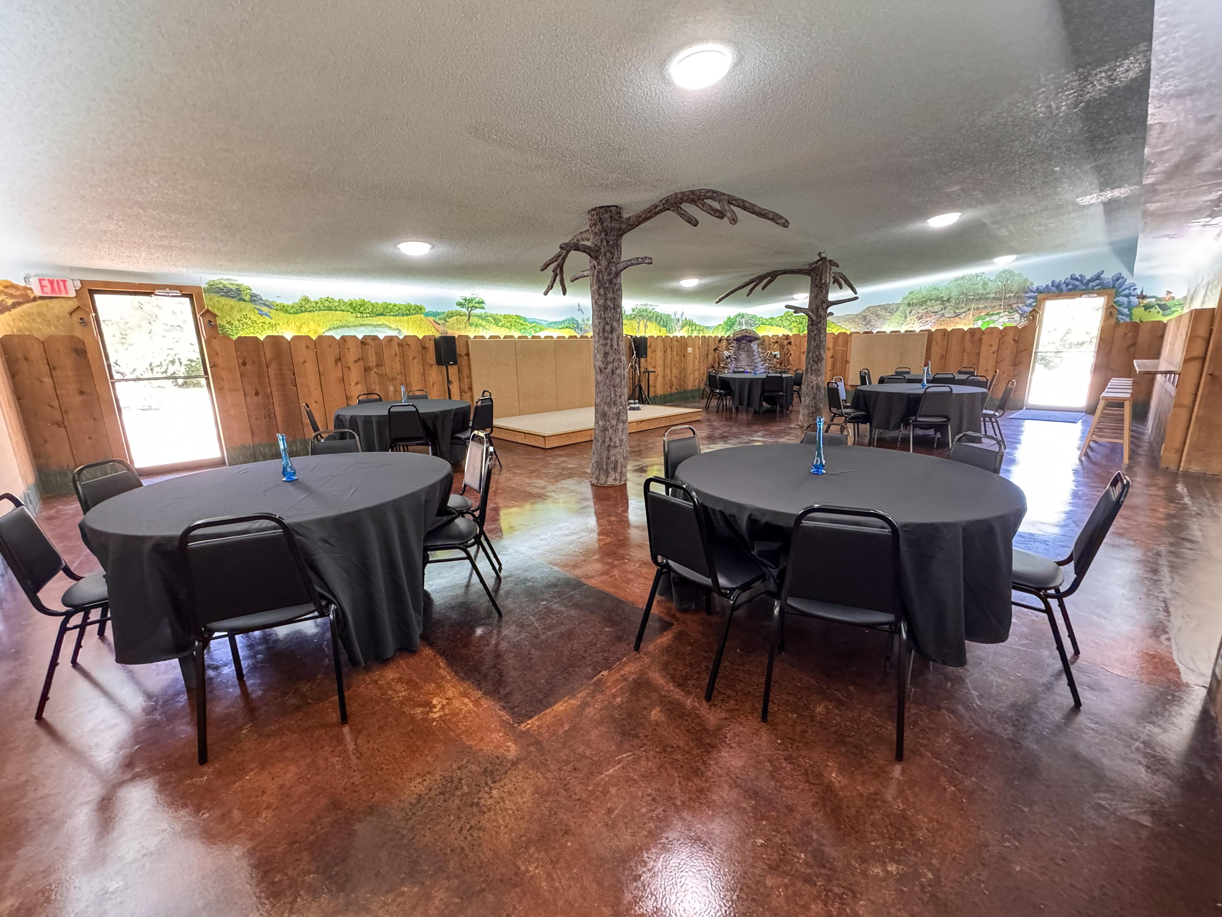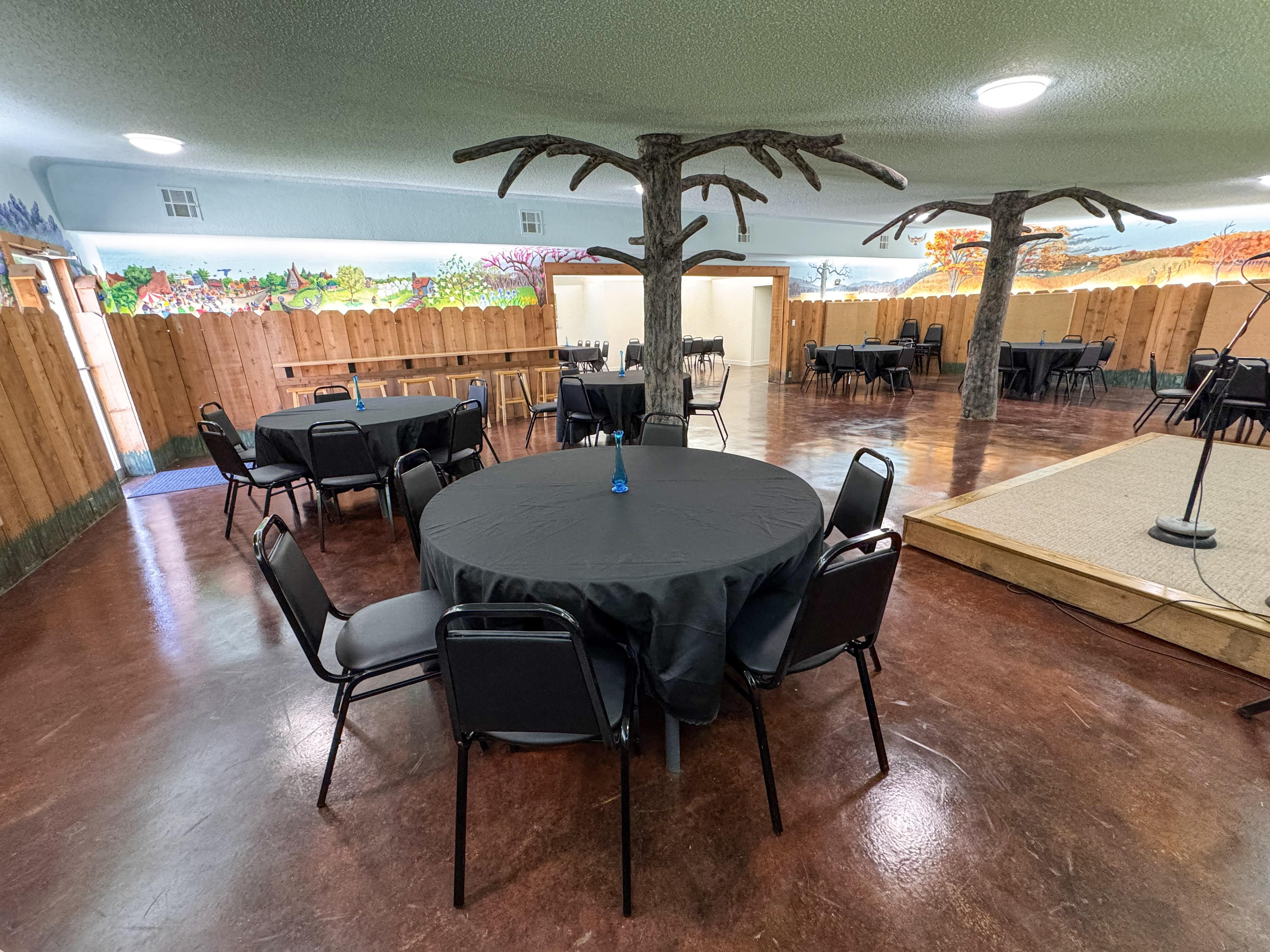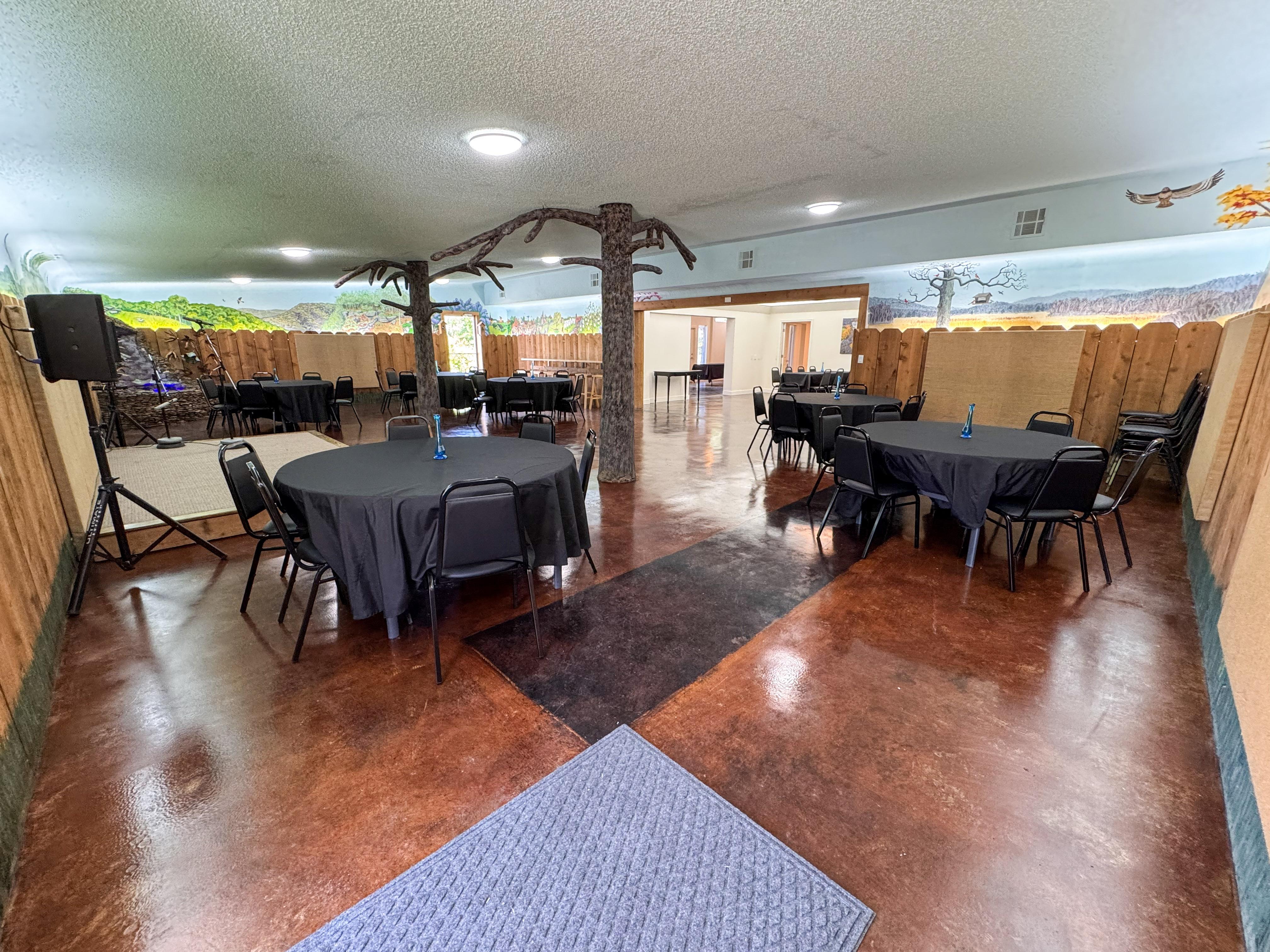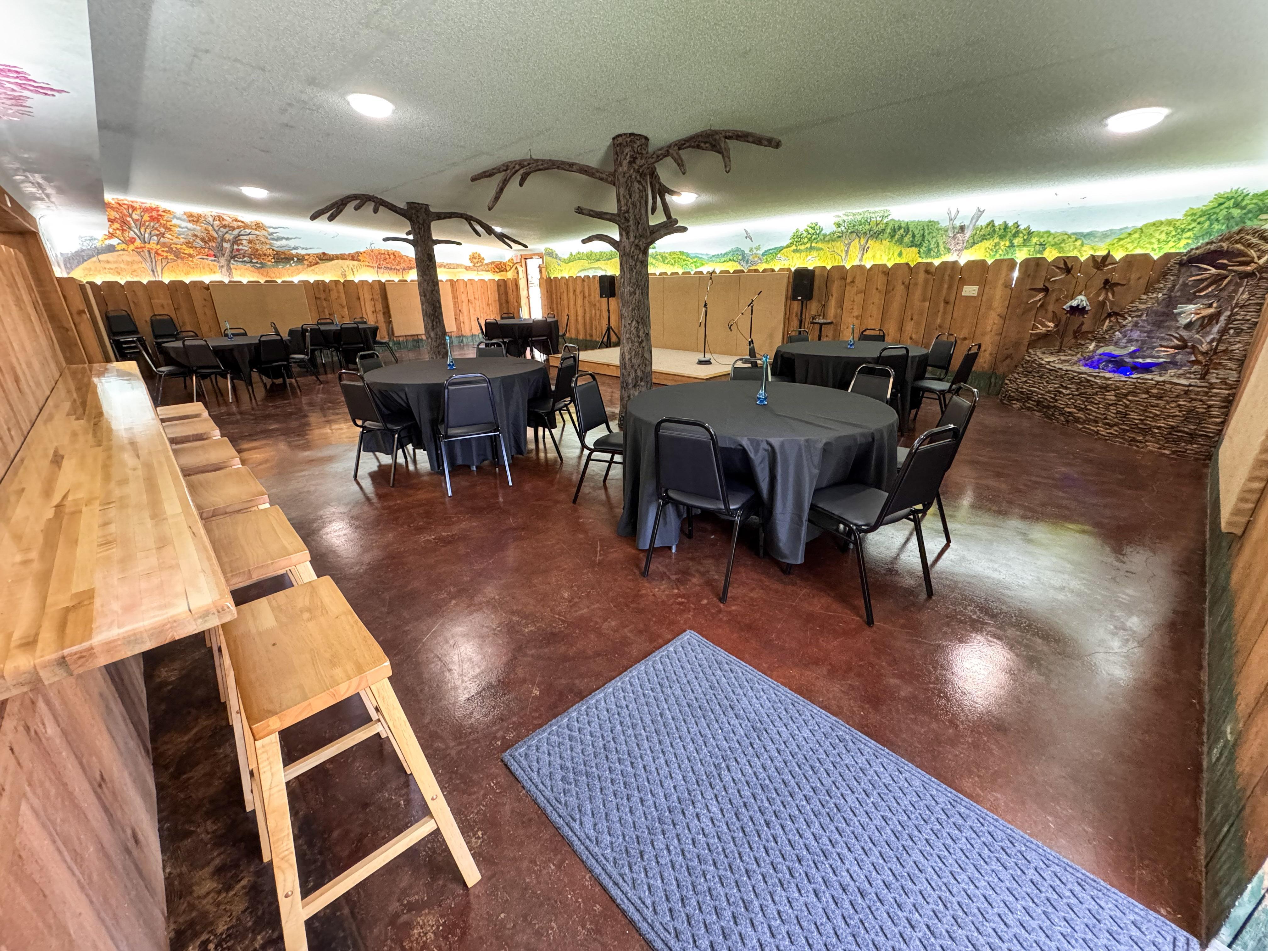 The Mural Room can be used how you see fit. We found that circular tables work best in this space. It features a stage, sound equipment, and an artful fountain. The two doors in this room will be your main points of entry to the event space. Out the side door is the designated smoking porch.