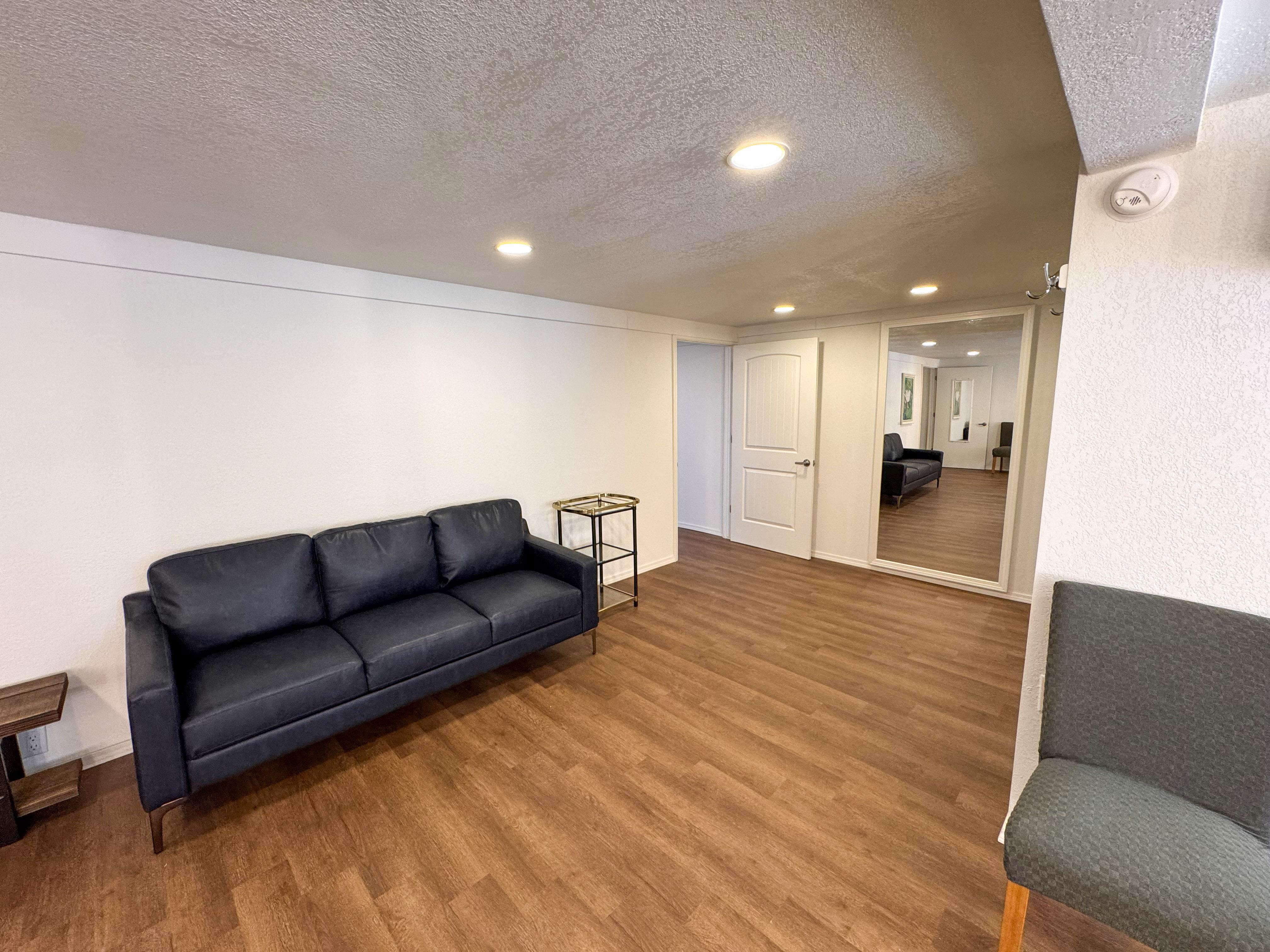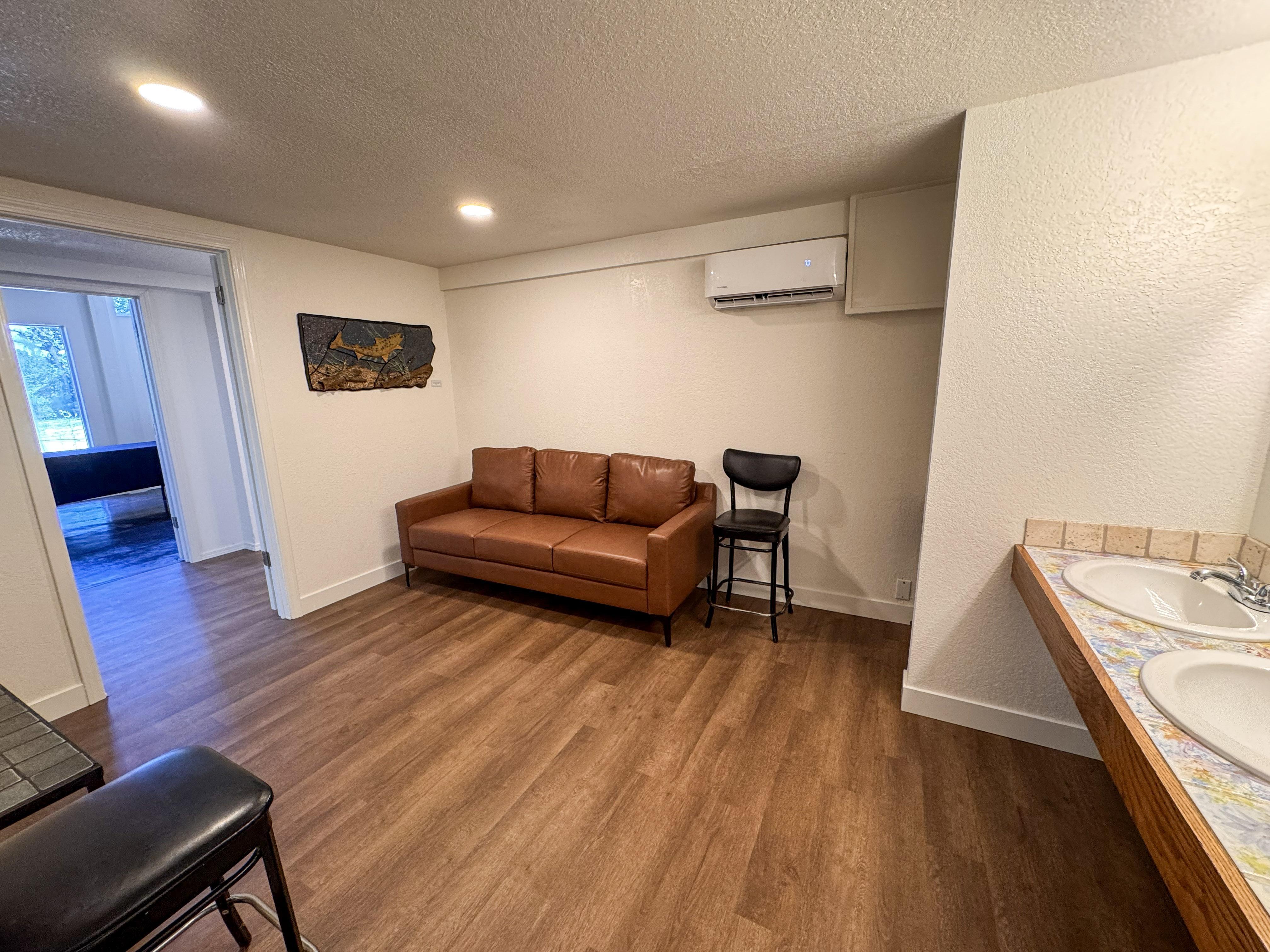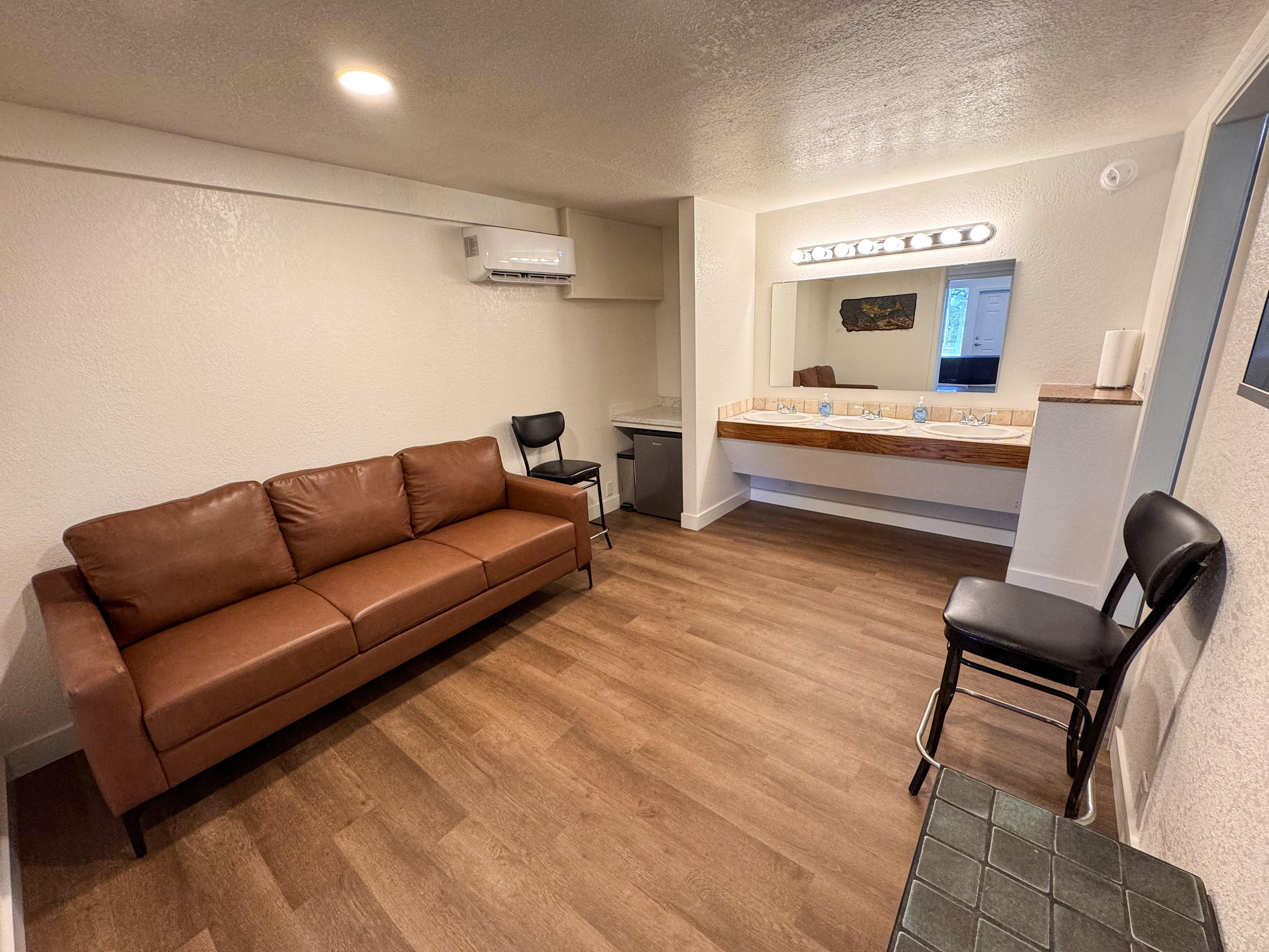 This is our Get Ready Suite 2. Built for grooms, but can be used how you see fit. Complete with seating area, flat screen TV, large mirrors, clothes hooks, mini fridge, coffee maker, one half bathroom, and one full bathroom with shower.