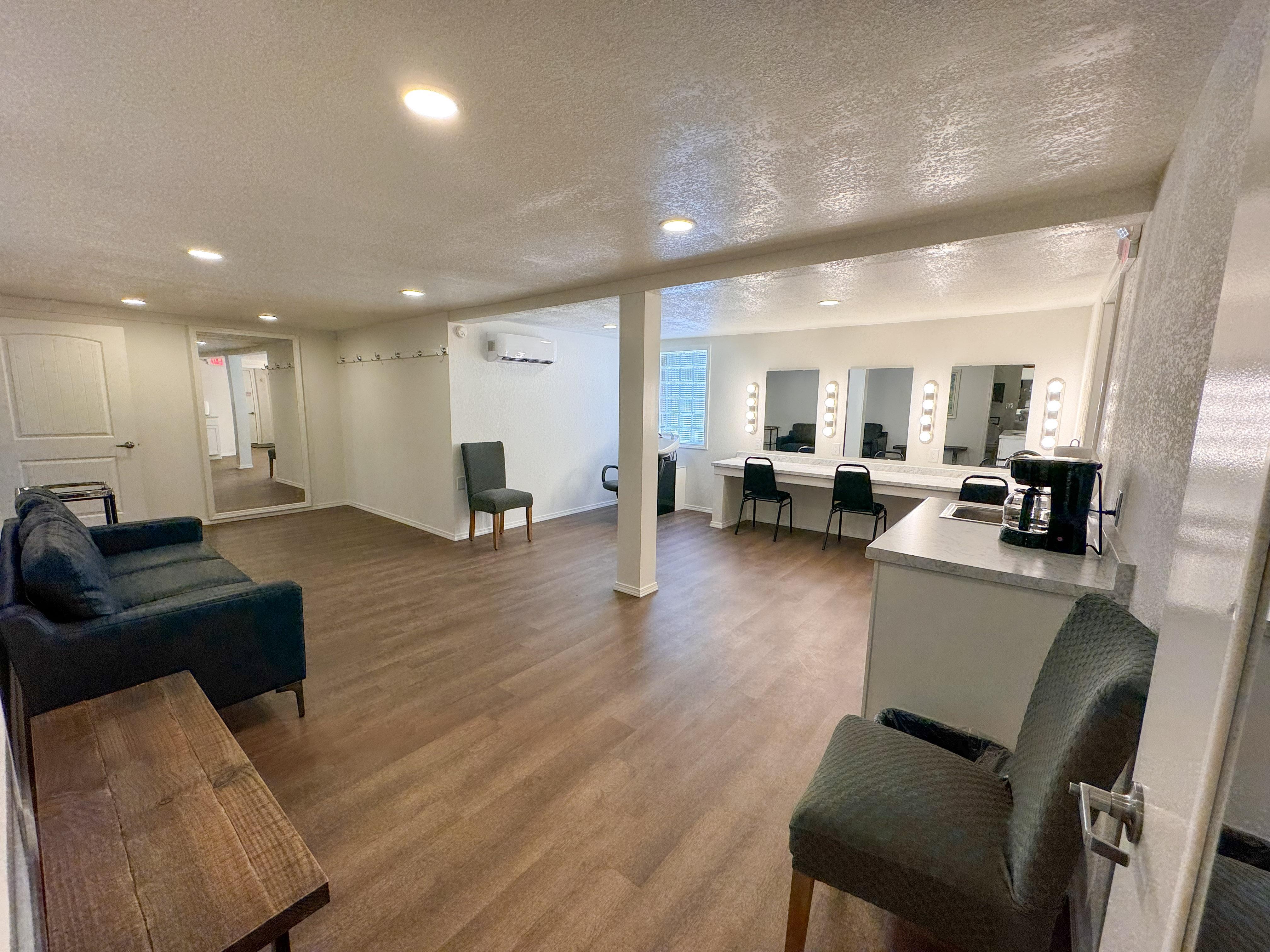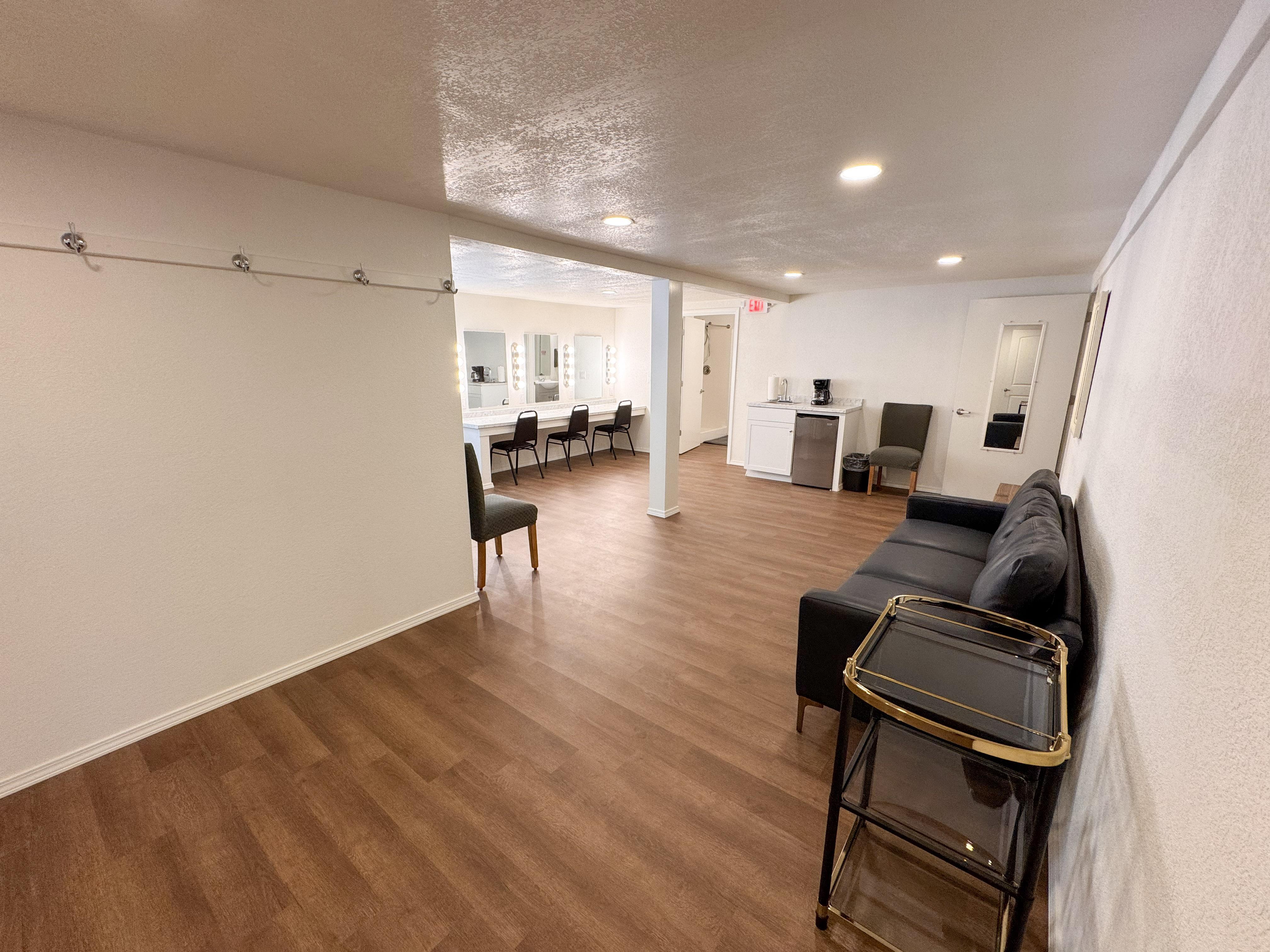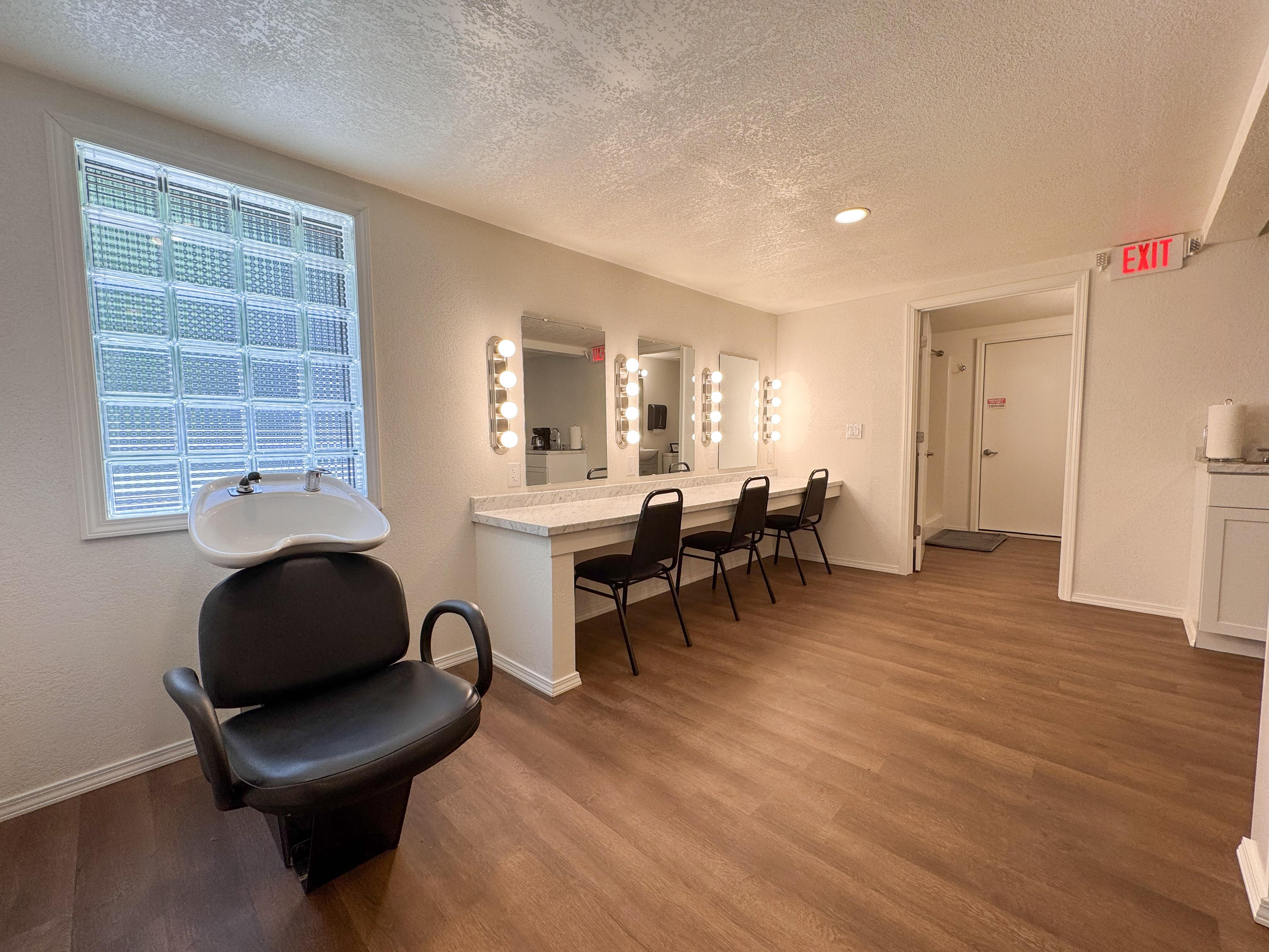Our Get Ready Suite 1 was built for bridal use, but you're welcome to use it how you see fit. Complete with seating area, large mirrors, makeup counters, plug-ins for hair tools, hair wash sink, clothes hooks, mini fridge, coffee maker, one half bathroom, and one full bathroom with shower.