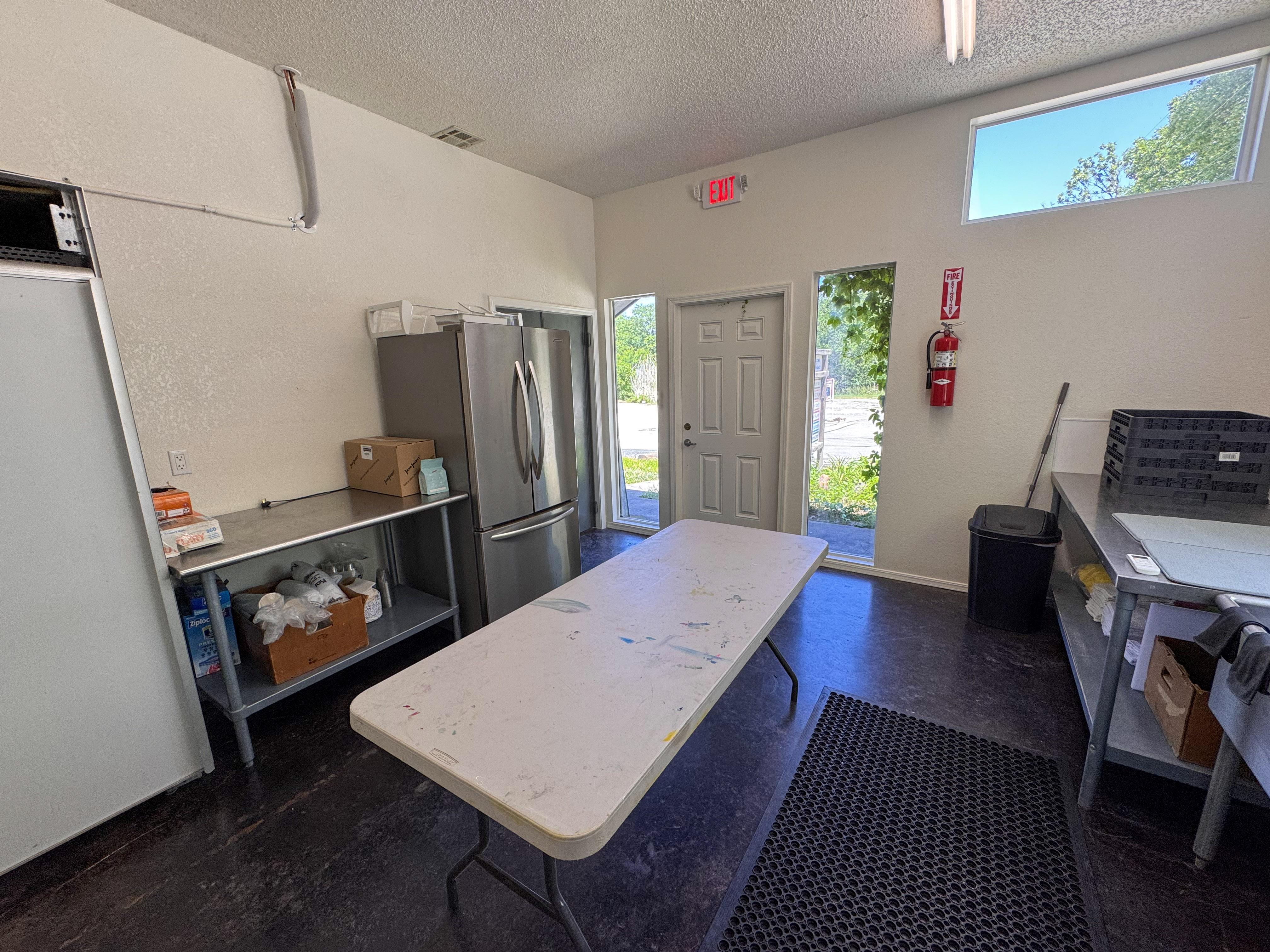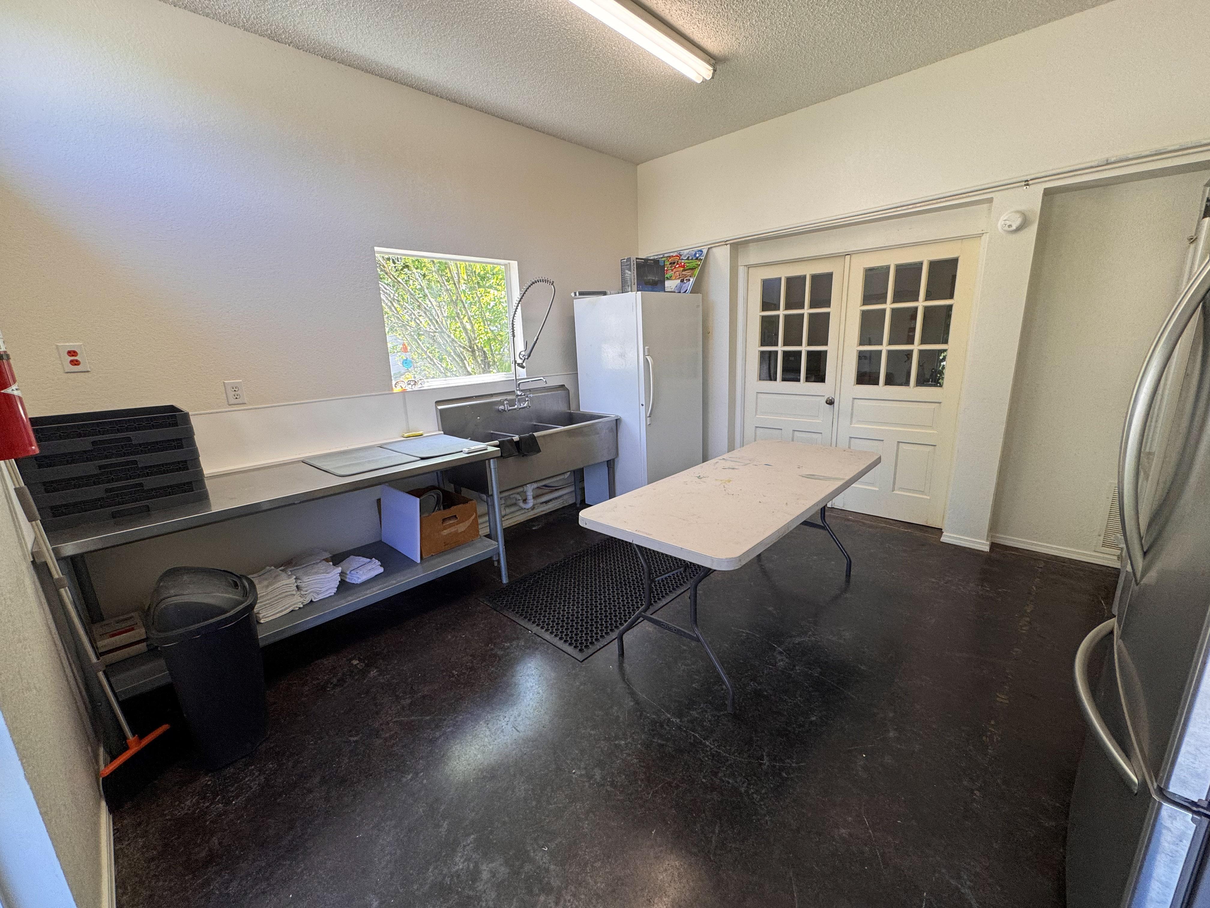 Everything you need to stage food for serving, refrigerator, freezer, microwave, triple sink, and tables for staging food. Please note this room is not to be used for cooking or prepping food.