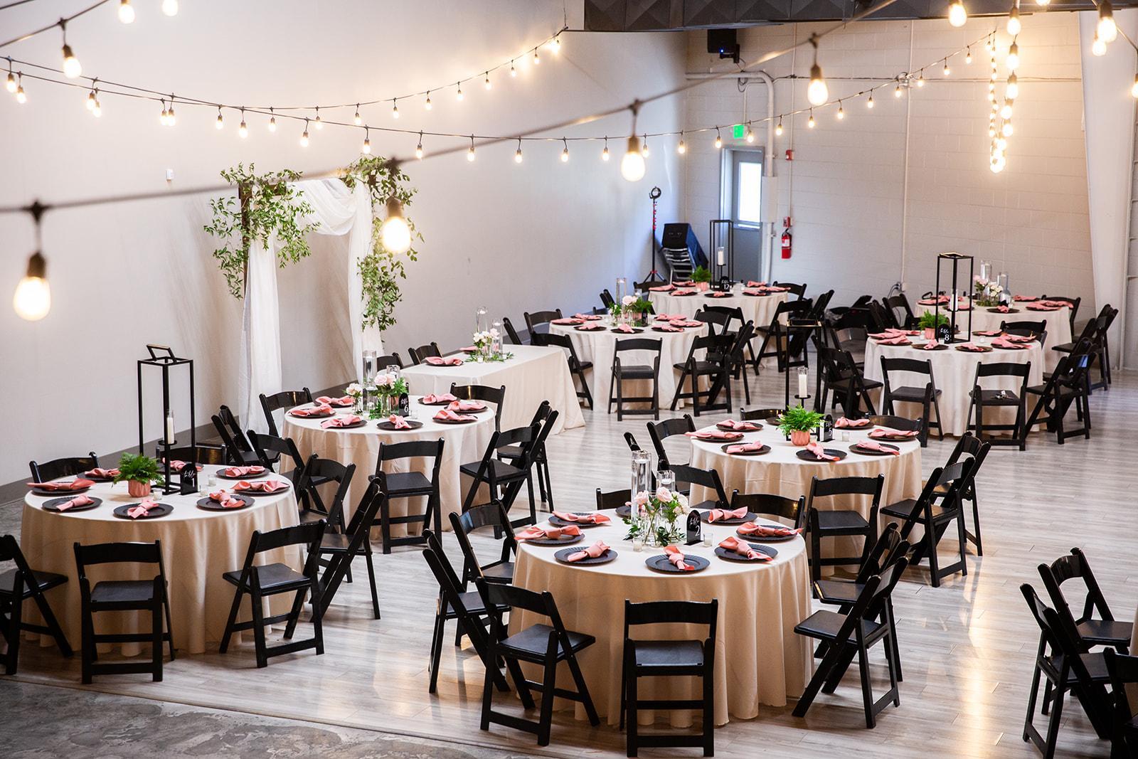 The Warehouse is a chic, modern-industrial space designed with 21-foot ceilings, polished concrete floors, block walls, and a warm palette of grays, taupes, and stained hardwood accents. Elegant bistro lighting is suspended throughout the venue, creating a charming outdoor ambiance within a stylish indoor setting.