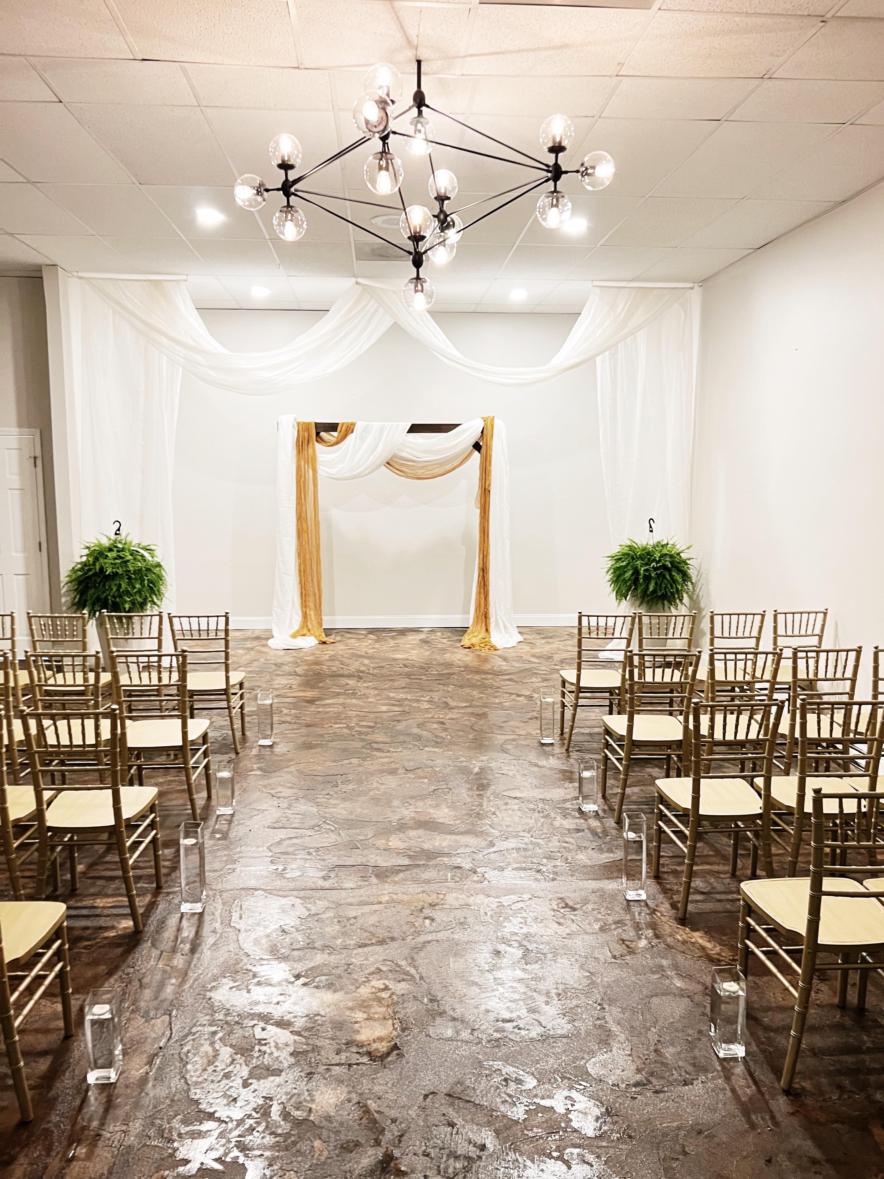 Our stunning new indoor ceremony space, nearing completion, is a masterpiece of modern design and industrial charm. Featuring soaring 20-foot ceilings, elegant draping, and contemporary chandeliers, the space exudes sophistication. Industrial elements such as block walls, steel beams, and polished concrete floors add a unique edge, while the impressive 50-foot aisle creates a dramatic entrance for your special day. Please note* Picture below is the previous Enchanted Room.
