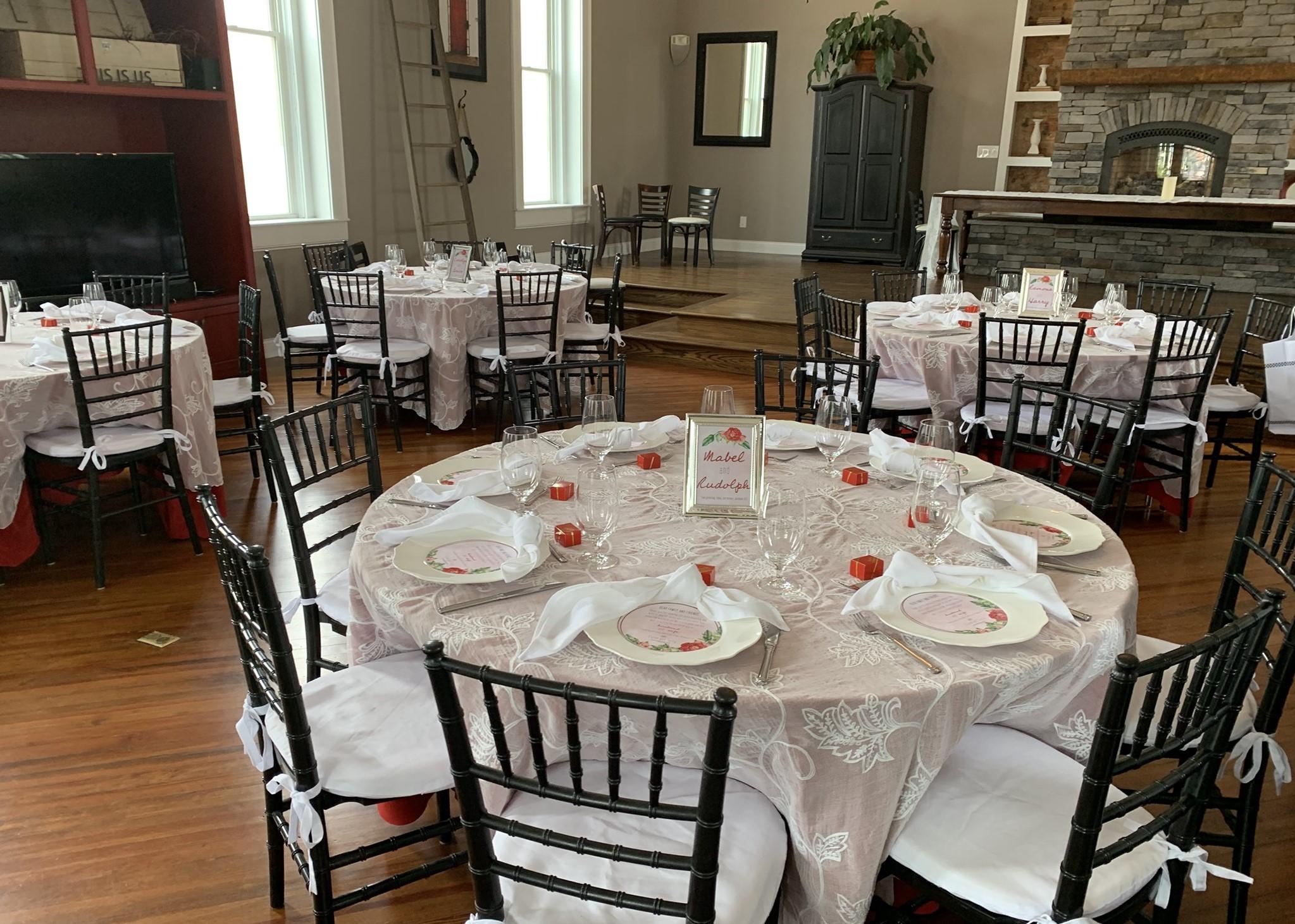 The 1859 can comfortably accommodate seated wedding celebrations with up to 100 guests. Standing gatherings can have up to 150 attendees. You'll enter through stately eight-foot-tall doors and arrive in the banquet hall. This space features towering 12-foot-tall windows and wooden flooring, in addition to a bell tower. The main room offers 2,500 square feet of space, in addition to a private patio. Your caterers are sure to appreciate a dedicated area where they can put the finishing touches to your meal. Parking is available on-site for guests who drive to the venue.