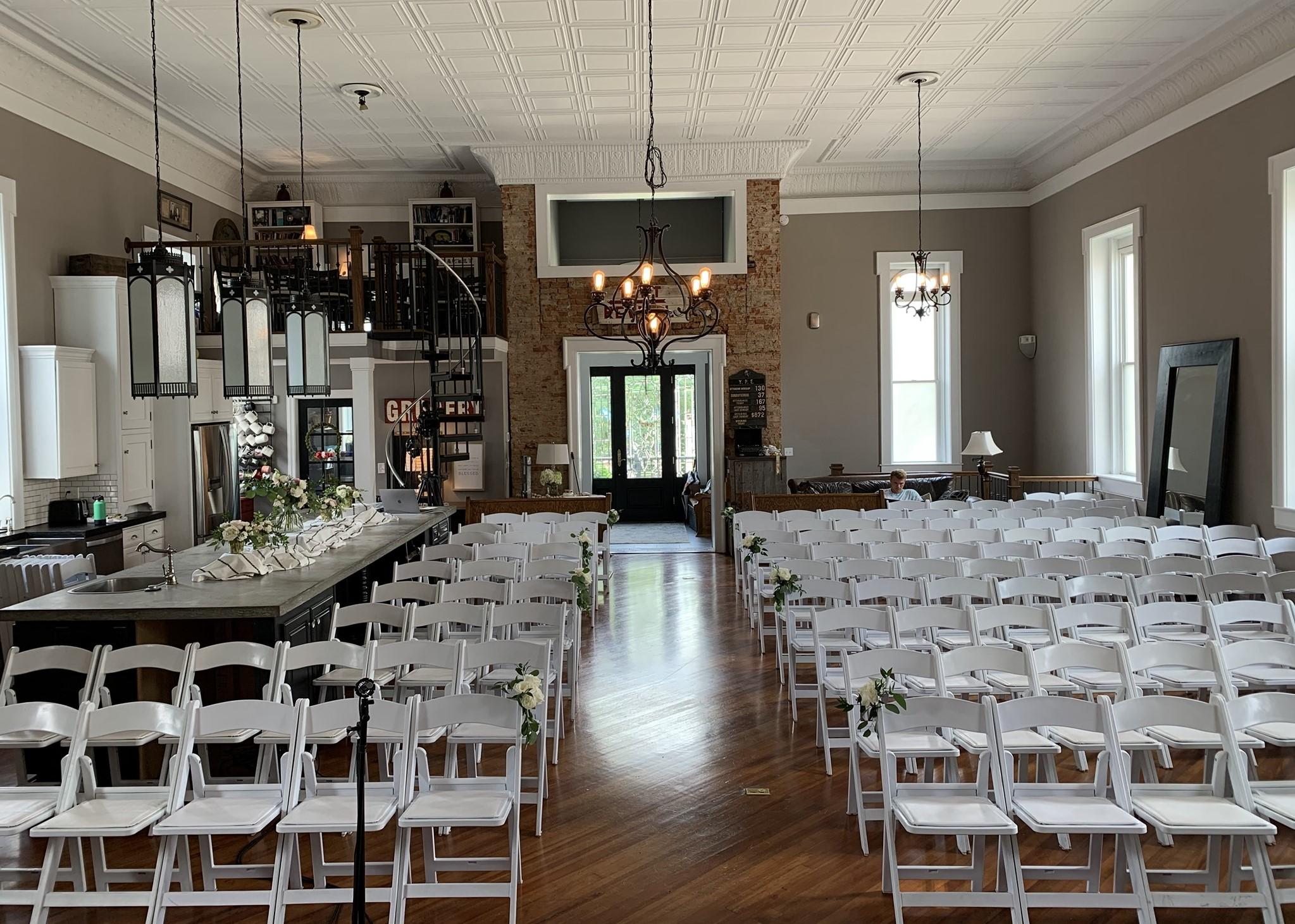 The 1859 is ideal for both large and smaller, more intimate weddings, hosting up to 100 guests. As you enter through the chapel’s large 8 ft. door, couples and guests are met by a stunning and welcoming room. Featuring inspiring 12 ft. glass windows, a classic bell tower, and wooden flooring, this venue is an elegant space for those seeking to get hitched in a loving and quaint environment.