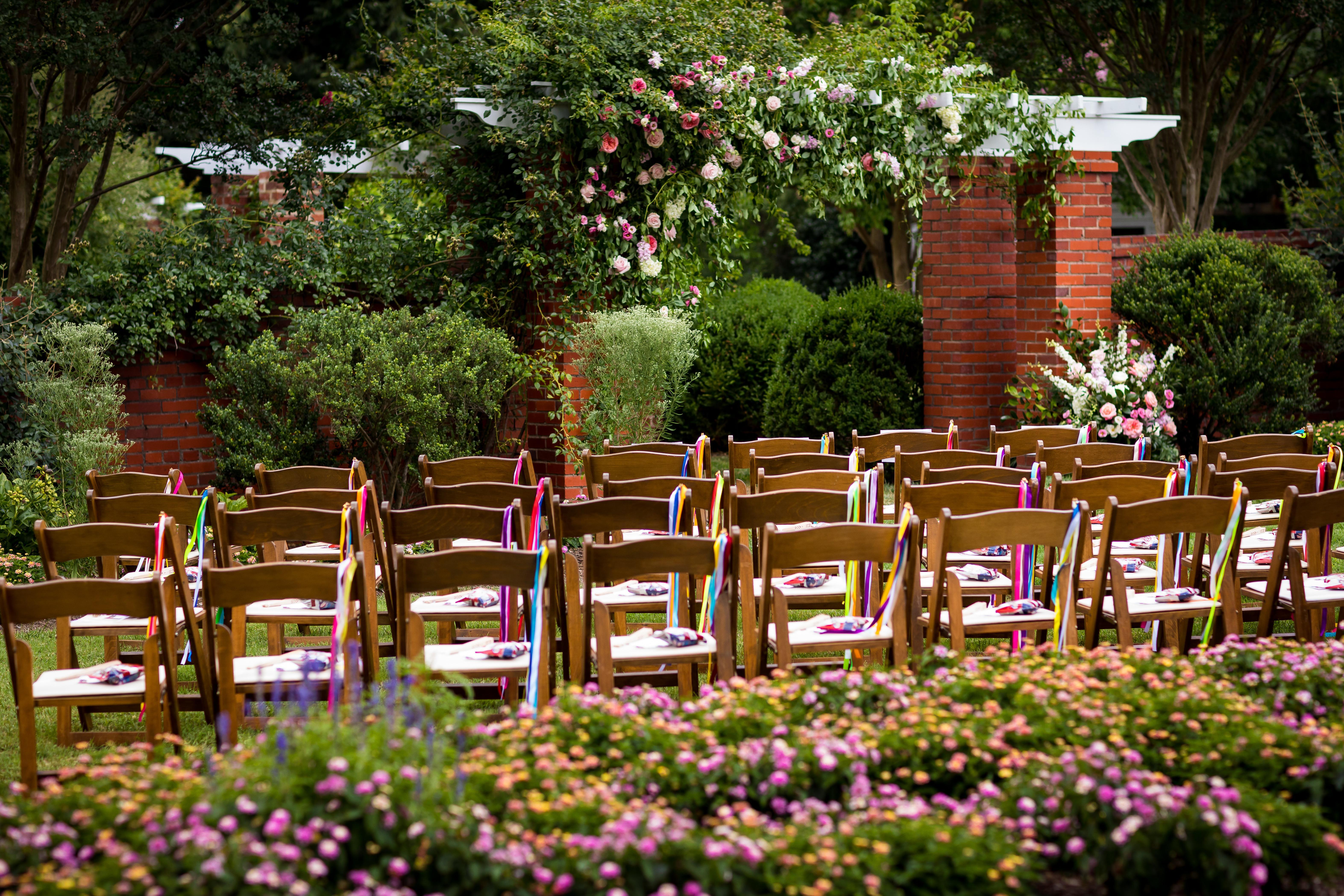 - Surrounded by lush gardens - Trellises framing your altar - Charming brick pathway leading to the altar