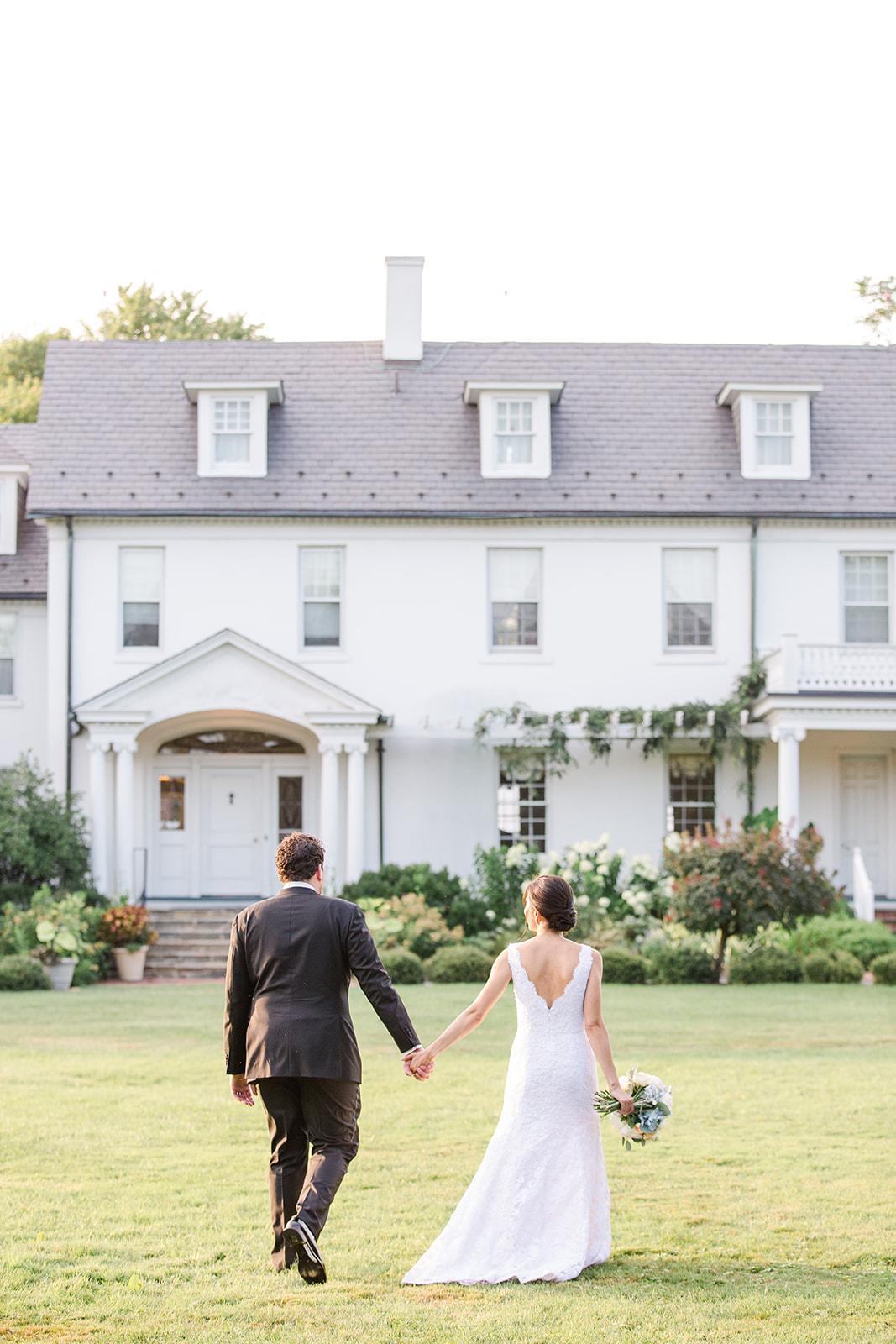 A picturesque ceremony setting with lush grass, sweeping vistas of the Potomac, and the grandeur of the manor house.
