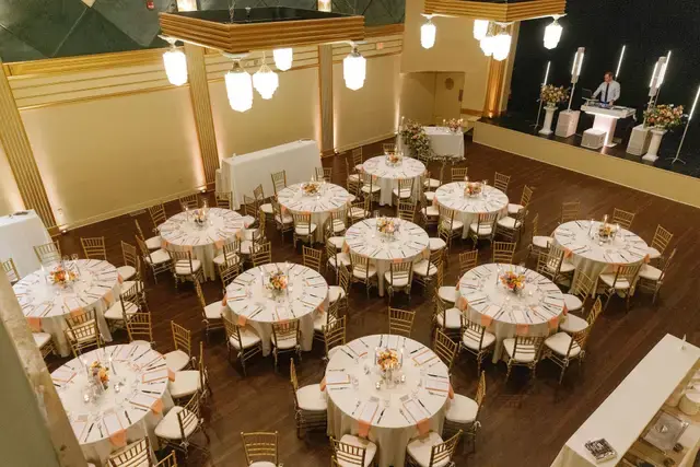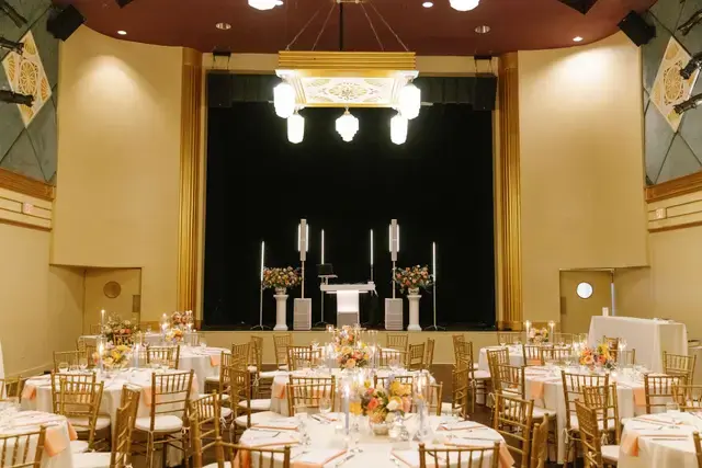 2,300 sqft grand ballroom with a 340 sqft main stage for award banquets, presentations or entertainment, A fully-equipped cinema with stadium seating, surround sound, AV equipment, DVD + LCD projectors and wireless microphones, A stylish lounge with screen and projector (not handicap accessible), Vintage exterior marquee to publicize your event, A spacious main lobby, ideal for registration + welcome information, Wireless internet throughout, Handicap accessible, Preferred recommendations for local AV technicians for audio visual needs.