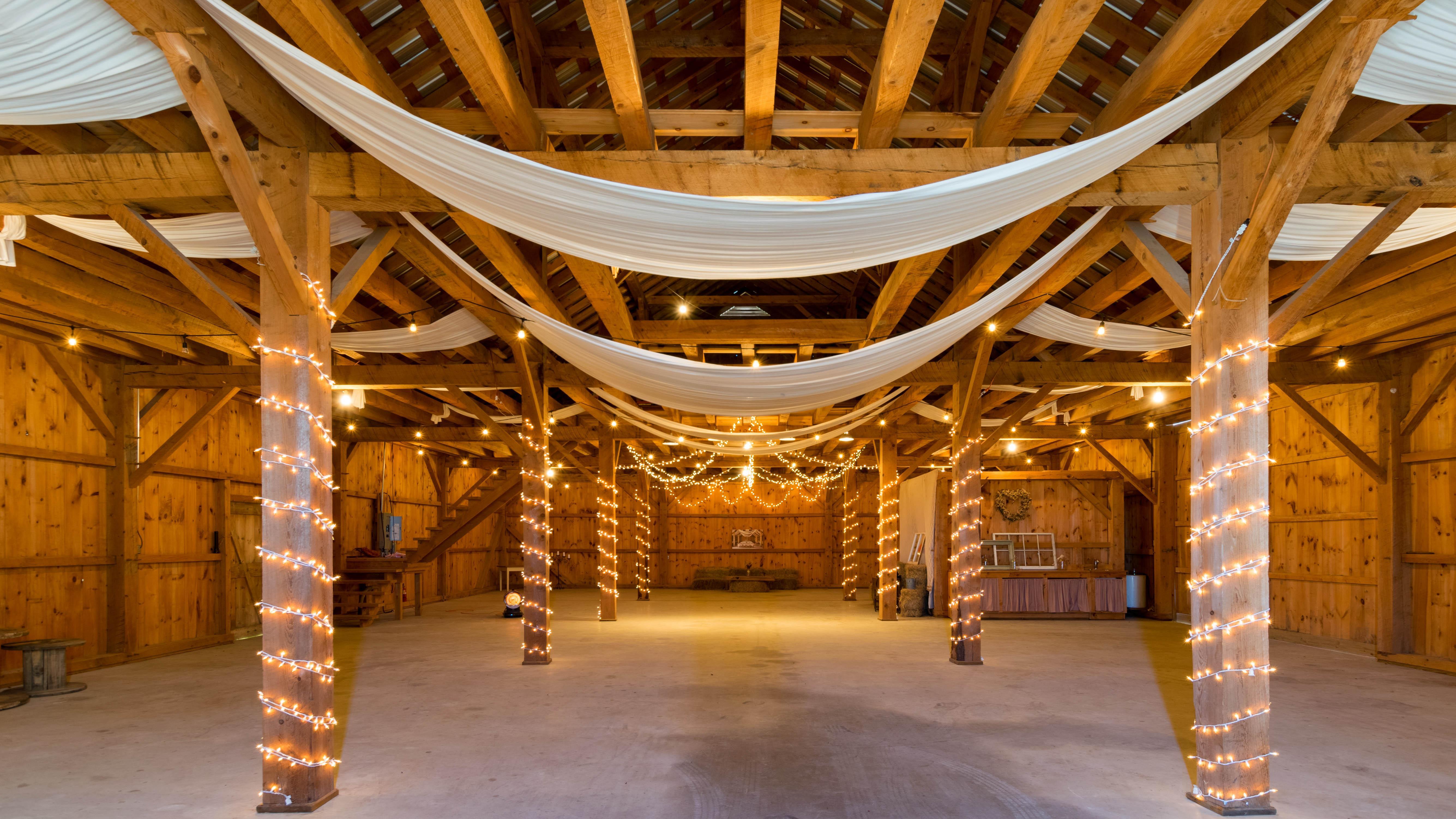 With its' exposed wood walls and heavy timber construction, The Amish Barn has an aura that is as warm as it is lovely and authentic. Its open floor plan features sweeping muslin draping about the beams, a (movable) bar, and countless lights to make it twinkle. The Amish Barn at Edge's grounds is home to much more than the barn itself, however. Our acreage includes a bell tower, a small vineyard, one blacksmith shop, and a cozy farmhouse for our guests to stay in!