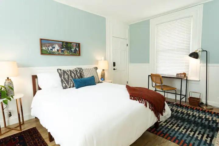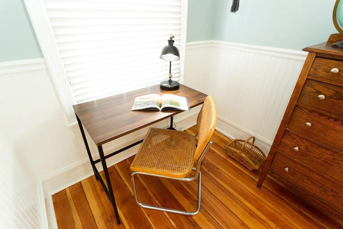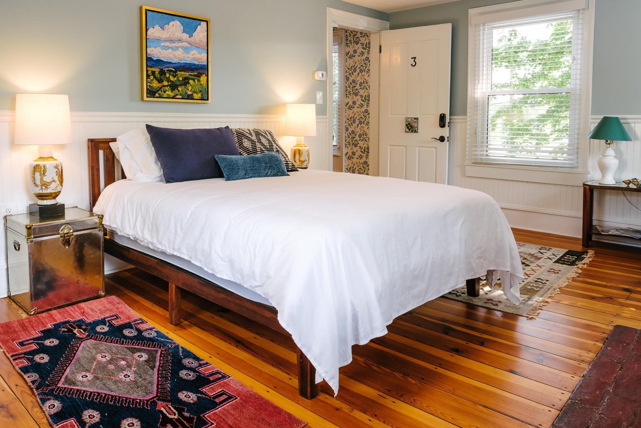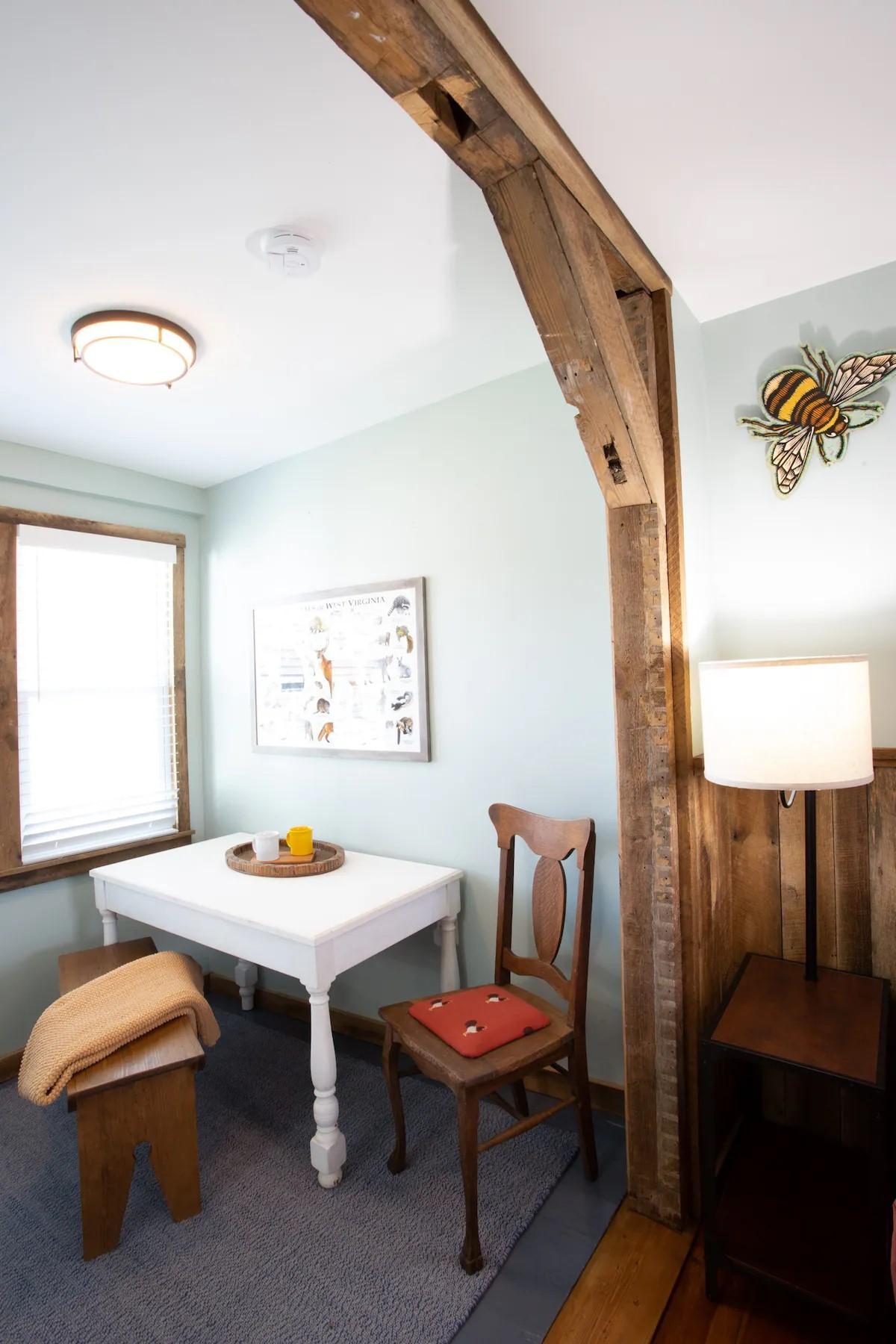 The Sassafras Suite is fondly referred to as the rustic suite with its exposed, original post & beam construction timbers, brick wall and reclaimed wood wainscoting. It is by far the most unique space at Basswood. The Sassafras Suite features a bedroom, separate living space and sitting table overlooking the Cacapon River. In the bedroom you'll find a dreamy queen size bed and a connected private bathroom stocked with all basic amenities.