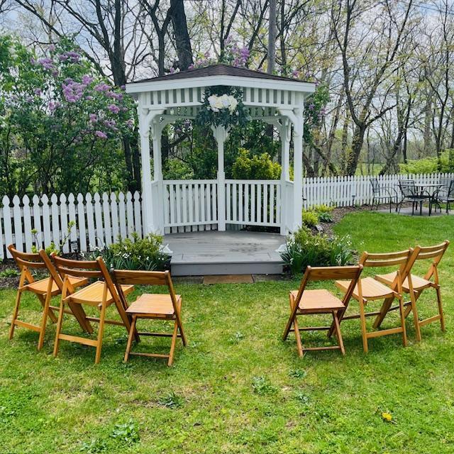 As with all the rooms at Basswood, this backyard gazebo has been lovingly painted and restored. Looking out over the Cacapon River, the Gazebo could not make for a more picturesque location for your wedding with more than adequate space for both couple and officiant. The yard is beautifully landscaped featuring flowering plants and tall, mature trees. Easily accommodating up to 50 guests the Gazebo at The Appalachian Wedding Chapel is a lovely space for any small to mid-size wedding.