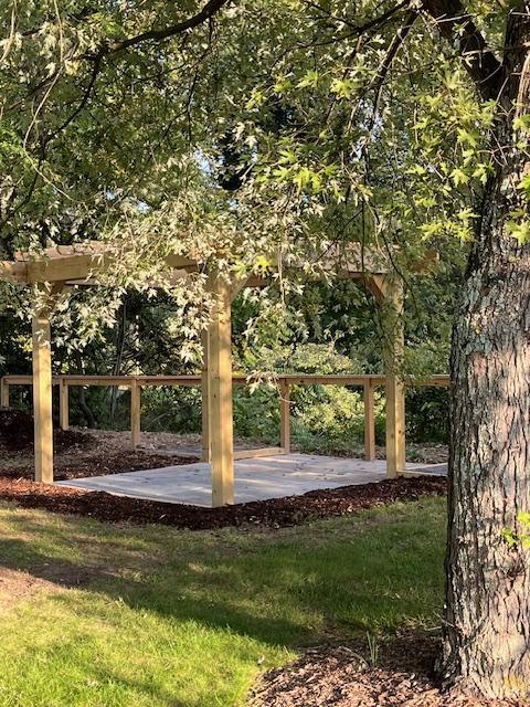 Newly constructed, the arbor / pergola features a large hardscape patio overlooking the Cacapon River for ceremonies, and a comfortably shaded grassy area for guests. Beautifully framed by tall, mature trees and landscaped native shrubs and beds, this has quickly become our most popular space for weddings.