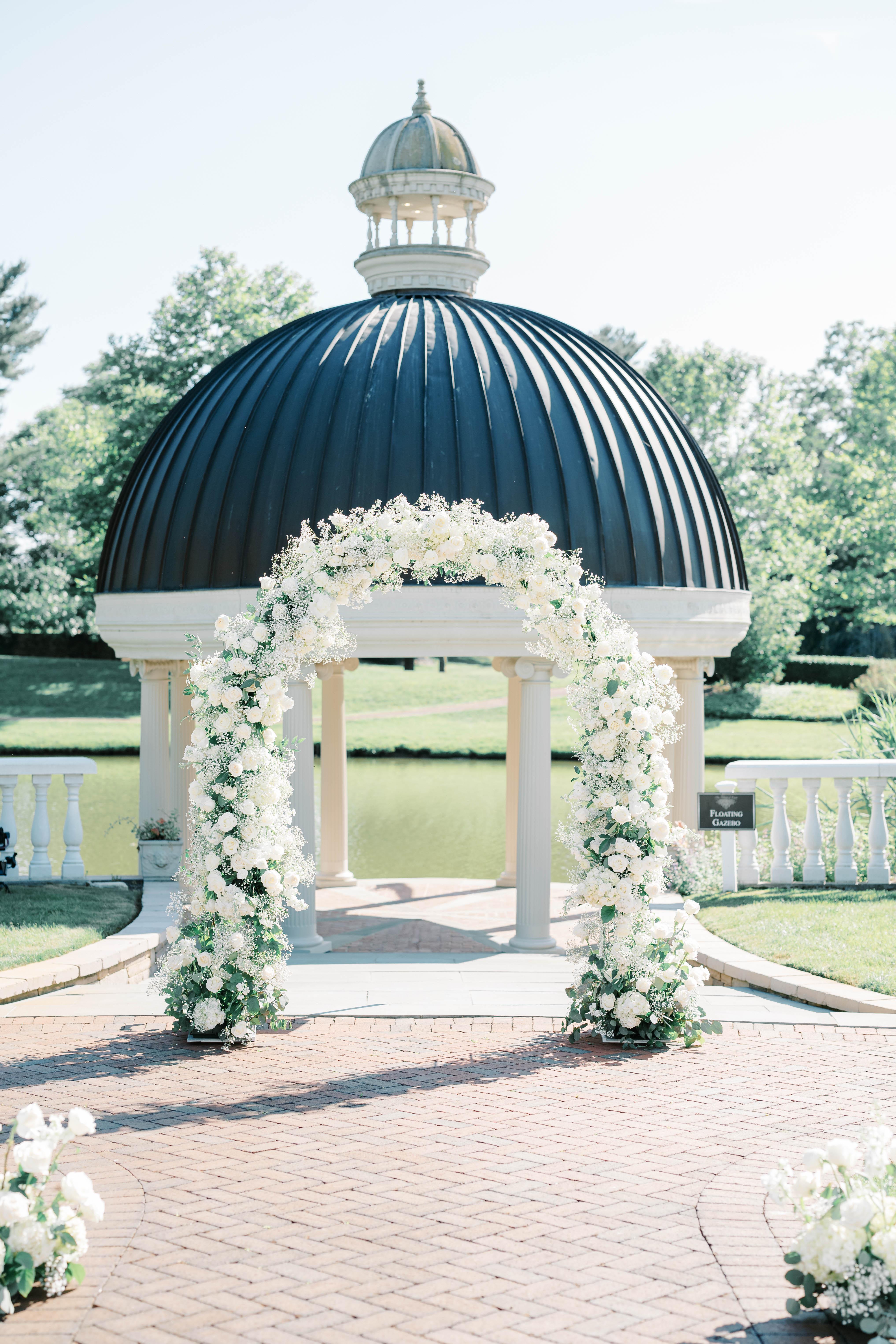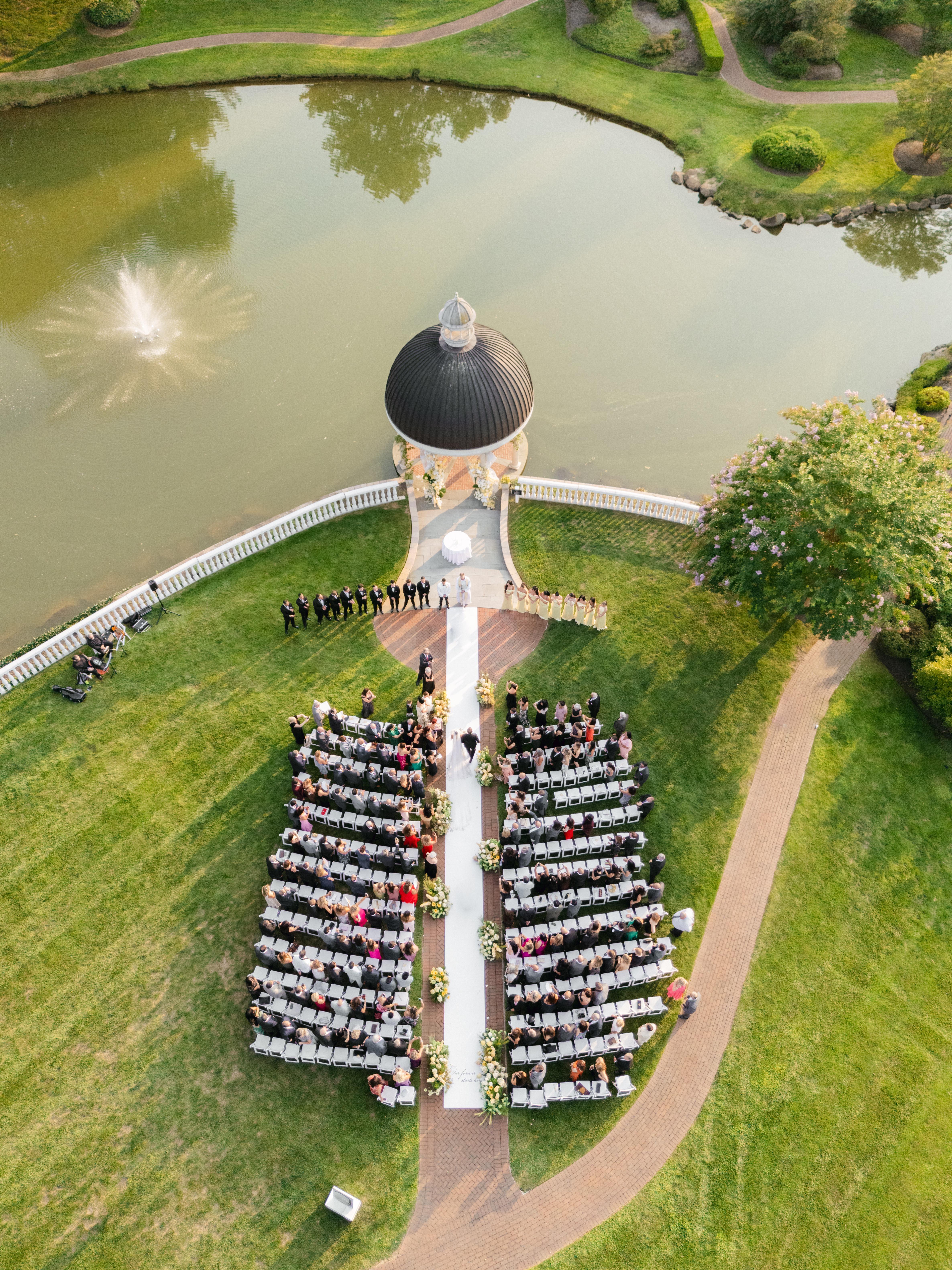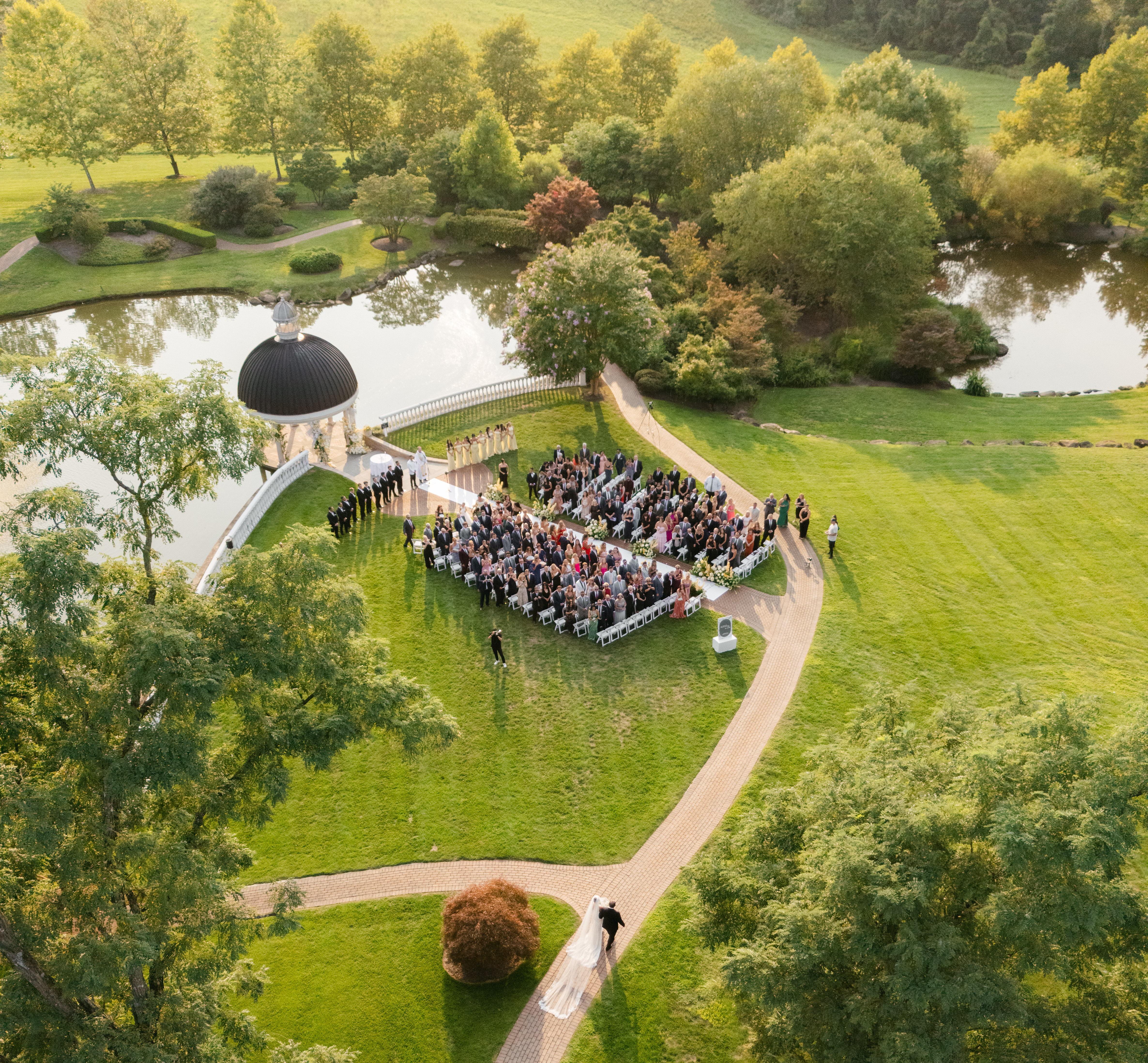 The Floating Gazebo creates a magical space for your ceremony, offering an intimate atmosphere where the altar is framed by the peaceful pond and lush greenery.