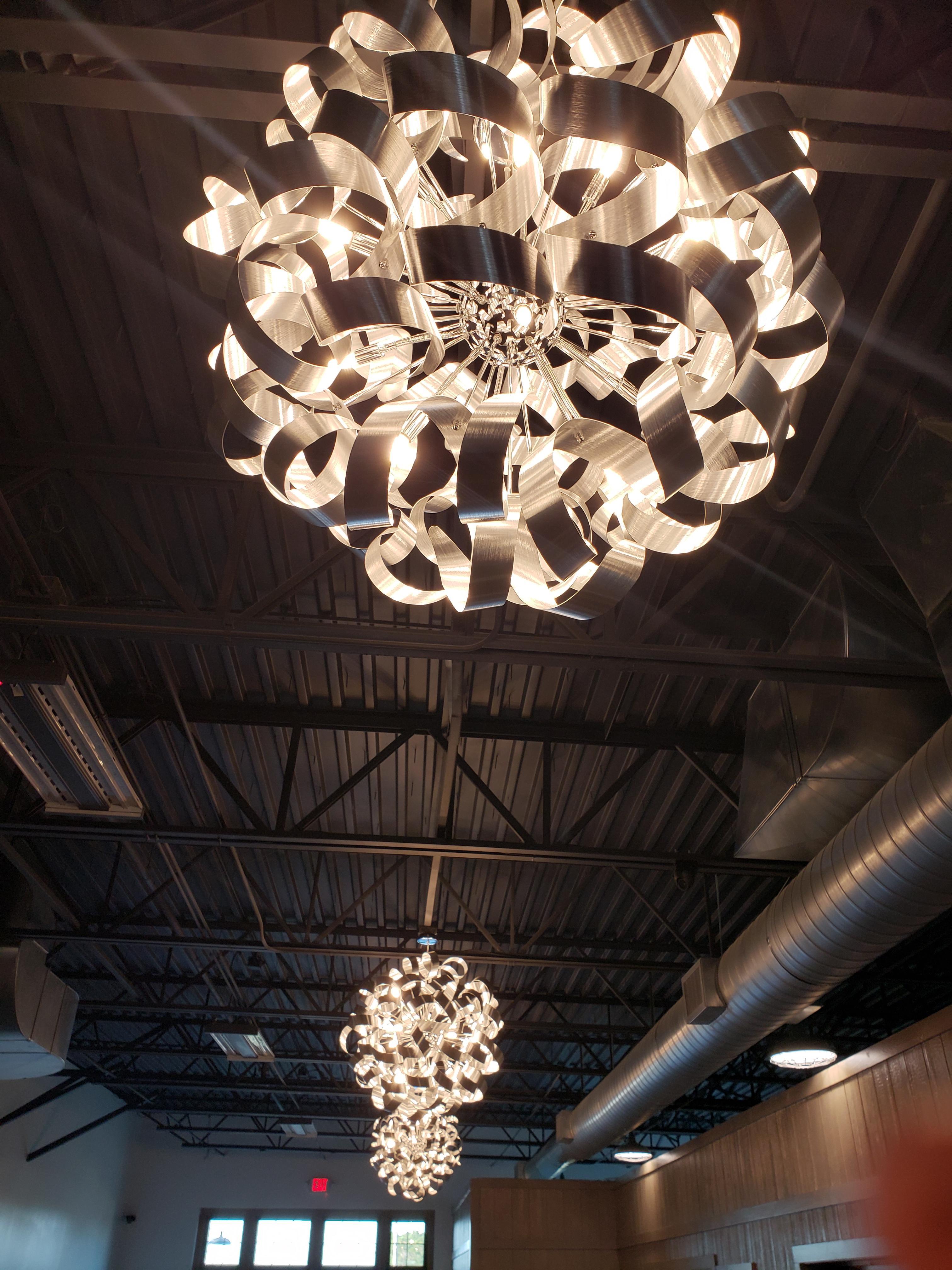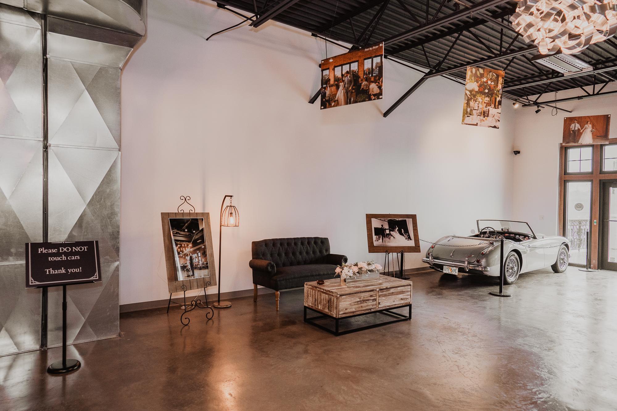 -Outdoor terrace access -Fogged garage door backdrops -Oversized sliding barn door opening views into The Classic room -Convenient to our caterers’ kitchen and bridal suite -Whimsical metal chandeliers -Lounge seating -Classic cars on display