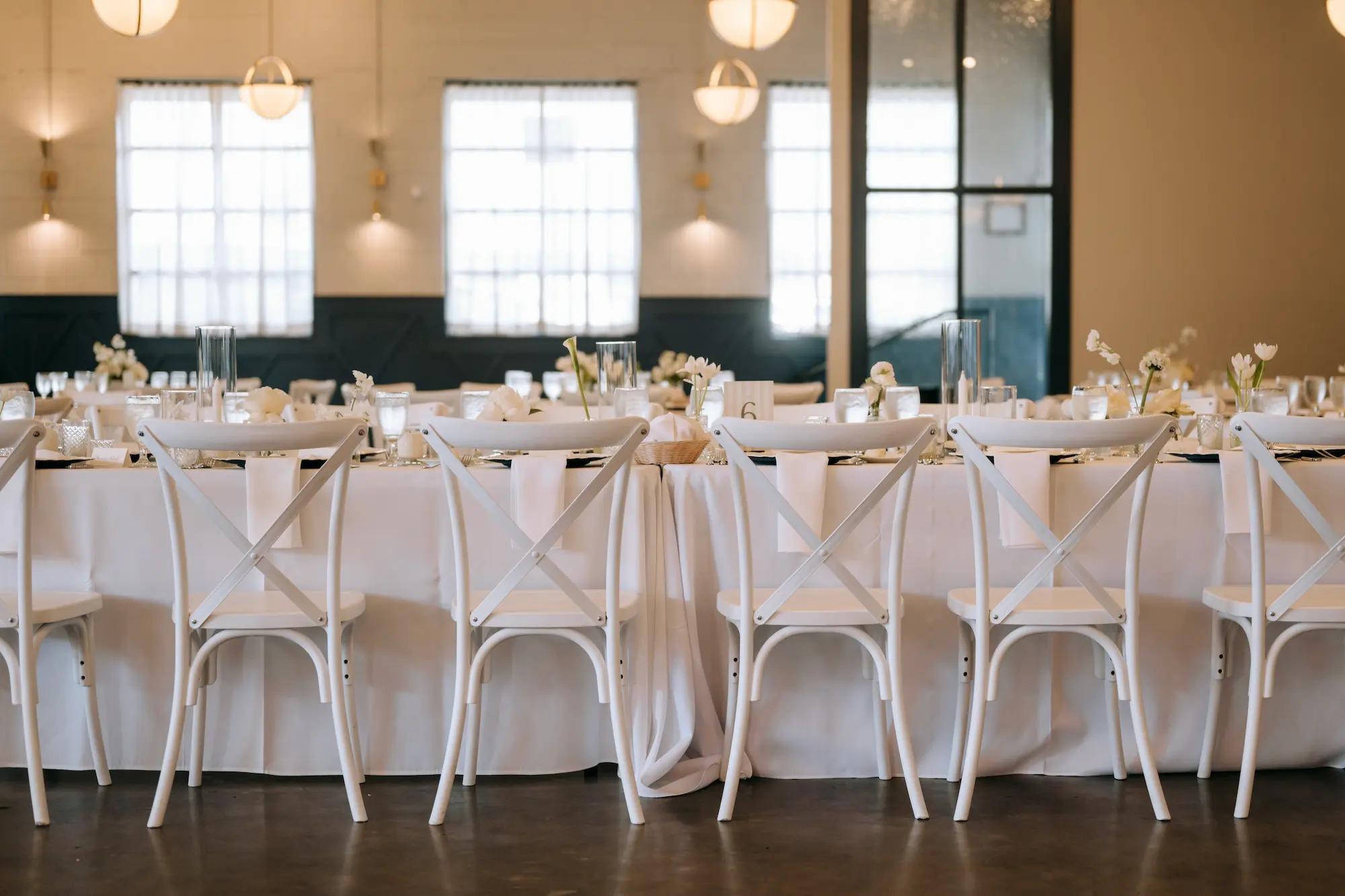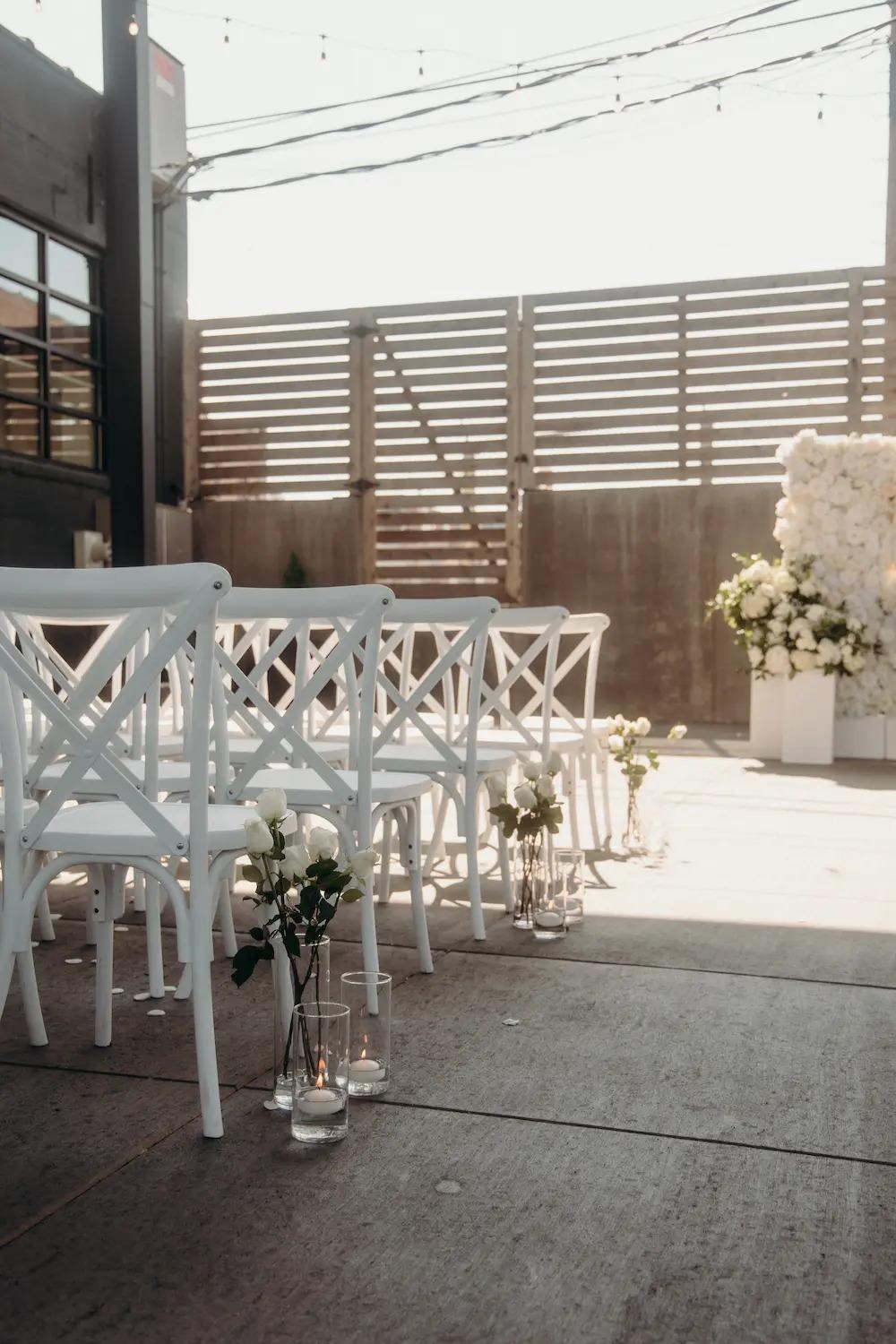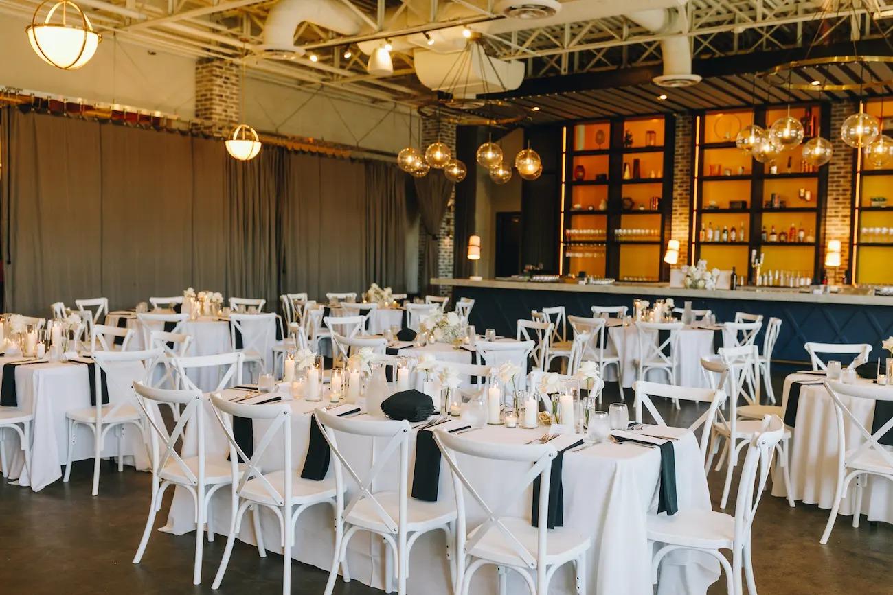 The Austin offers a unique blend of modern industrial style and polished design across its indoor and outdoor spaces, accommodating both ceremonies and receptions. • Main Reception Hall: This grand, open space features high ceilings with exposed ductwork and white metal trusses, giving it a modern industrial feel. The contrast of exposed brick walls with elegant, white paneled walls and the dramatic globe pendant lighting creates an atmosphere that is both sophisticated and inviting. The hall can be set up with elegant cross-back chairs and long or round tables for a beautiful seated reception or a vibrant dance floor. • Outdoor Event Space: Our dedicated outdoor area is the perfect spot for your ceremony or a cocktail hour. It features a sleek, covered patio with festoon specialty lighting overhead, framed by modern slatted wooden privacy walls. This area is easily transformed with floral arrangements and seating to create a stunning, airy space for your vows.