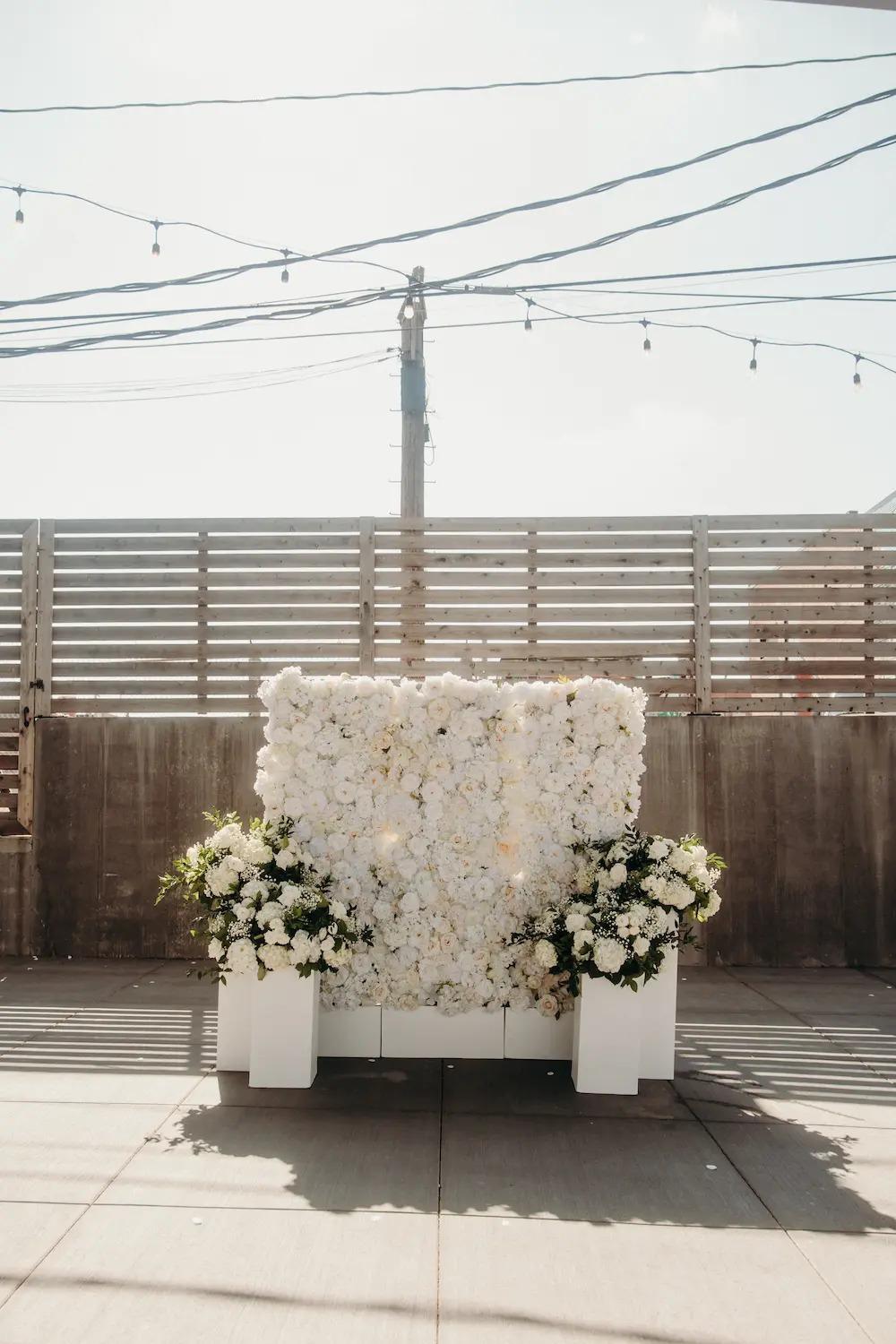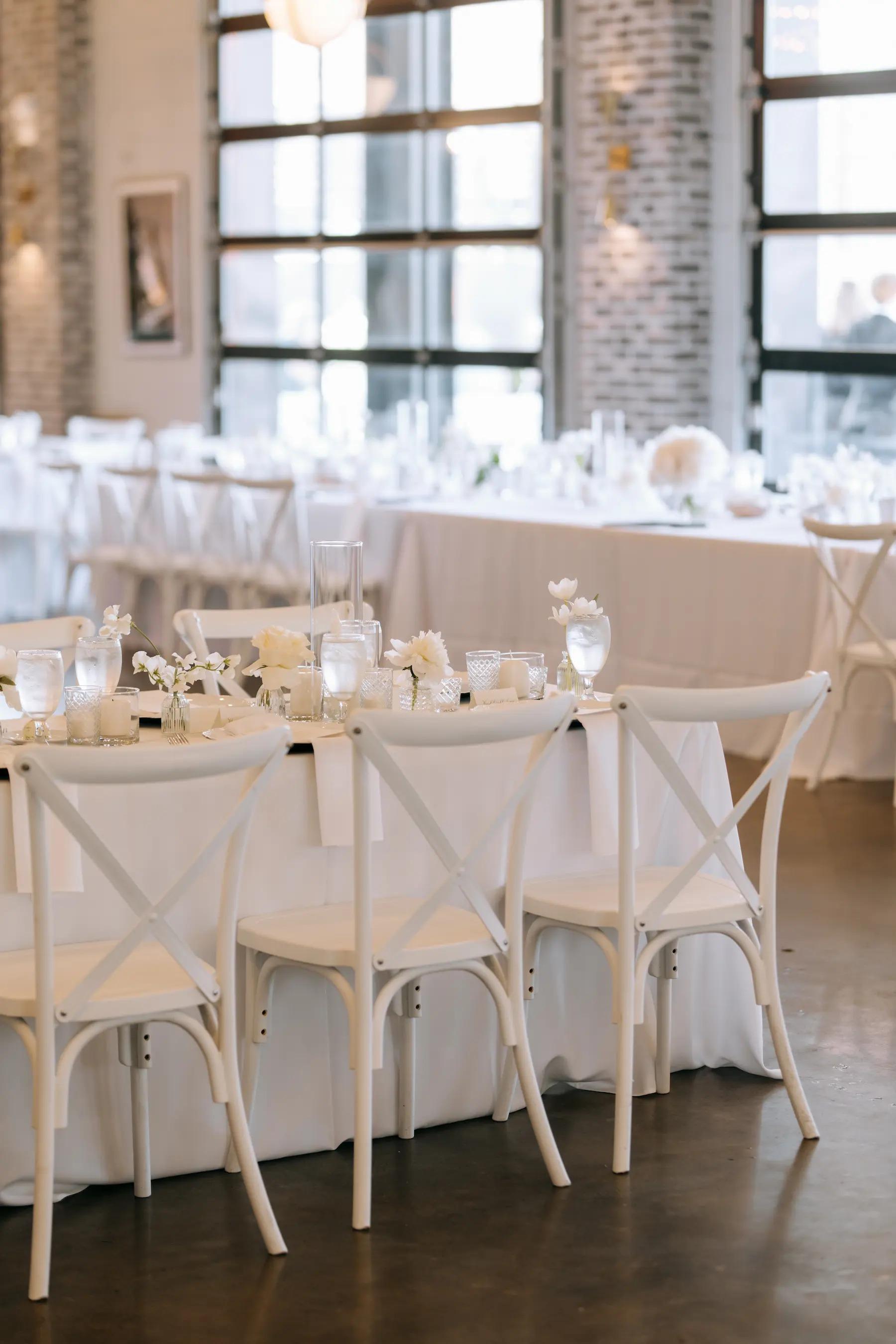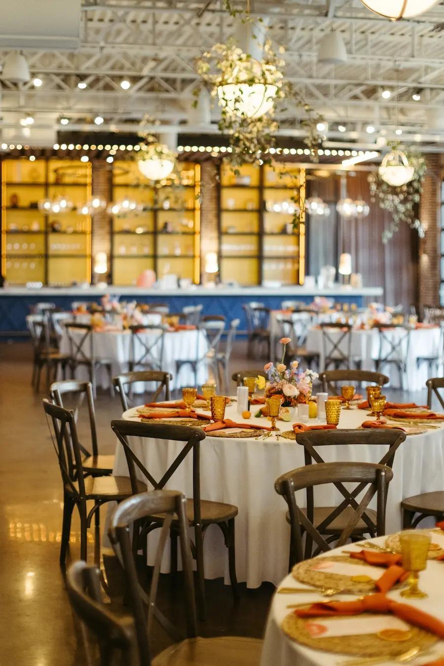 The Austin offers a unique blend of modern industrial style and polished design across its indoor and outdoor spaces, accommodating both ceremonies and receptions. • Main Reception Hall: This grand, open space features high ceilings with exposed ductwork and white metal trusses, giving it a modern industrial feel. The contrast of exposed brick walls with elegant, white paneled walls and the dramatic globe pendant lighting creates an atmosphere that is both sophisticated and inviting. The hall can be set up with elegant cross-back chairs and long or round tables for a beautiful seated reception or a vibrant dance floor. • Outdoor Event Space: Our dedicated outdoor area is the perfect spot for your ceremony or a cocktail hour. It features a sleek, covered patio with festoon specialty lighting overhead, framed by modern slatted wooden privacy walls. This area is easily transformed with floral arrangements and seating to create a stunning, airy space for your vows.