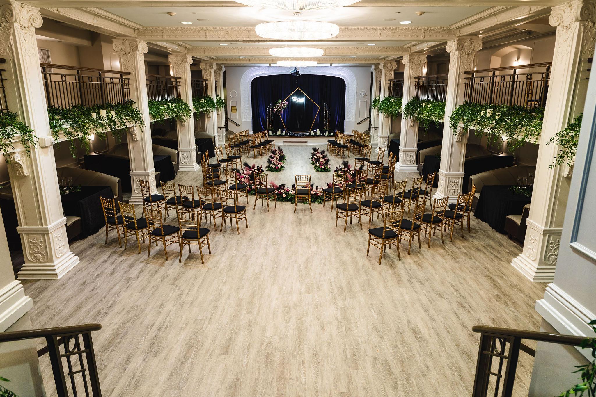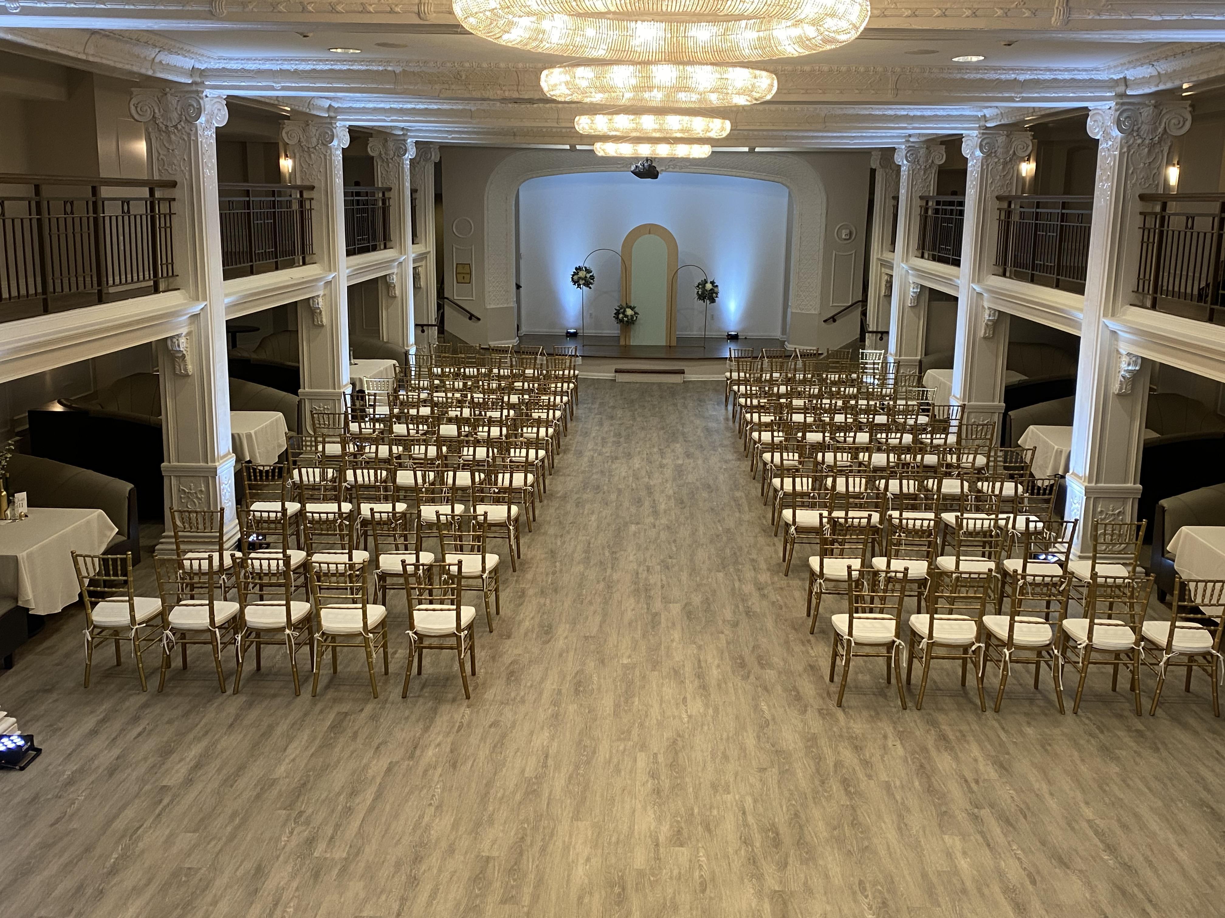The Ballroom is a classic 1920's space complete with ornate details in the architecture. Cozy booths create unique and memorable seating options for guests. Double doors and a grand stair case make for magical grand entrance into the reception!