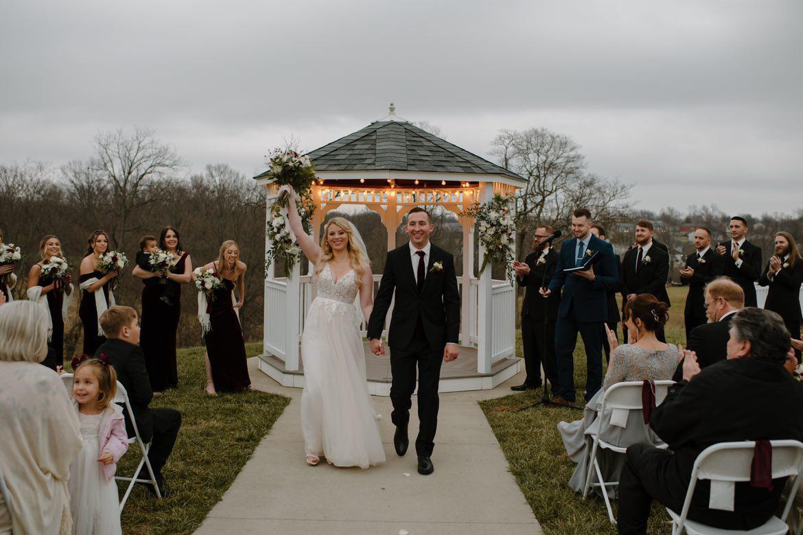 Our barn wedding venue gives off a rustic feel but includes all of the modern features you love. Vaulted ceilings and bright windows give an airy feel to the room, while a crystal chandelier and luxurious silks draped from the ceiling elevate the space. Nestled on rolling hills of Kentucky bluegrass, the outside is just as breathtaking as the interior. Intimate areas, like a footbridge, gazebo, and wrap-around porch, are scattered around the property to give you space for a private moment with your loved one or stunning photos opportunities.