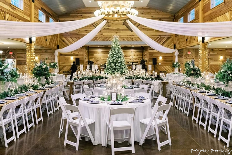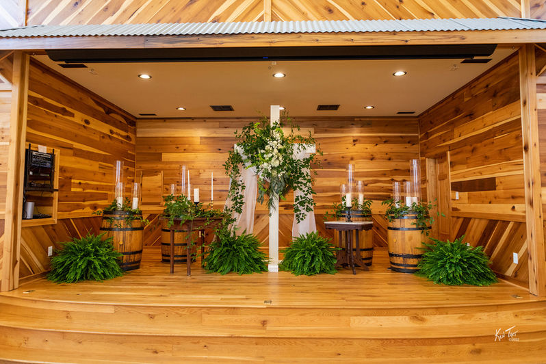 Projector system Dimmable lights Tables and chairs for up to 300 guests Decorative barrels Moveable arbor