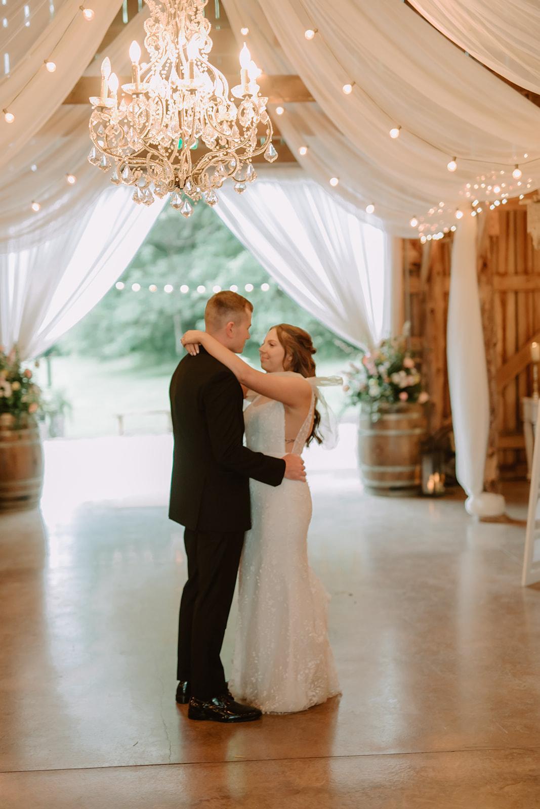 Our antique barn blends rustic charm with elegant touches, featuring twinkle lights, a grand chandelier, and wide barn doors that open to sweeping views of the surrounding meadow. Climate-controlled for comfort year-round, the barn can host both ceremonies and receptions in one space. With ample room for dining, dancing, and celebrating, it offers the perfect backdrop for a relaxed yet unforgettable wedding day.